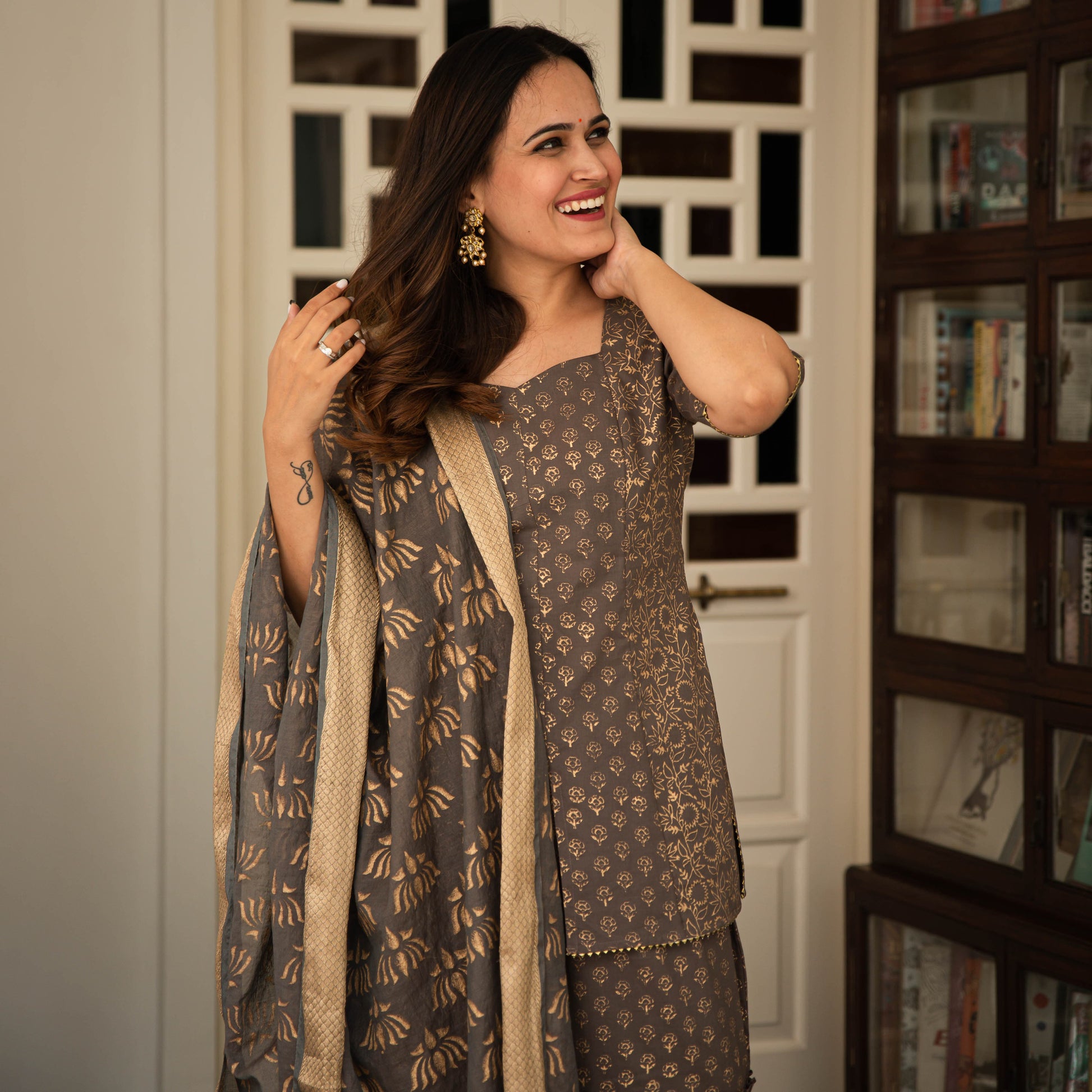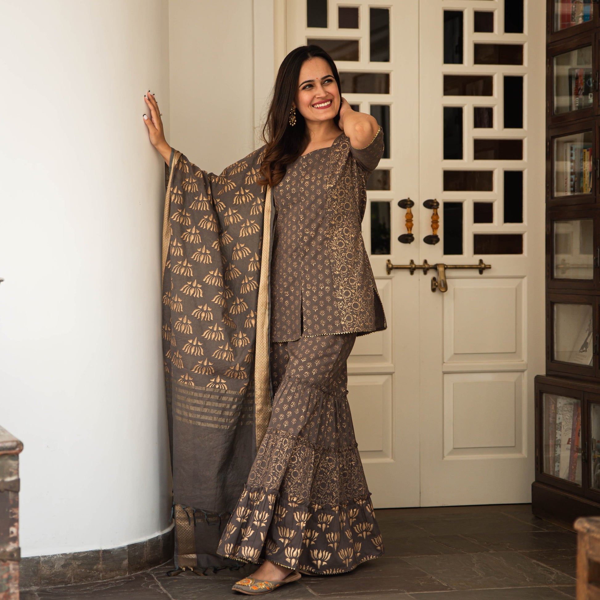 Look stunning and charming in this beautiful grey suit set. With exquisite gold detailing, this suit set will be your comfy yet stylish bestie for the festive season!