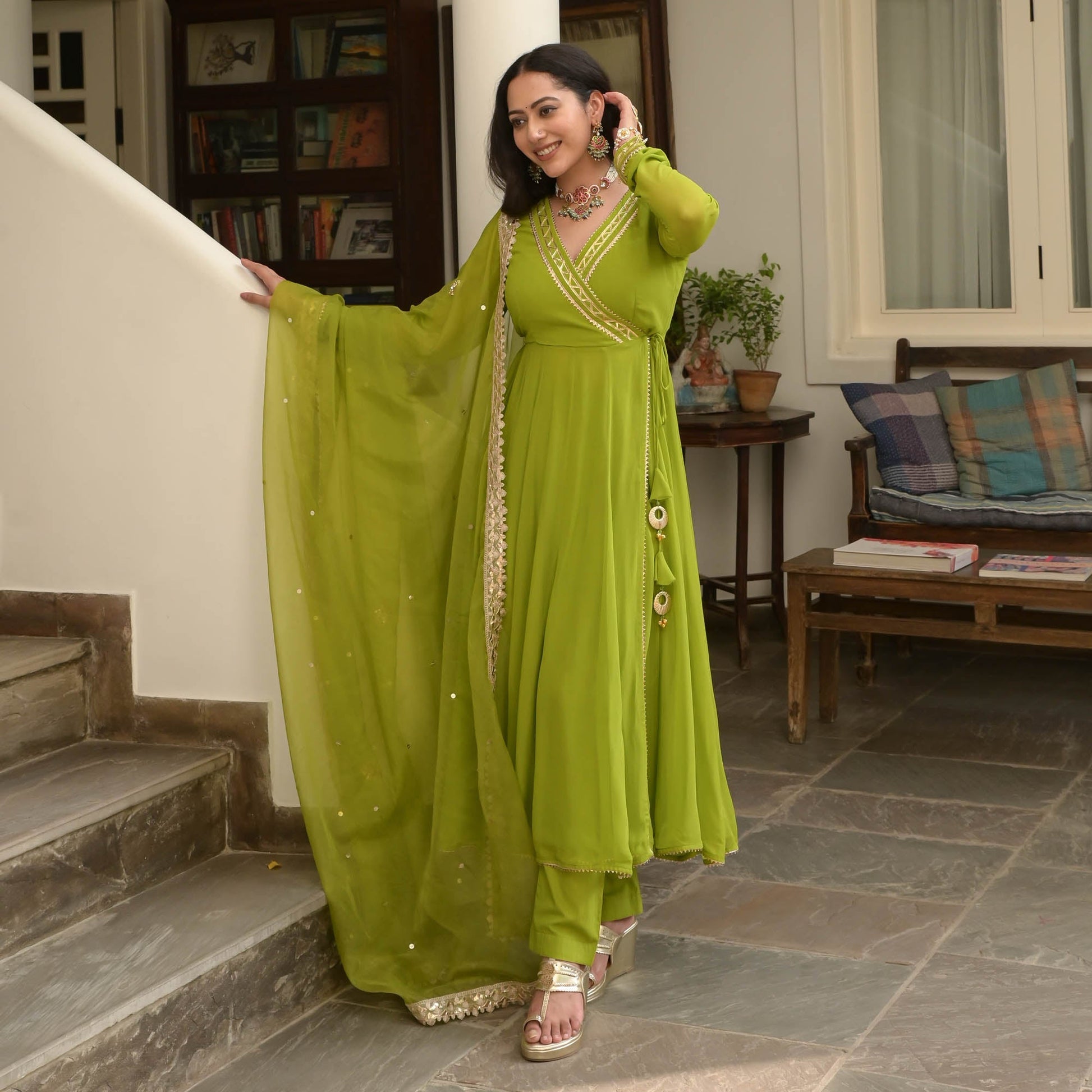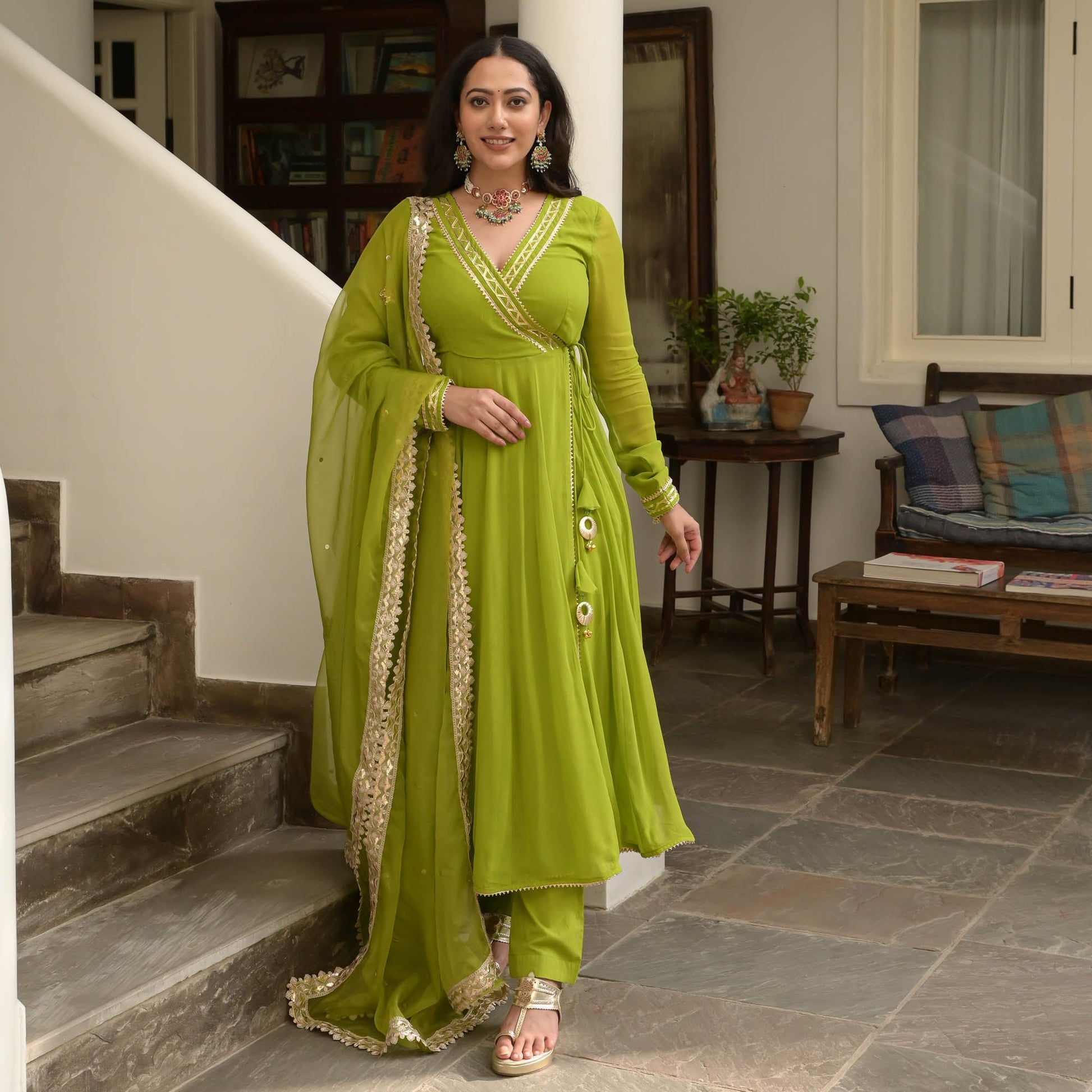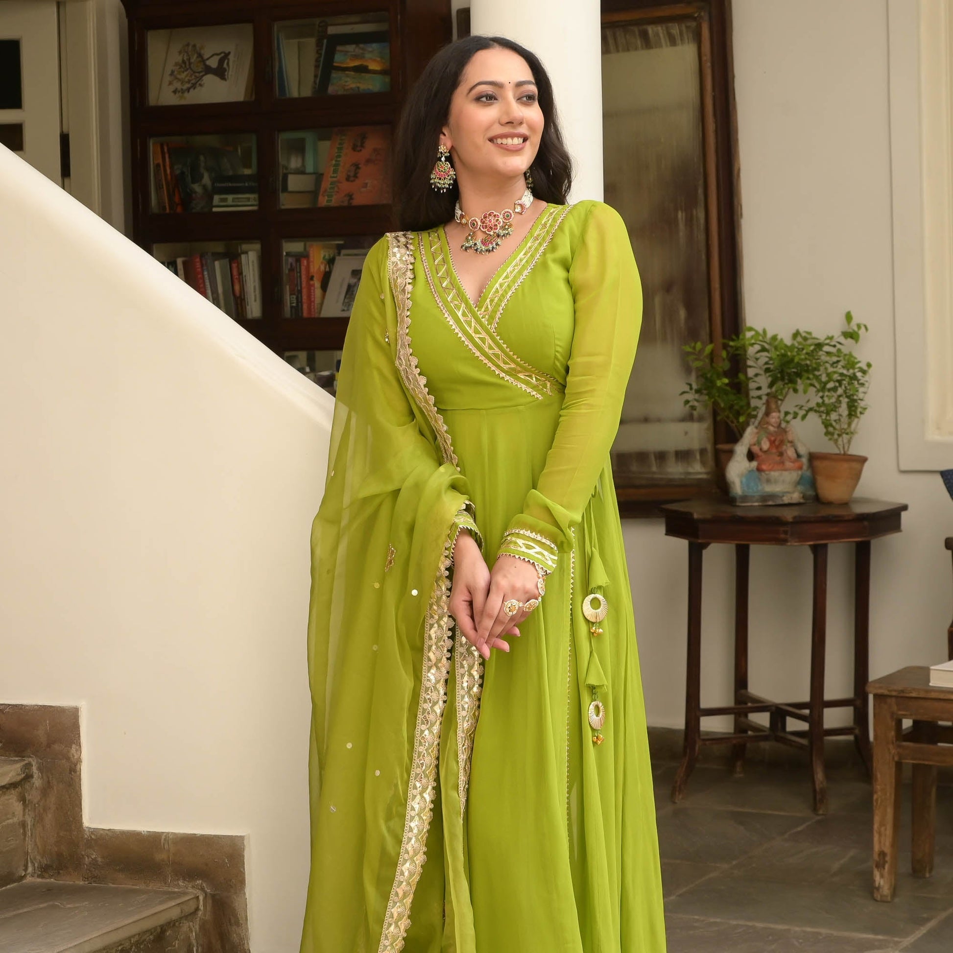 Elevate your ethnic style with our Maithali Suit Set. Crafted from luxurious green georgette fabric, this ensemble is a perfect blend of grace and glamour. It features exquisite cut-dana, sequin, and gotta work that adds a touch of opulence, while the surplice neckline adds a modern twist.