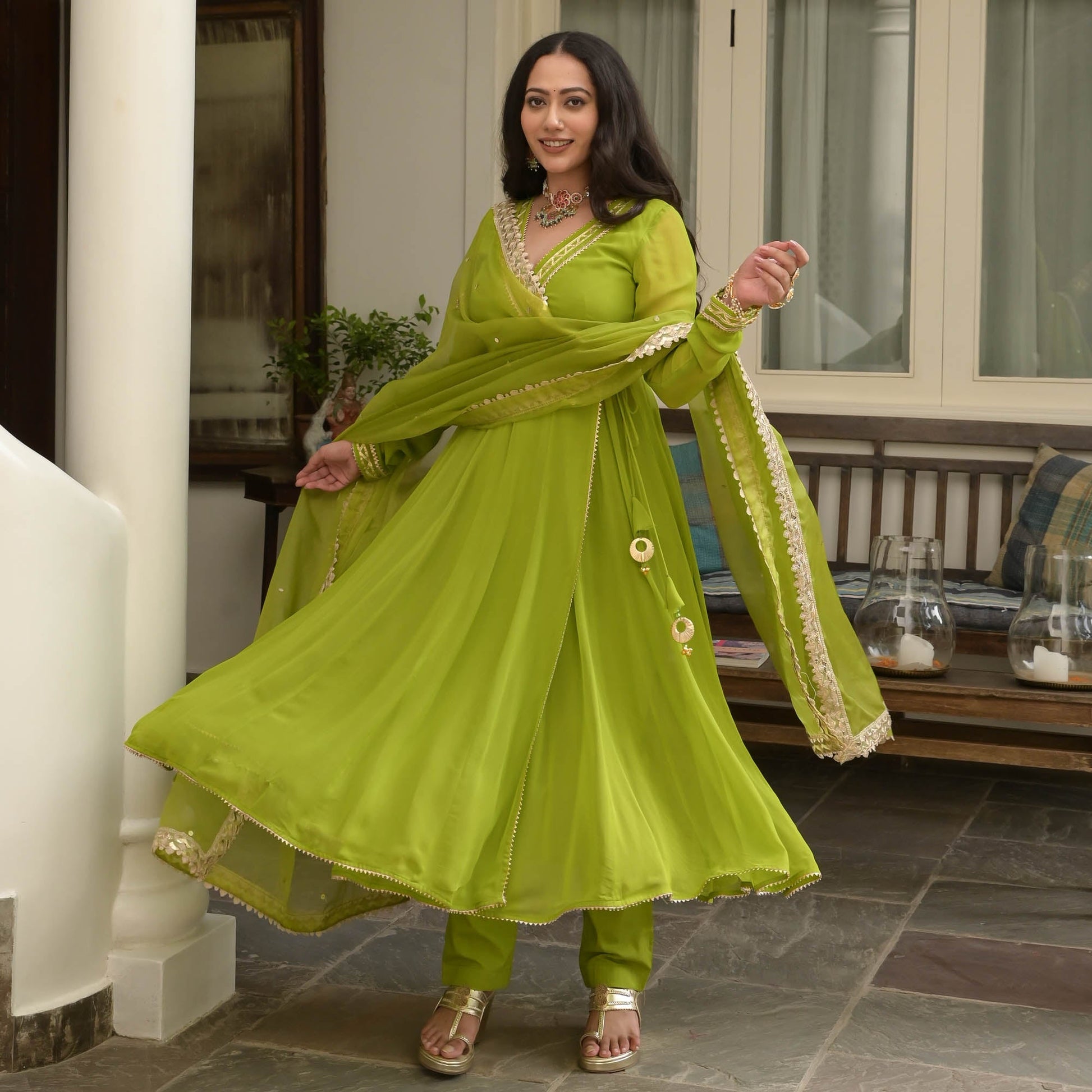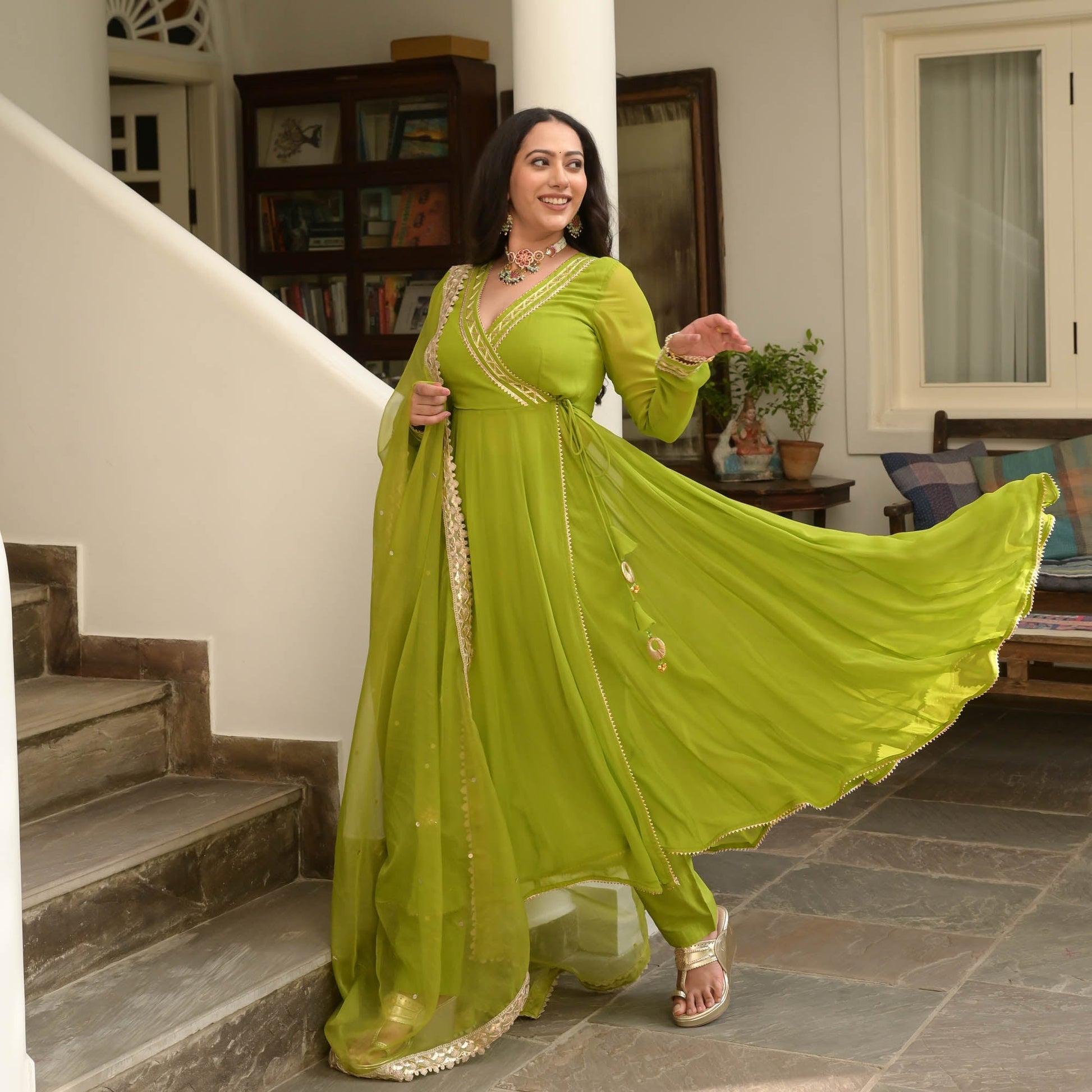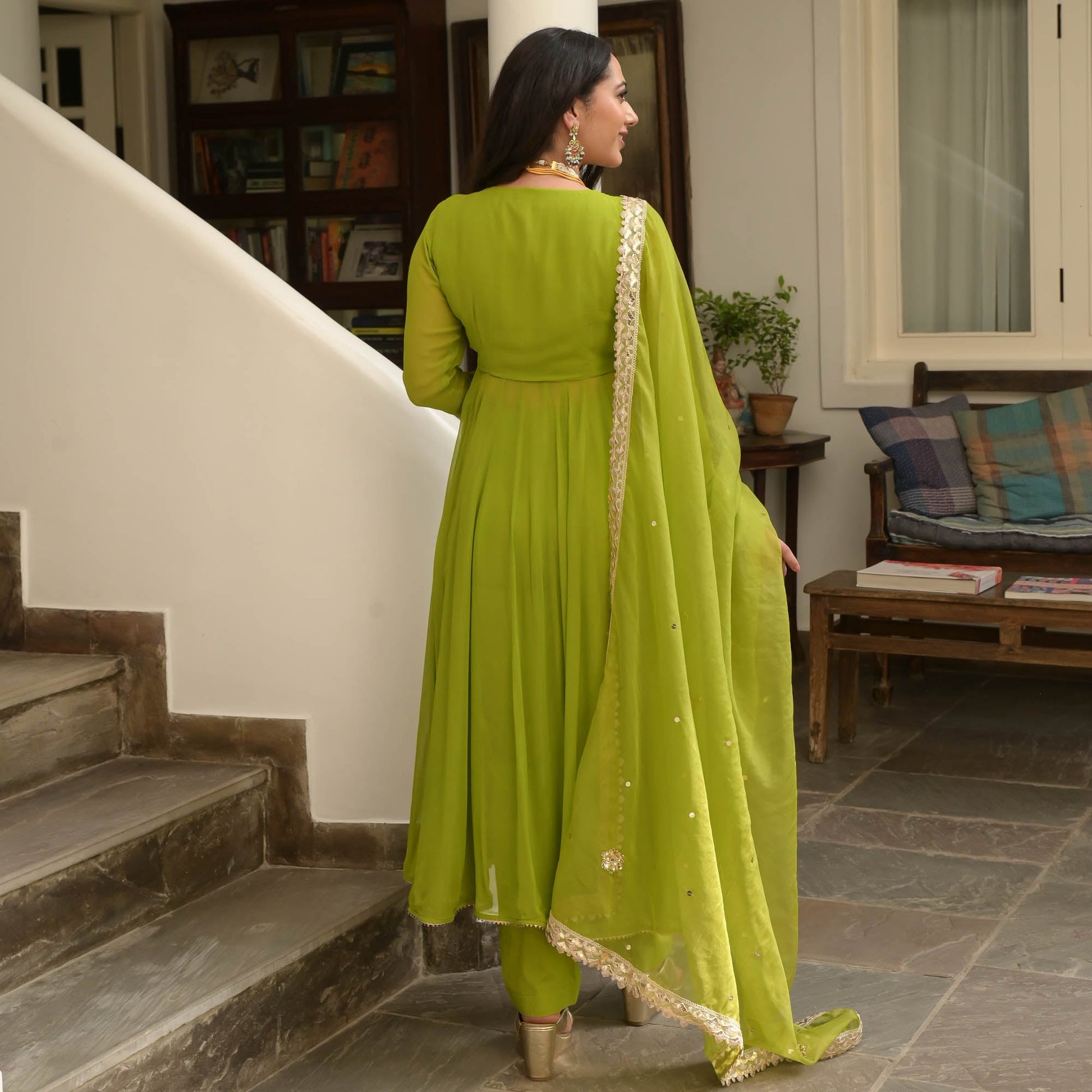 Elevate your ethnic style with our Maithali Suit Set. Crafted from luxurious green georgette fabric, this ensemble is a perfect blend of grace and glamour. It features exquisite cut-dana, sequin, and gotta work that adds a touch of opulence, while the surplice neckline adds a modern twist.