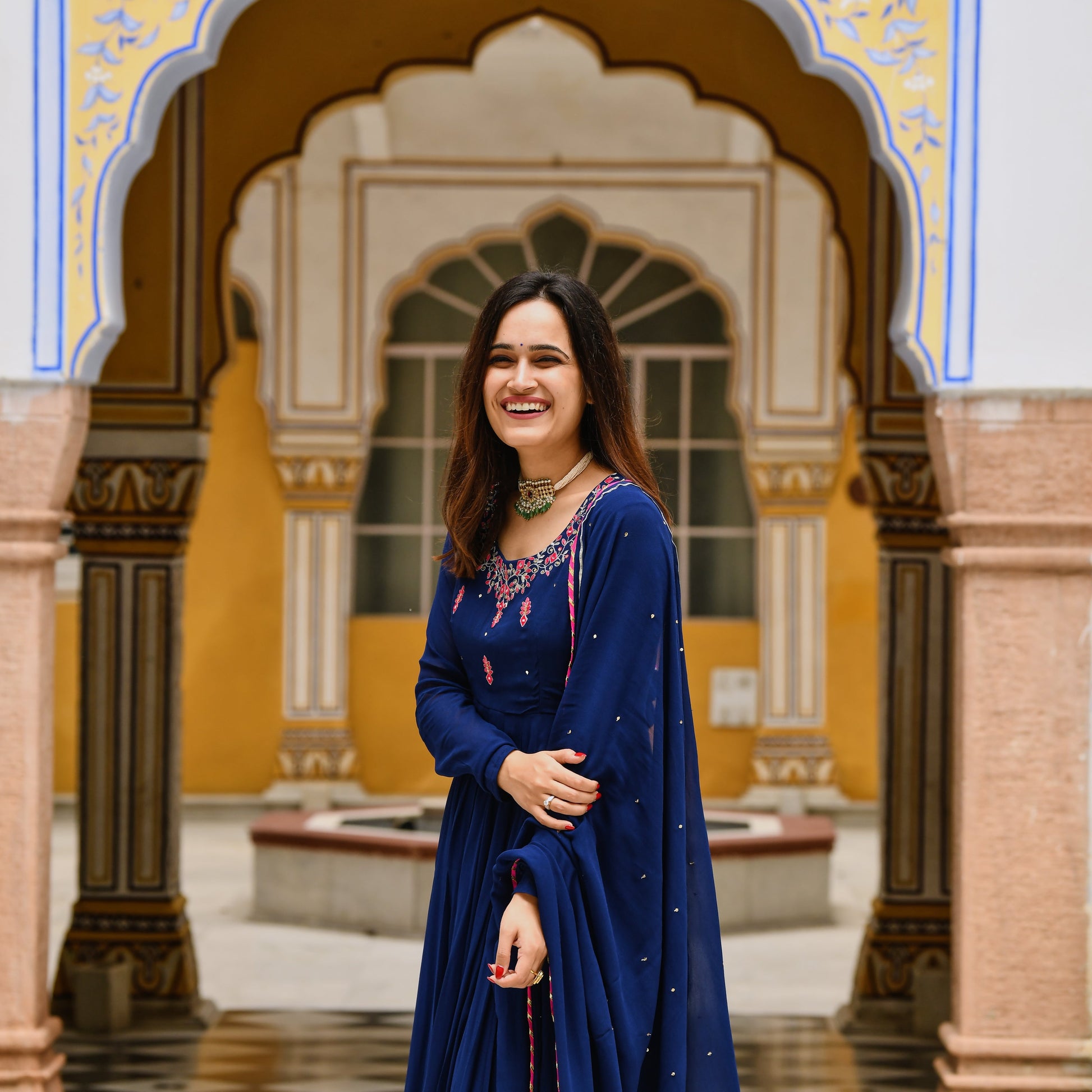 This Maryan Suit Set is designed to bring out your regality. The deep blue colour of the georgette fabric is complemented by the striking red embroidery work, which is intricately designed and adds a touch of glamour to the outfit. The full sleeves of the dress give it a regal and traditional look, while the straight pants offer a comfortable and stylish bottom. The high-quality georgette fabric is soft, and lightweight, and drapes beautifully, making you feel elegant and sophisticated.