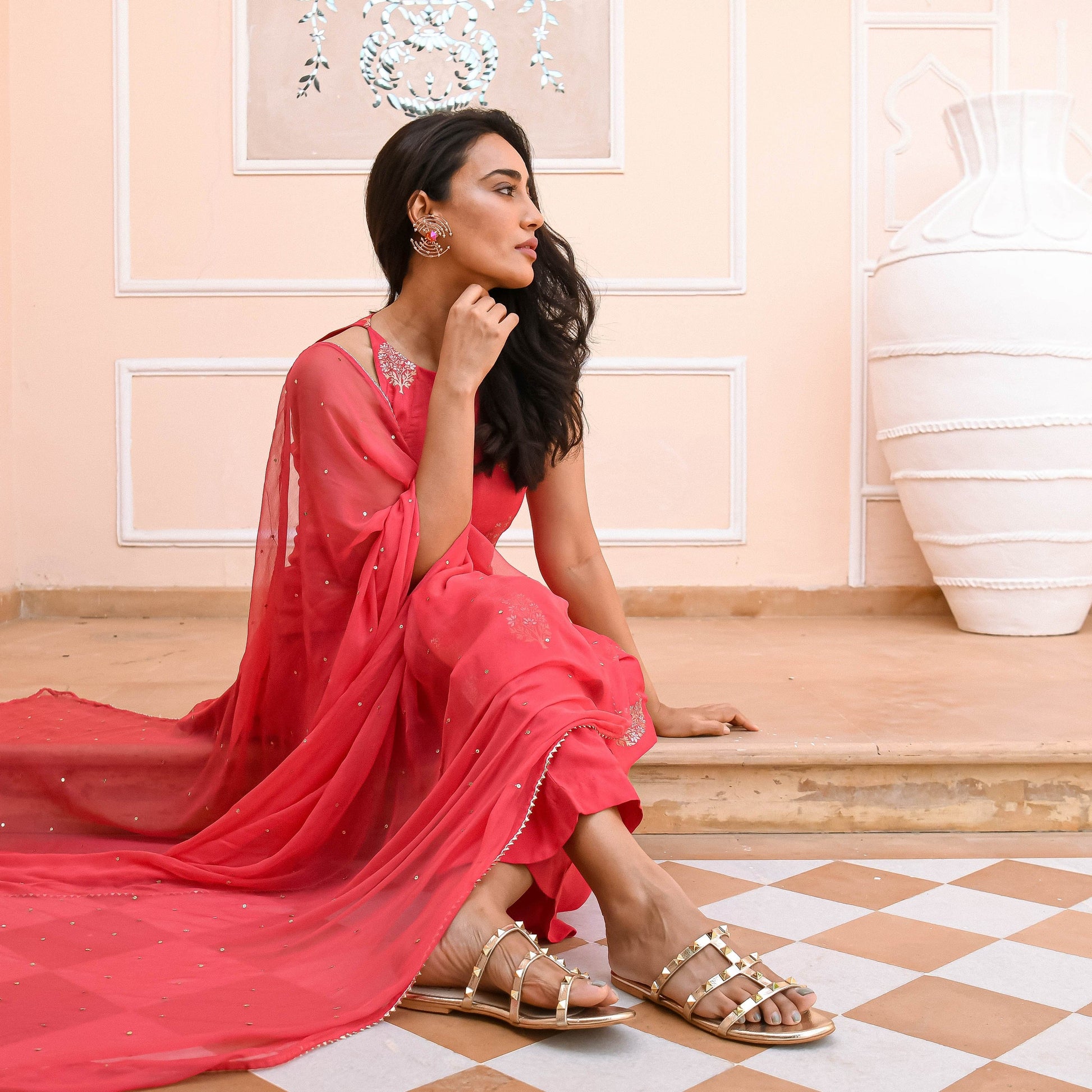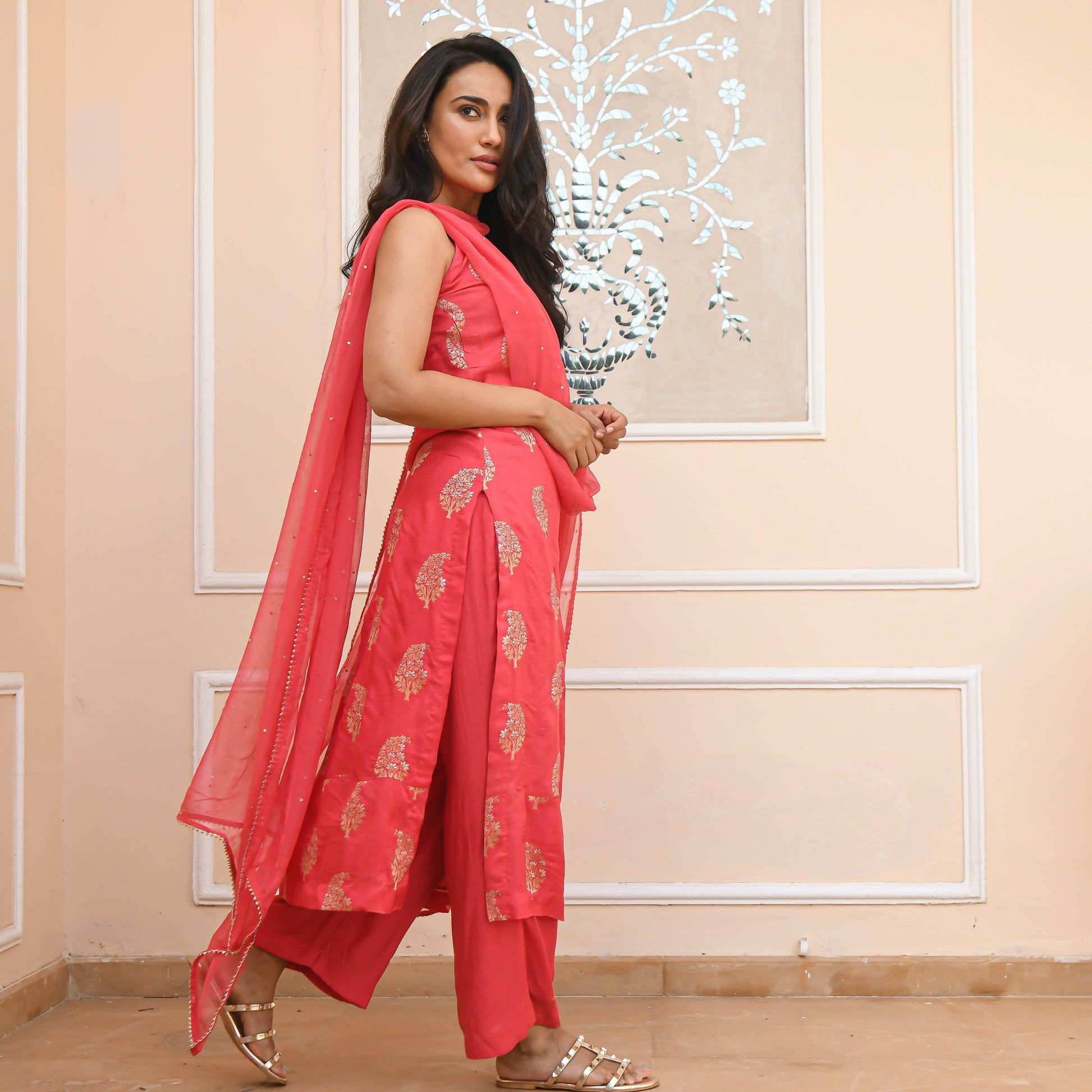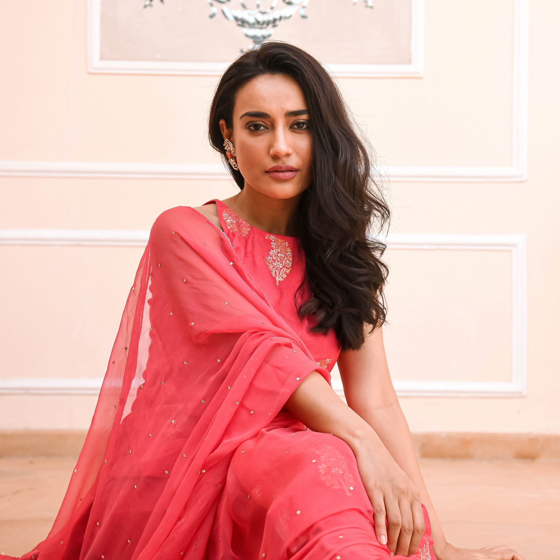 A stunning pick to don for any occasion, the Mayukhi Suit Set is an absolute stunner. With bright hues and chic detailing, this suit set is a wardrobe essential. Celebrating the heritage crafts, this ensemble comes with featherlight Chiffon Dupatta.