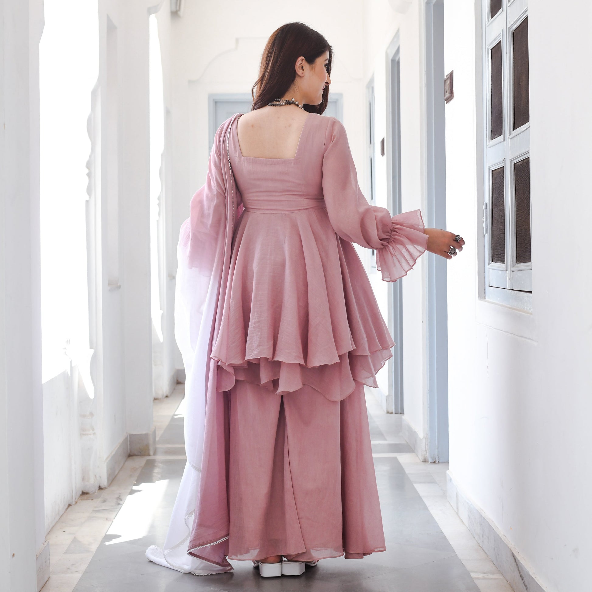 Introducing our Merin Suit Set, a breathtaking fusion of traditional elegance and modern sophistication. The mulmul fabric of the Set keeps you comfortable throughout the day and the rose pink colour exudes a subtle and romantic charm, making it an ideal choice for a wedding, a formal dinner party, or any special occasion. The dupatta adds a touch of grace and elegance, perfectly complementing the intricate floral lace details on the sharara. The square neckline, asymmetric hem and unique sleeves also give this piece a distinctive look. This Suit Set is sure to make you feel like a queen.