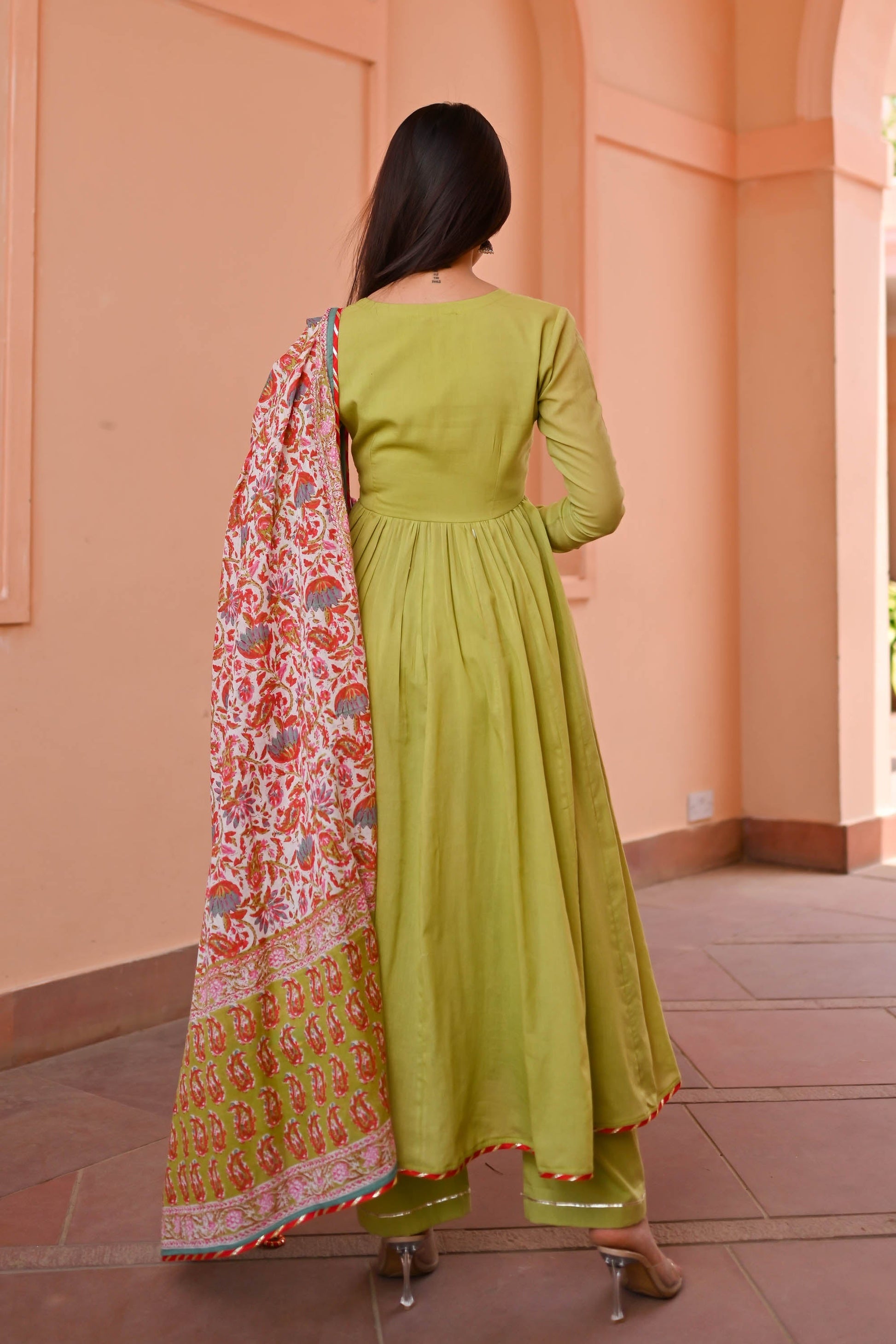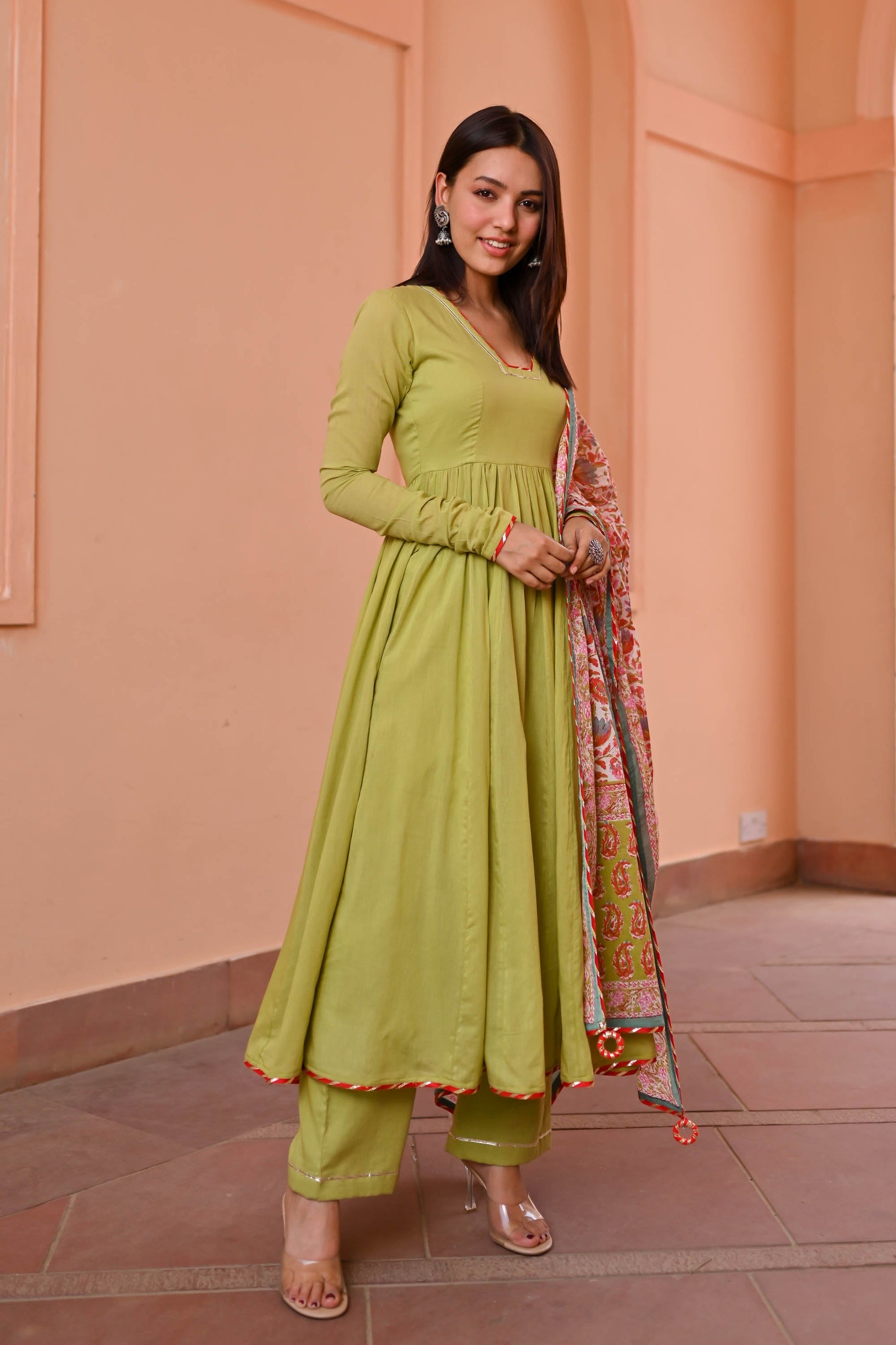 Embrace sophistication with the Mishka Trio Cotton Suit Set. Meticulously tailored from deluxe cotton, its captivating green hues inspire allure. The flared kurta features a V-neck with lace detailing and pleated full sleeves, exuding elegance. Paired with coordinating pants and a printed dupatta featuring ethnic motifs, this ensemble epitomizes timeless charm for any occasion.