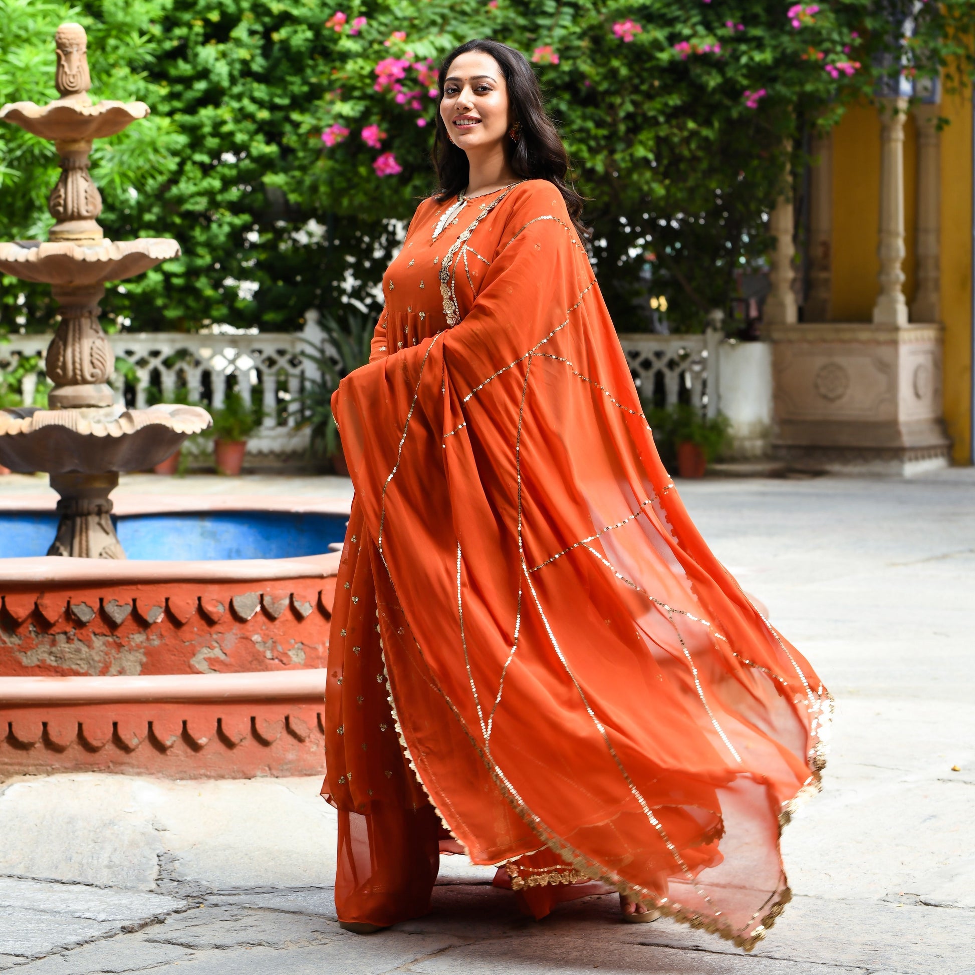 This beautiful set includes a long Nyra-cut sheer kurti with inner, sharara pants and a matching dupatta with gold work. The keyhole neckline, rich rust colour and all over gold design adds to its timeless beauty! Simply the best choice to rock this festive season!