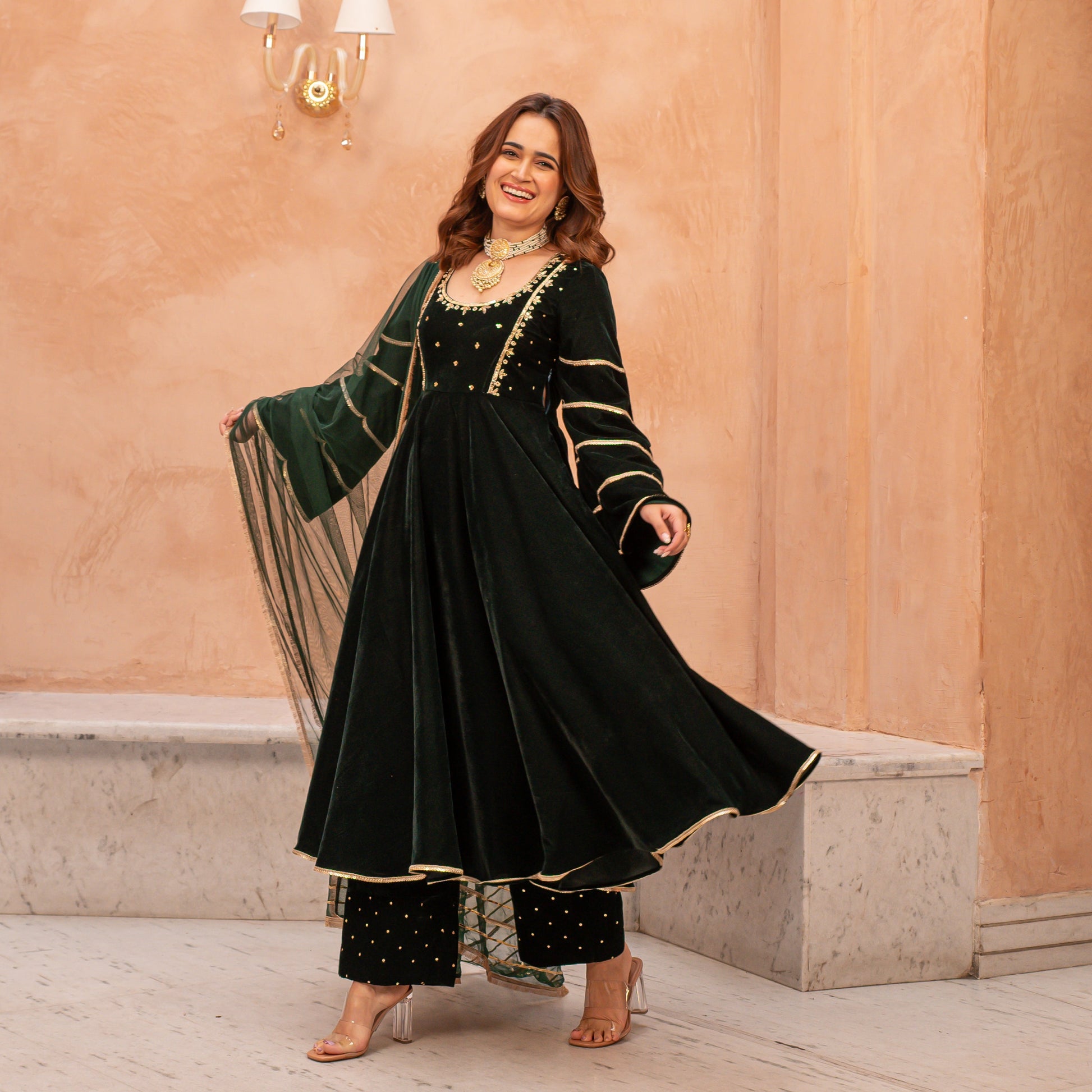 Elevate your wardrobe with our versatile Mumtaz Suit Set, suitable for formal occasions or a touch of opulence in festive wear. The bold hues of green are a canvas to impeccable craftsmanship of the embellished cut dana sequins and zari embroidery. Embrace the allure of flowy silhouettes, crafted from the most luxurious velvet fabrics, paired with matching pants, and sheer dupatta. Indulge in the chic versatility and add the cherry on top of your festivities.