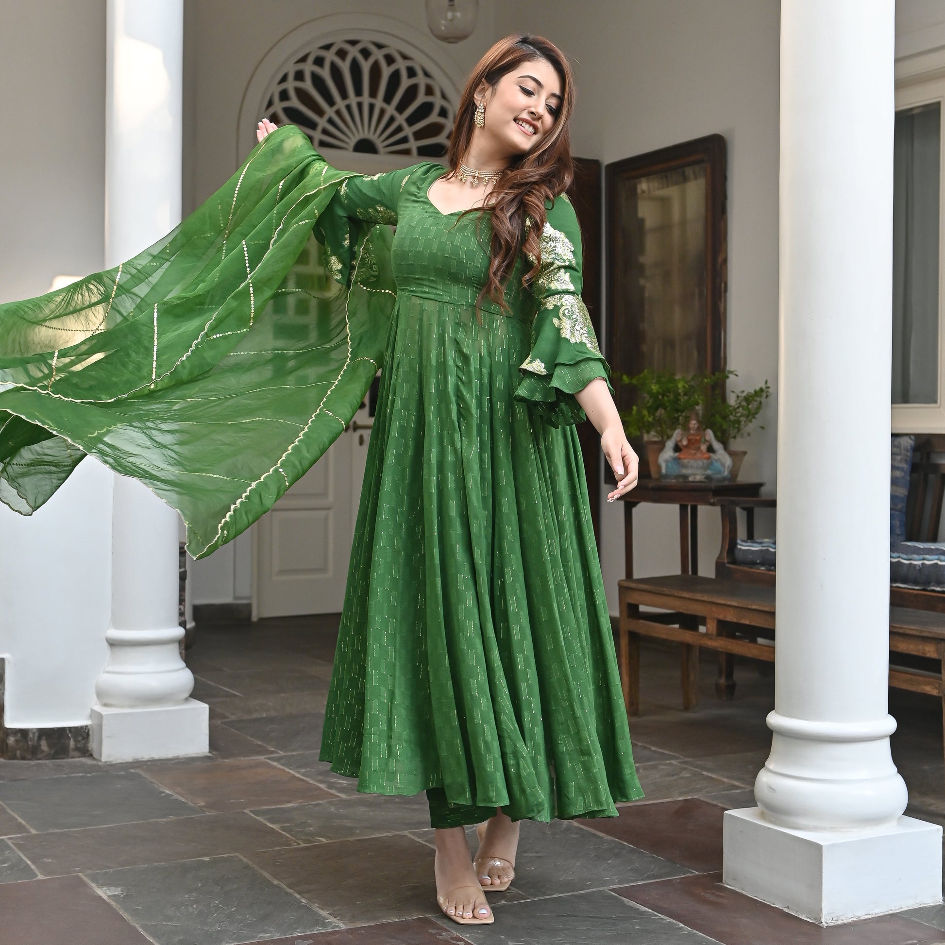 Get ready to slay the fashion game with our trendsetting Naziha Suit Set. The deep green jacquard fabric is a delight to the senses, with its intricate pattern and rich texture creating a stunning visual effect. This Set also features trendy bell sleeves that add a touch of modernity to the traditional silhouette. The scalloped edges of the organza dupatta are beautifully crafted with precision and are adorned with delicate embellishments that add an extra pop of sparkle to the overall look. With this unique and stylish ensemble, you're sure to make a lasting impression and leave a mark wherever you go.