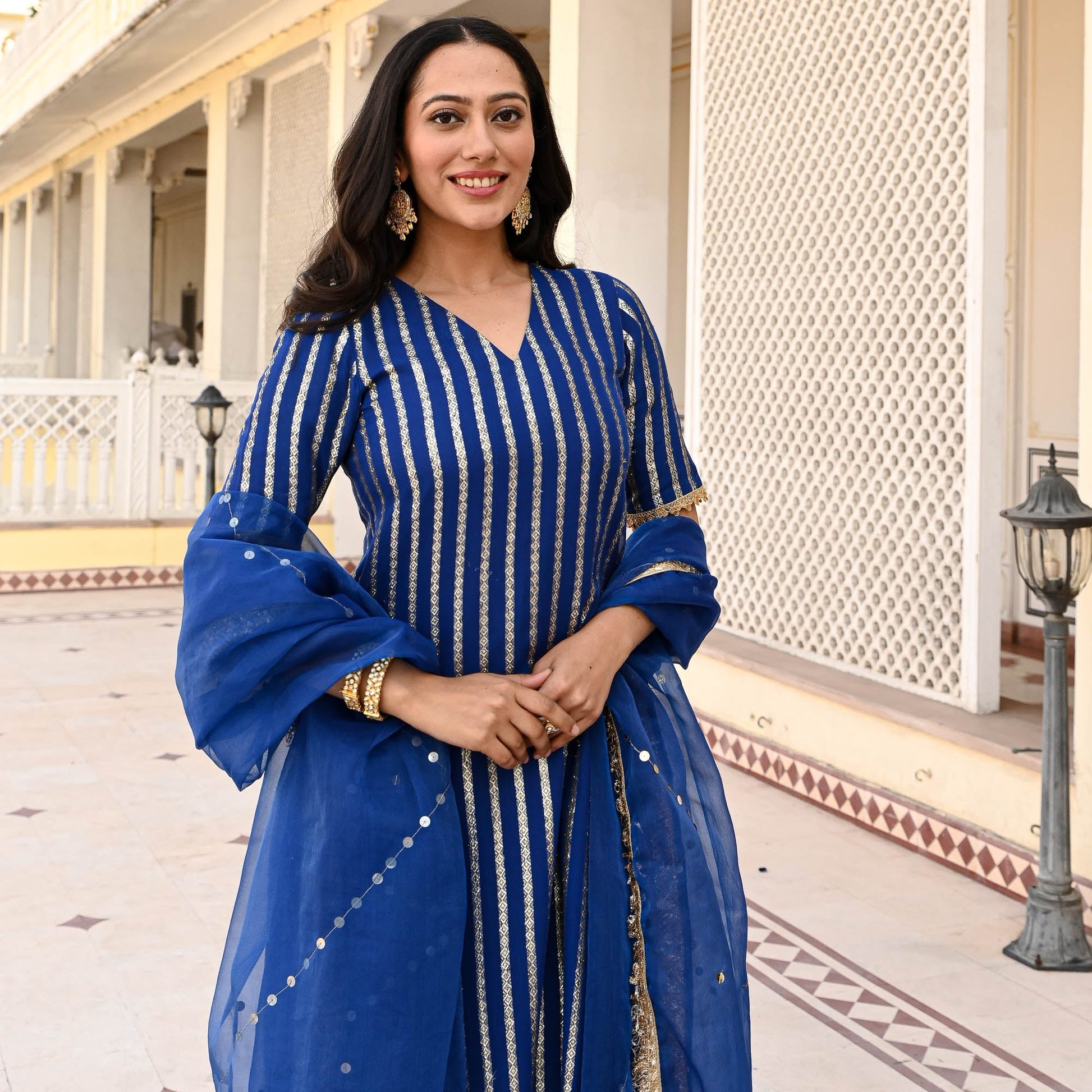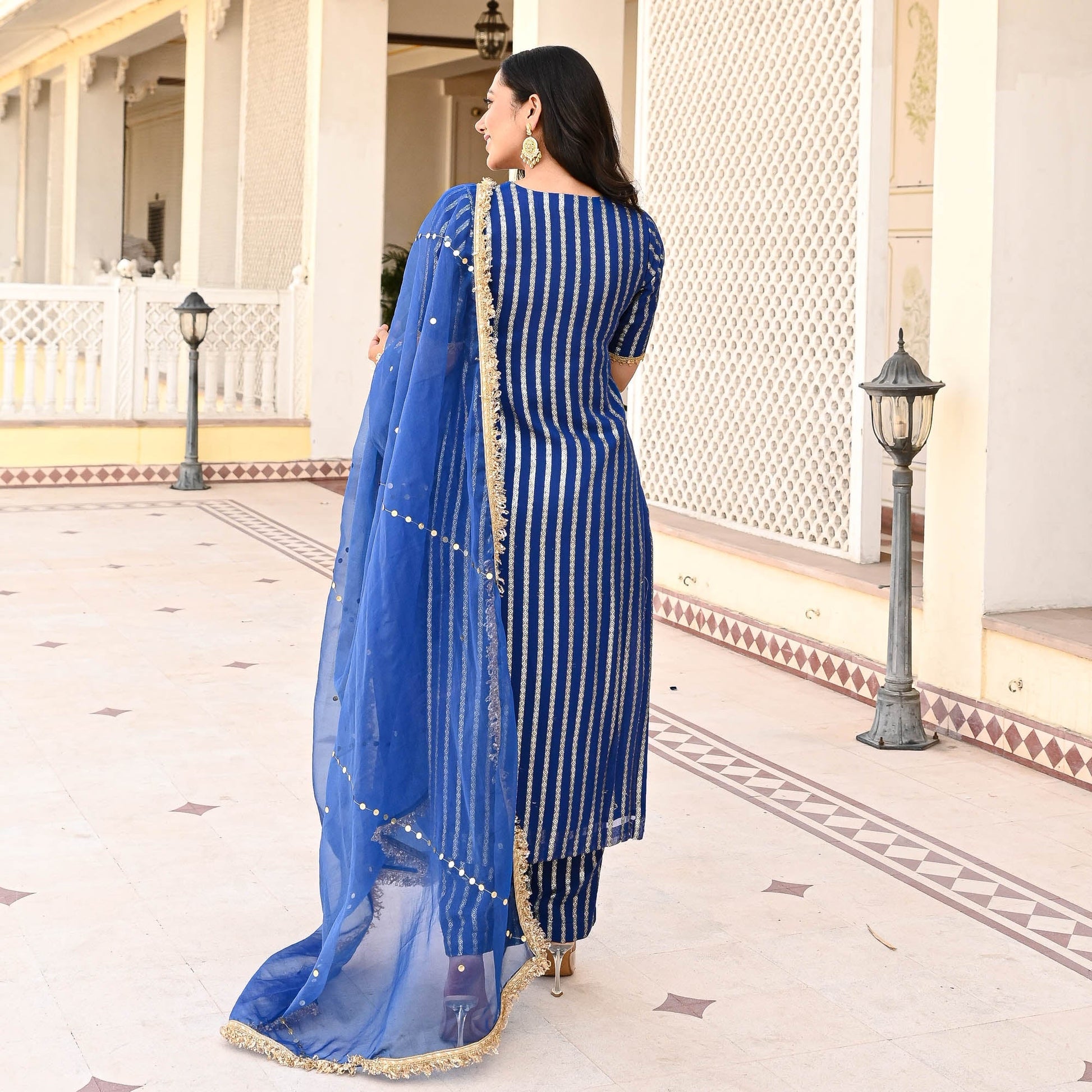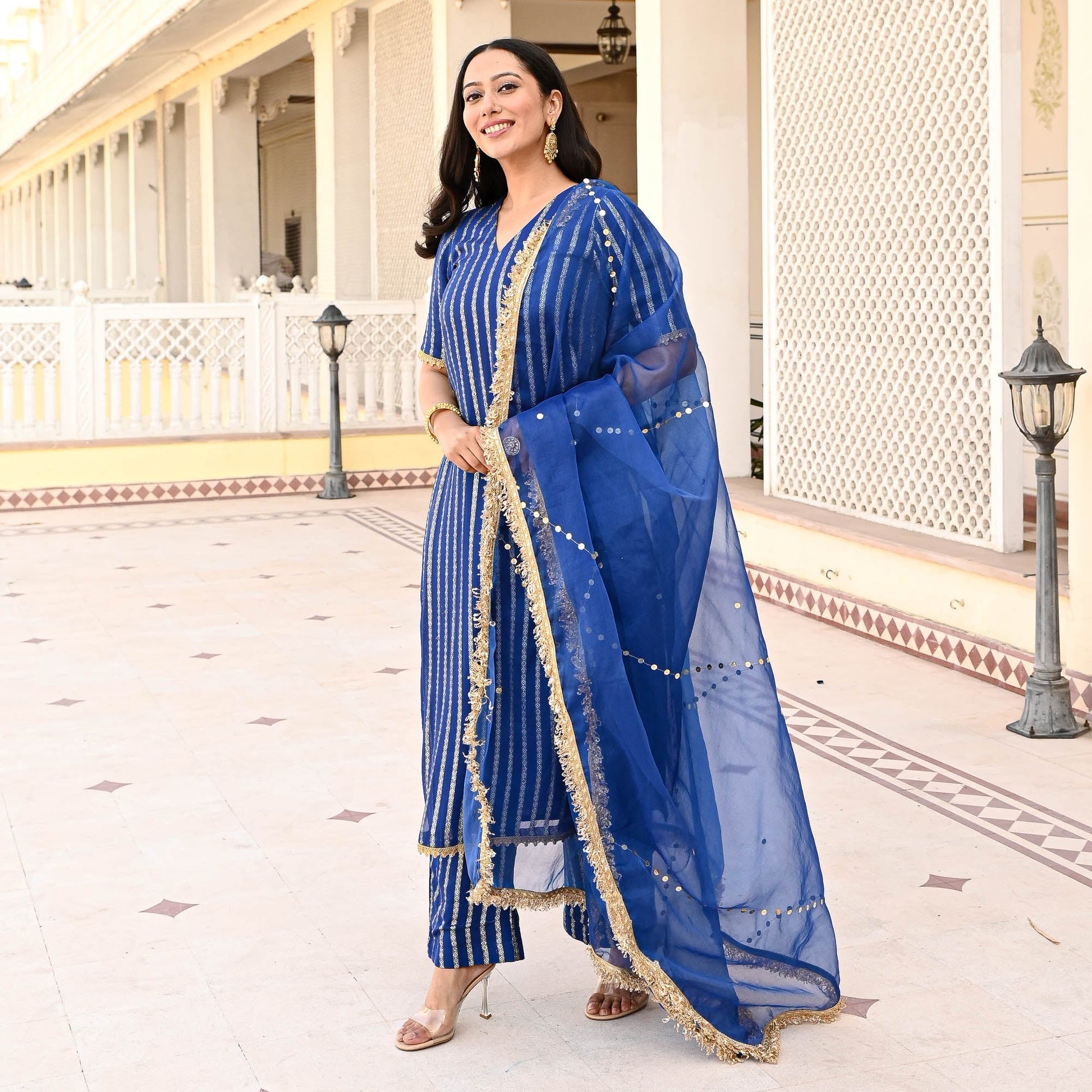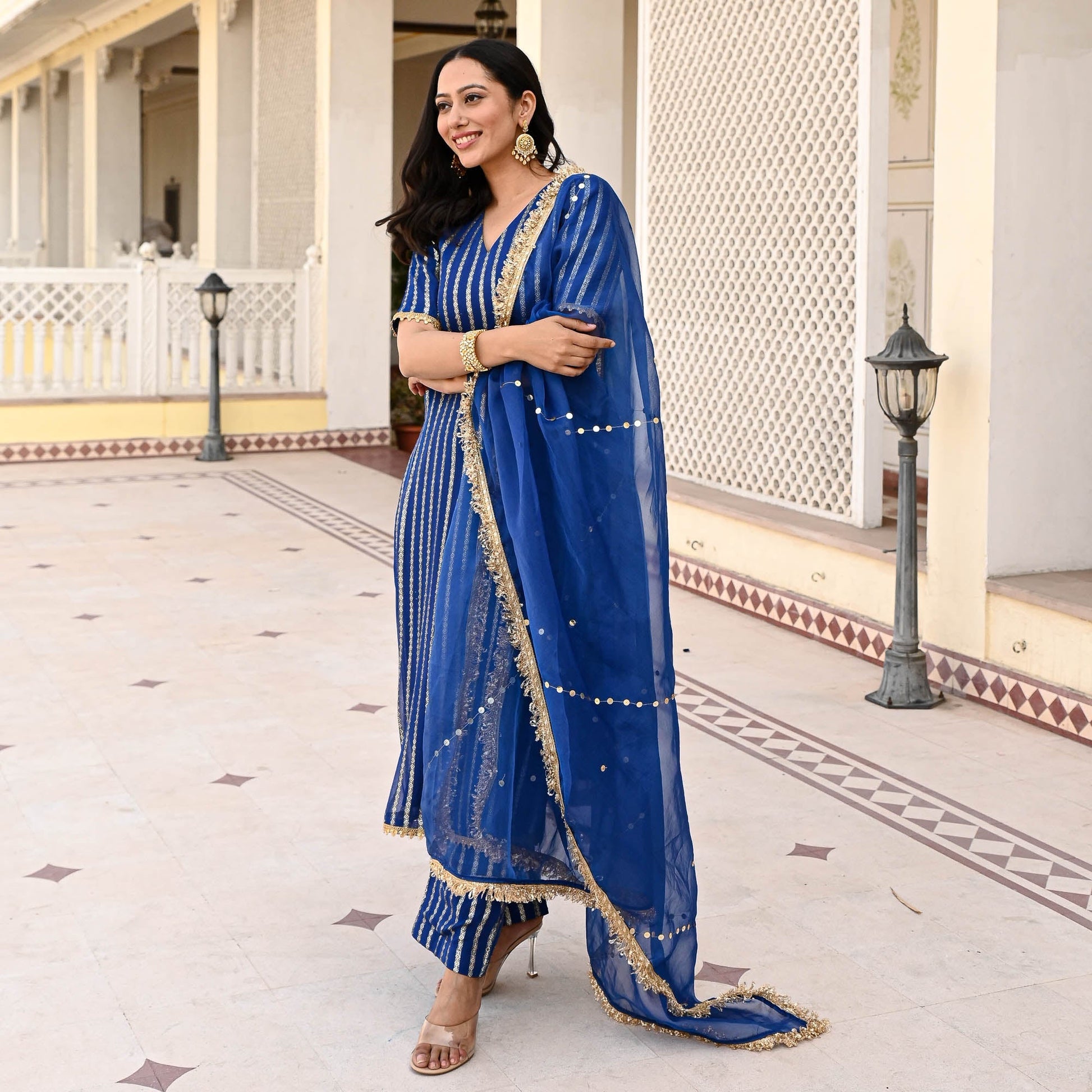 Embrace the vibrancy of the season with our Neil Suit Set, and shine bright wherever you go. Designed to accentuate your silhouette while allowing freedom of movement, this versatile co-ord set promises to make a statement wherever you go. Pair it with your favorite accessories to add your personal touch and step into the spotlight with confidence. The midnight blue color adds to the gorgeous charm of the ensemble. Indulge in the luxury of an opulent Jacquard that drapes beautifully, providing a flattering silhouette that complements every body type. The gorgeous straight-fit kurta is paired with matching pants, and an organza embellished dupatta with fringed lace edges. Experience the joy of wearing an ensemble that not only celebrates tradition but also celebrates your individuality.
