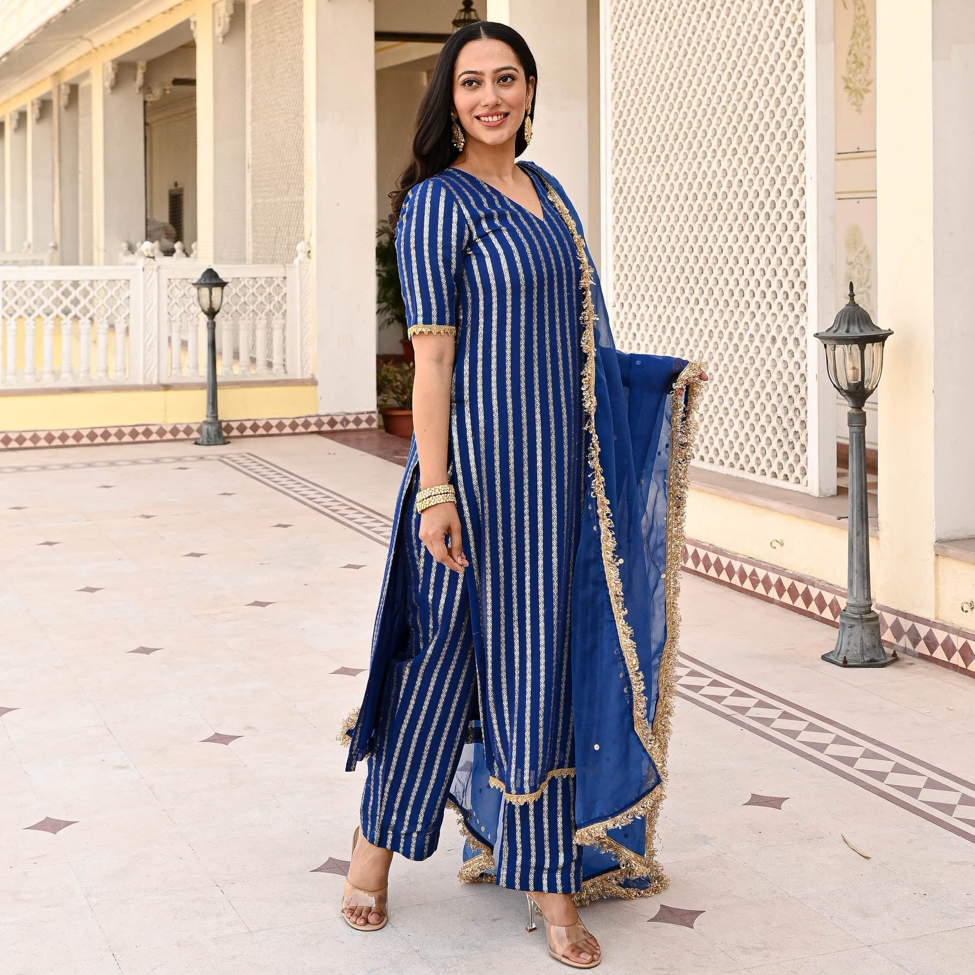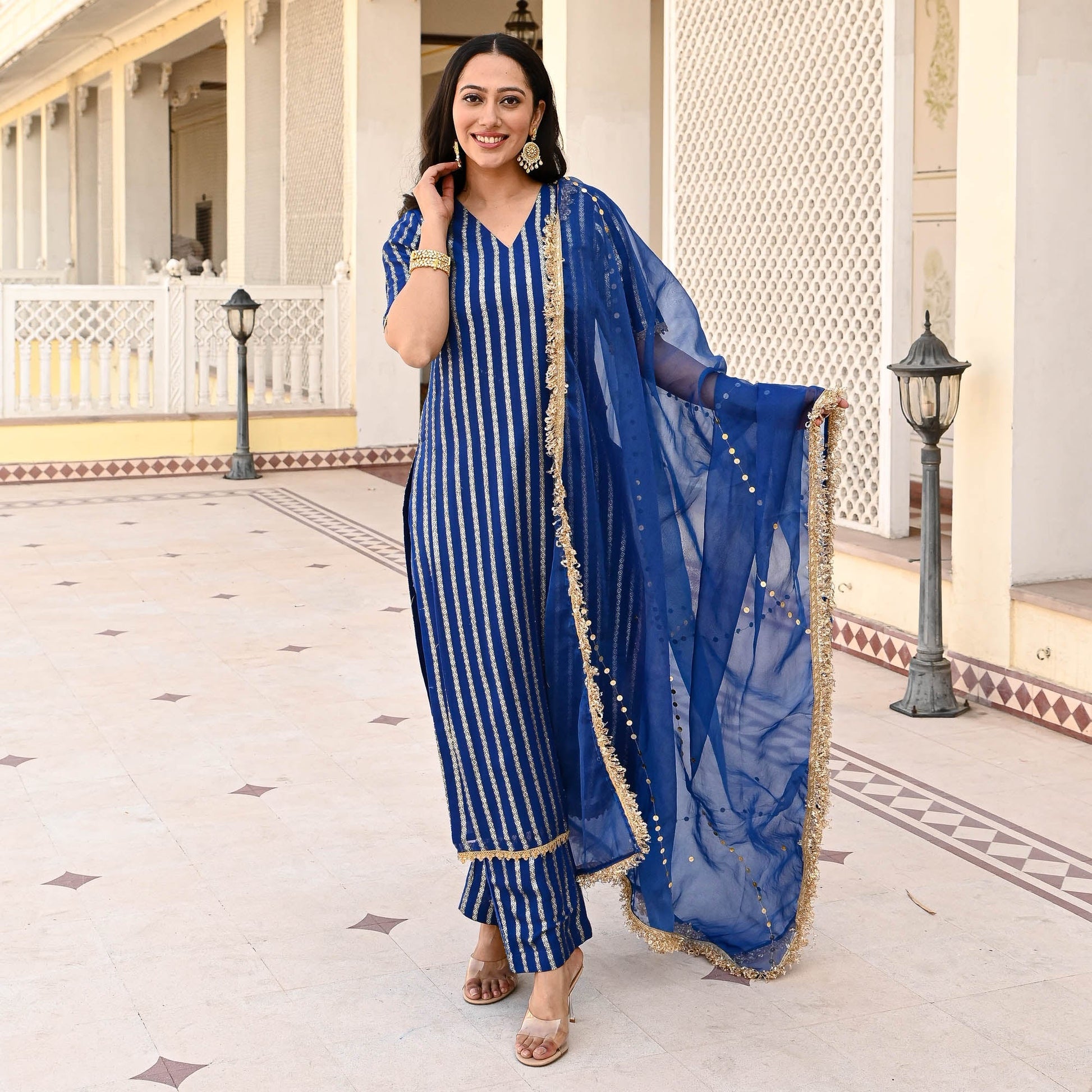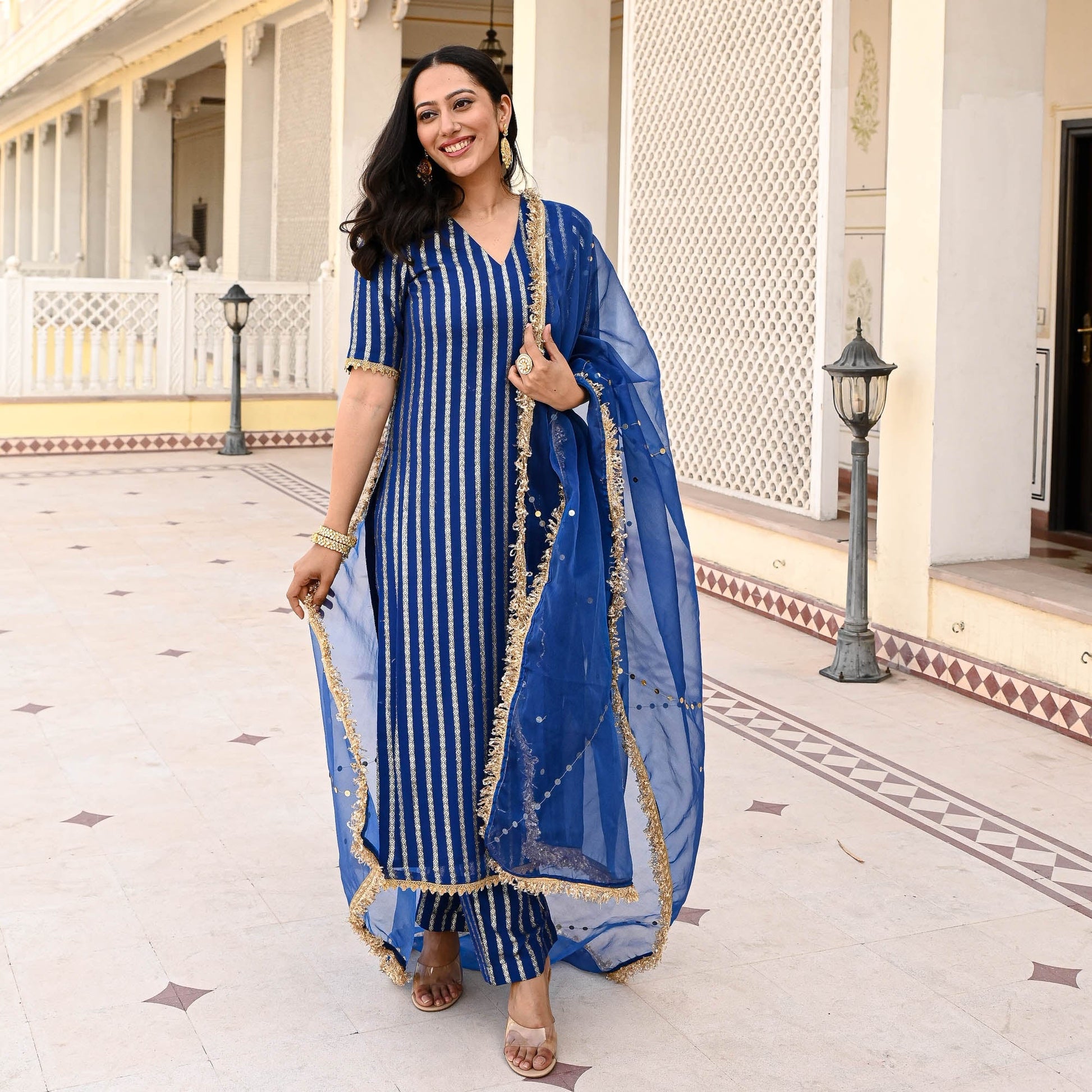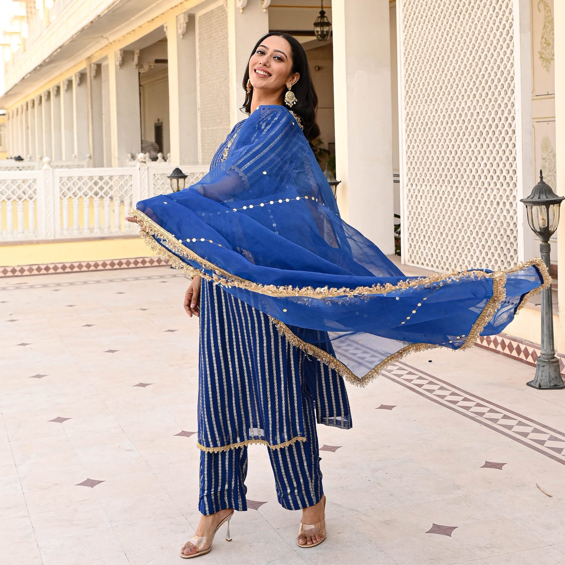 Embrace the vibrancy of the season with our Neil Suit Set, and shine bright wherever you go. Designed to accentuate your silhouette while allowing freedom of movement, this versatile co-ord set promises to make a statement wherever you go. Pair it with your favorite accessories to add your personal touch and step into the spotlight with confidence. The midnight blue color adds to the gorgeous charm of the ensemble. Indulge in the luxury of an opulent Jacquard that drapes beautifully, providing a flattering silhouette that complements every body type. The gorgeous straight-fit kurta is paired with matching pants, and an organza embellished dupatta with fringed lace edges. Experience the joy of wearing an ensemble that not only celebrates tradition but also celebrates your individuality.