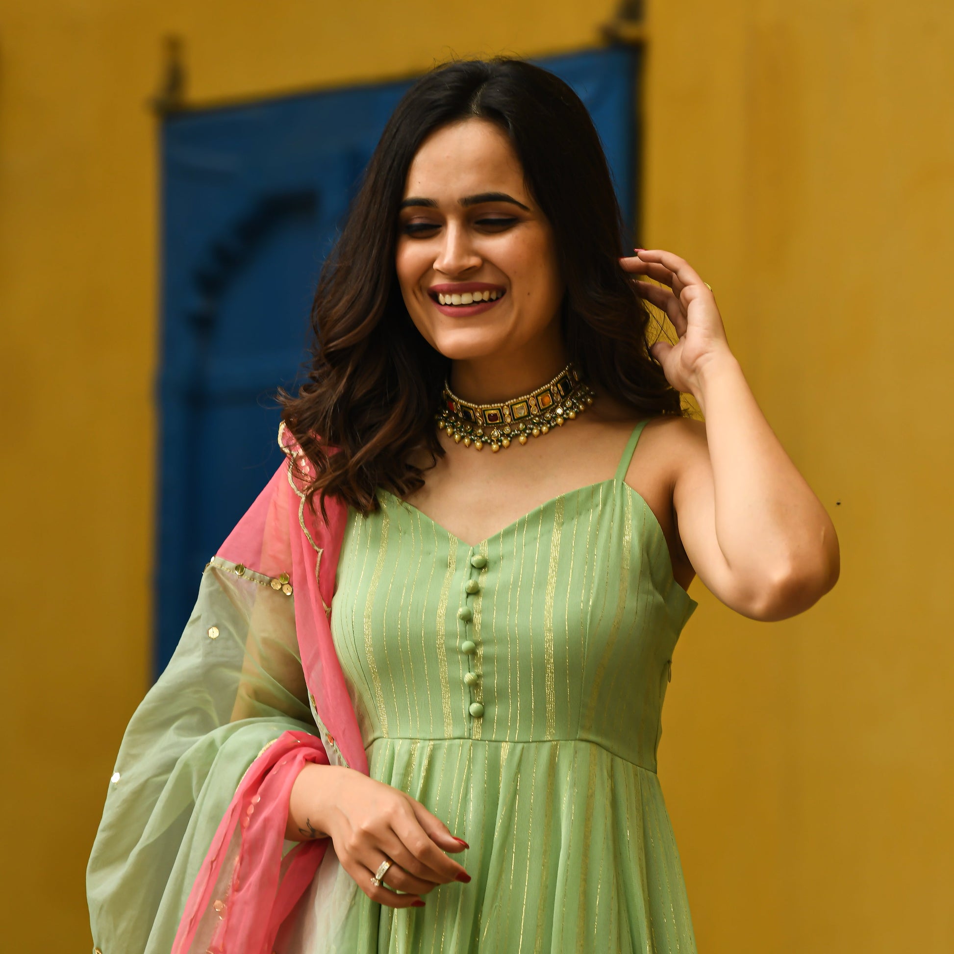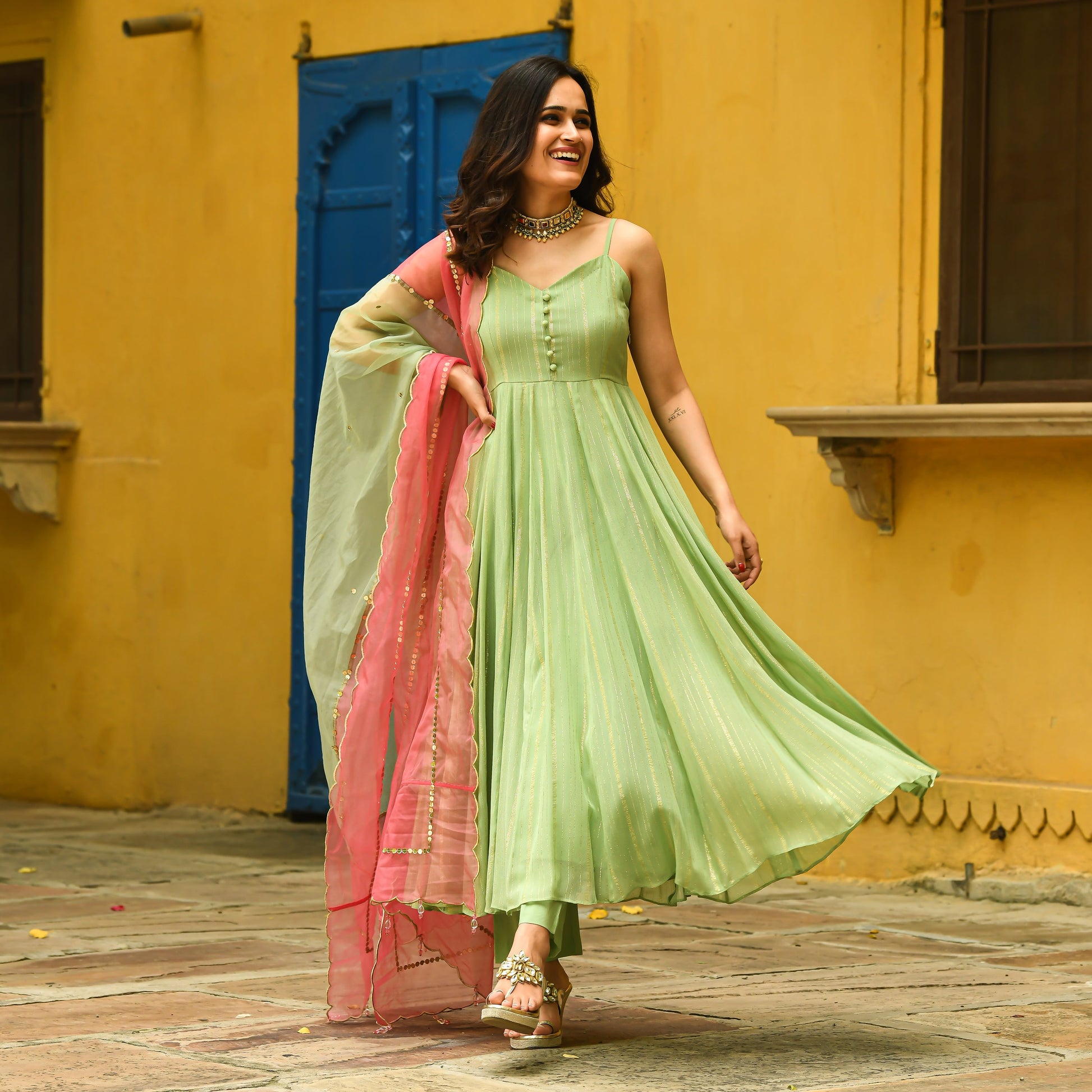 Introducing the stunning Netra Suit Set, the perfect blend of traditional elegance and contemporary fashion. This ensemble is sure to take your breath away with its subtle charm and mesmerizing beauty. The Suit Set features a gorgeous pastel green colour that is soothing to the eyes and the high-quality lurex fabric makes it shimmer and shine with every movement. The matching organza dupatta completes this outfit. This Suit Set is perfect for adding a touch of glamour to your ethnic wardrobe!