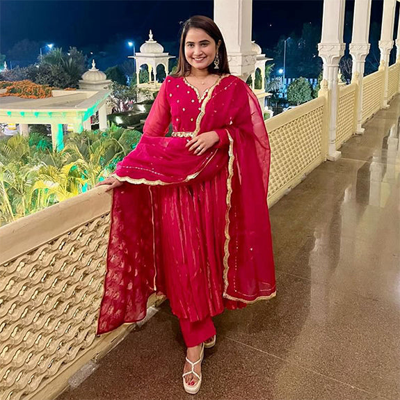 This stunning Nurjahan Suit Set features a long, flowy pink skirt with a fitted bodice and full sleeves. The fabric is made of a shimmering pink Lurex material, which adds a touch of glamour to the outfit. The Suit Set is also adorned with intricate sequin handwork, which adds a beautiful sparkle to the outfit. The Set comes with a matching pink organza dupatta, which is lightweight and sheer with matching sequin handwork. The combination of the shimmering Lurex fabric, intricate sequin work, and bright pink hue creates a truly stunning and unique look that is sure to turn heads.