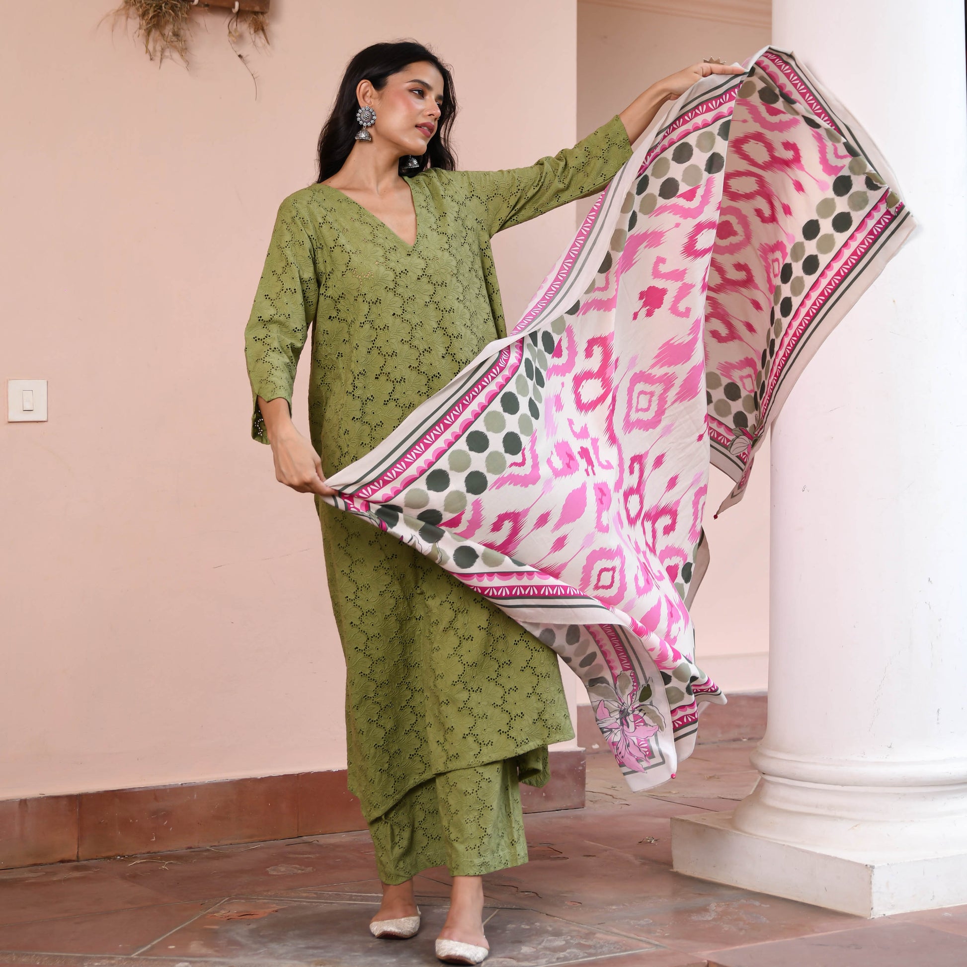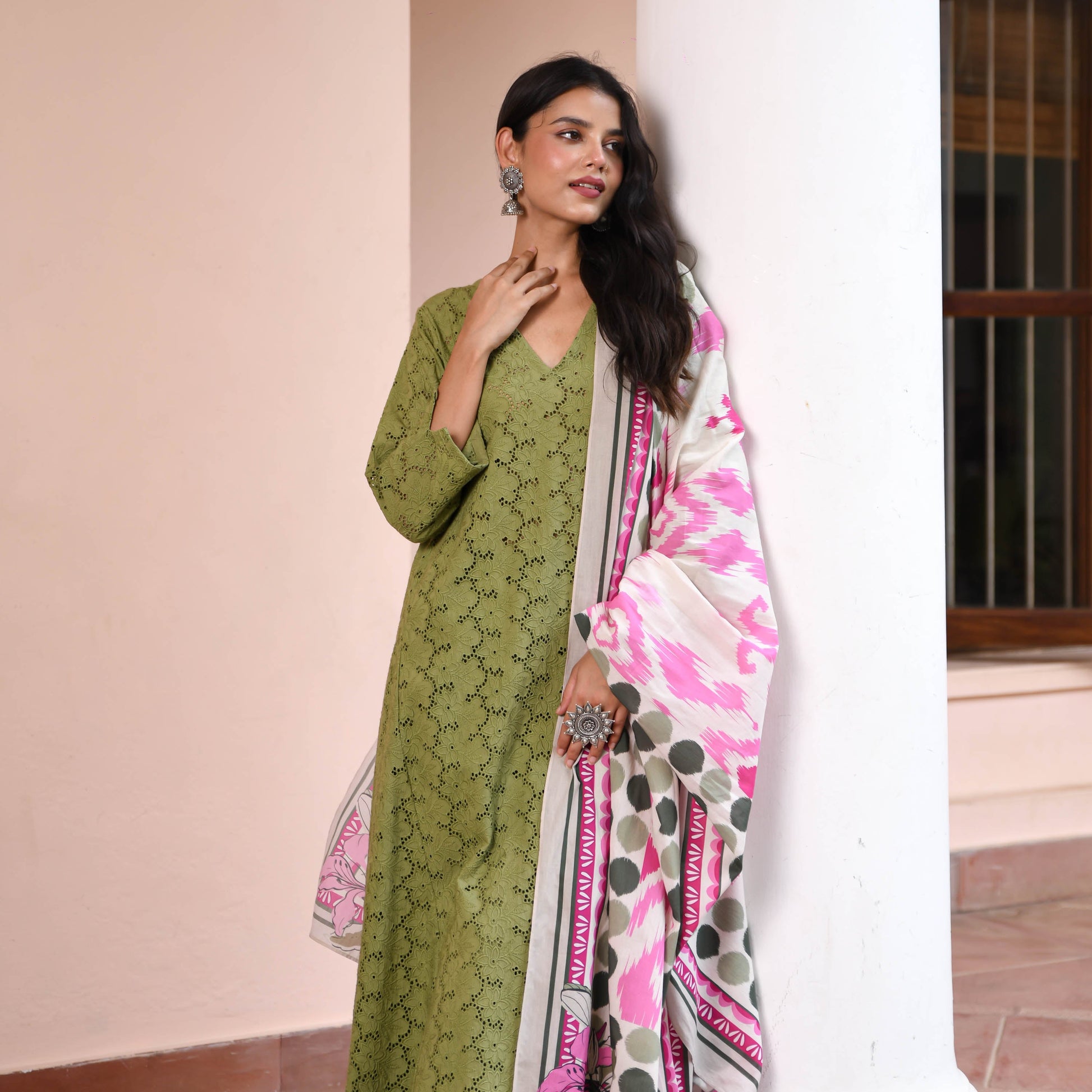 Elevate your style with the Olive Cotton Schiffli Suit Set! Crafted from luxurious cotton schiffli, this set features a loose-fit A-line kurta with a chic V-neckline and an asymmetrical hemline for a modern twist. The three-quarter sleeves add elegance, while the matching pants ensure comfort. Complete with a multicolor abstract printed dupatta, it's a vibrant choice for a standout look!