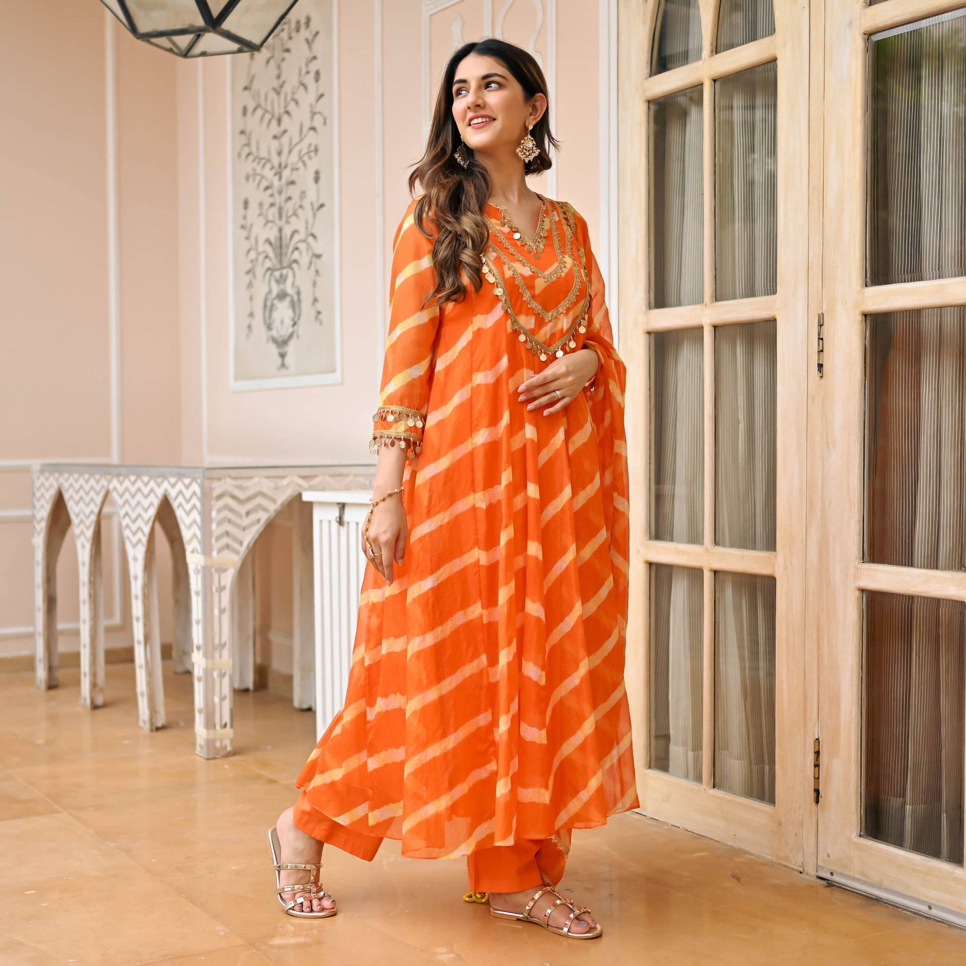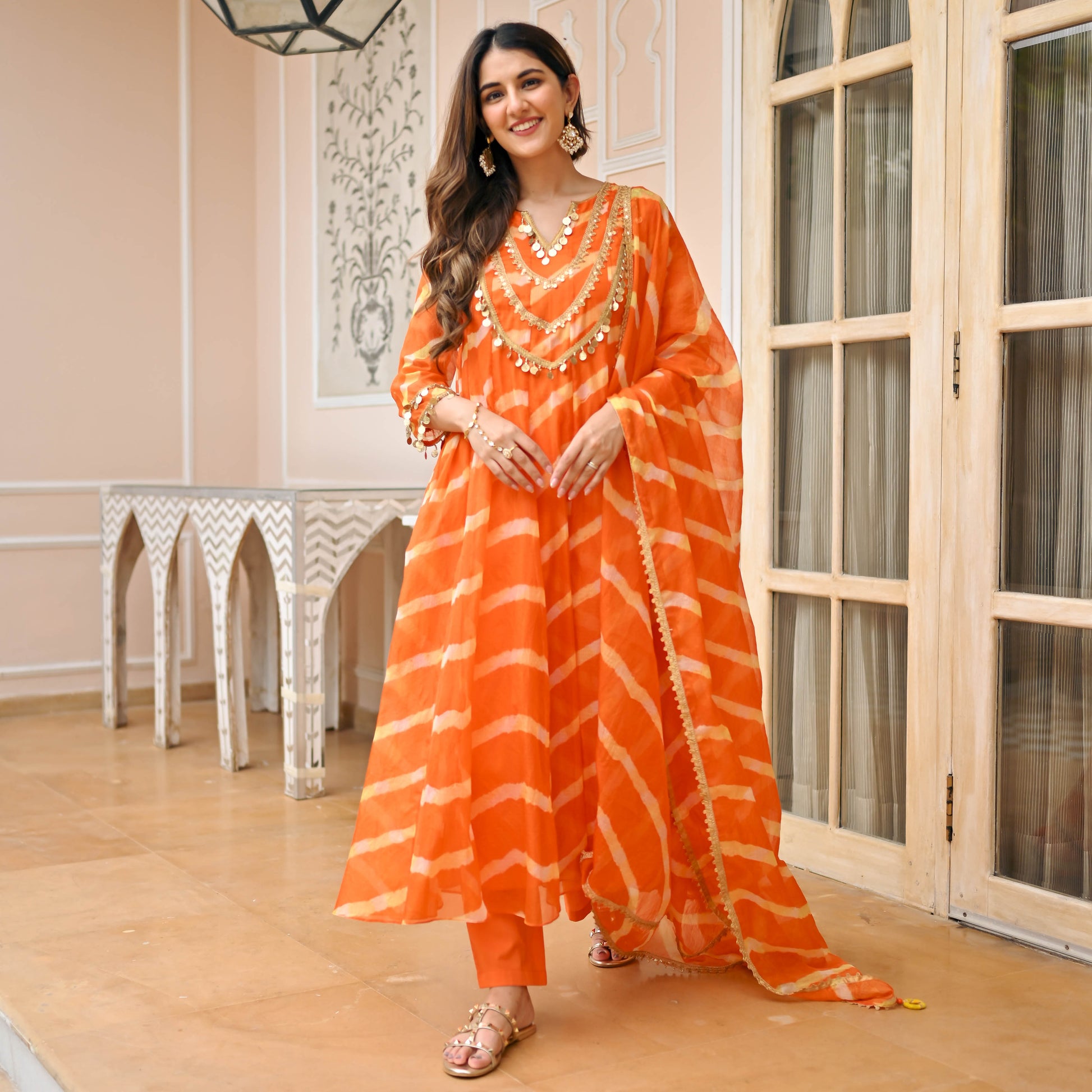 Step into a world of vibrant style with our Orange Leheriya Suit Set, a burst of energy and elegance that's ready to light up your fashion journey! The bright orange hue is as bold as your dreams, while the Leheriya pattern adds a playful twist. With gotta and sequin work that dazzles like sunshine and a relaxed fit that's all about comfort, this ensemble is your go-to for any occasion.