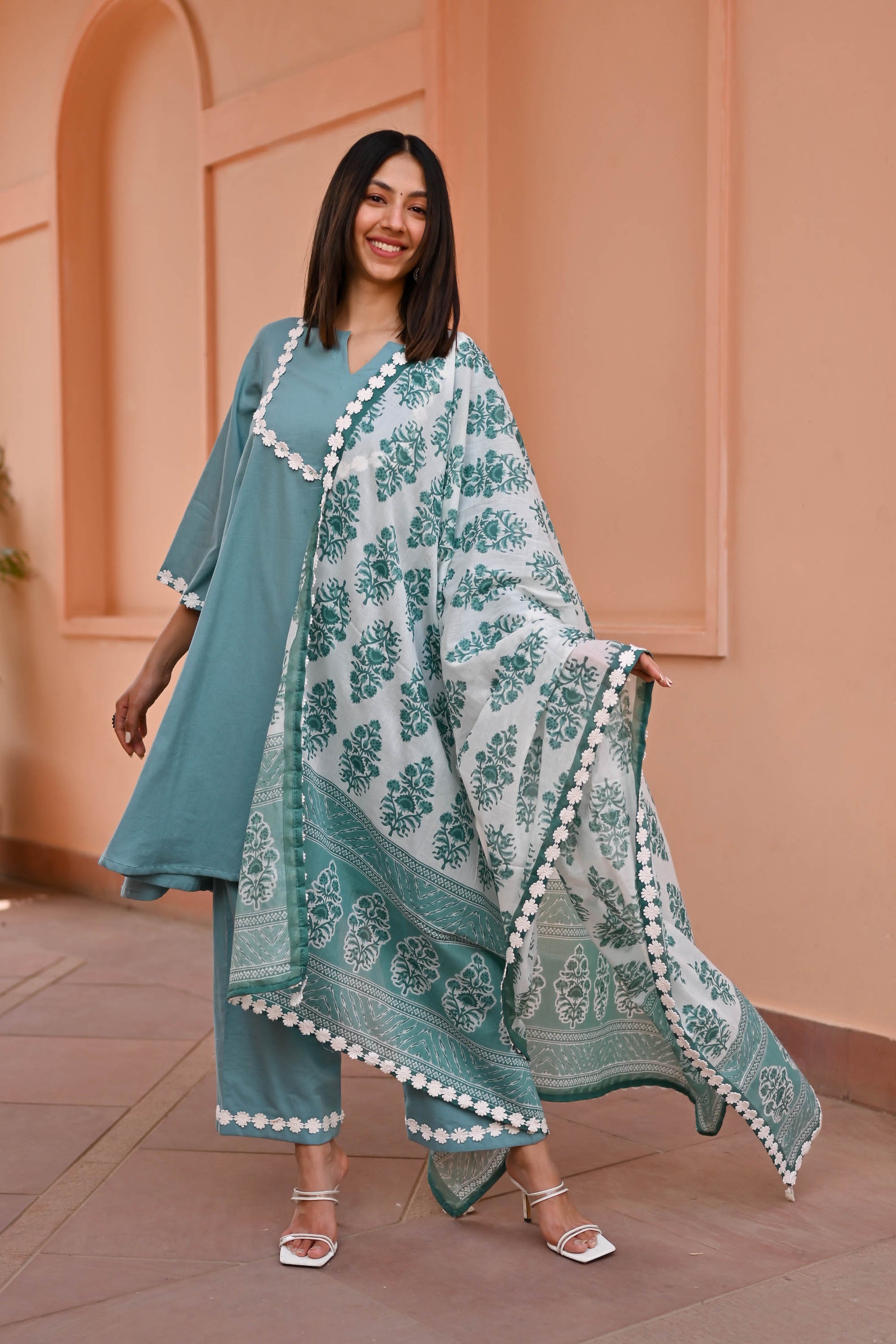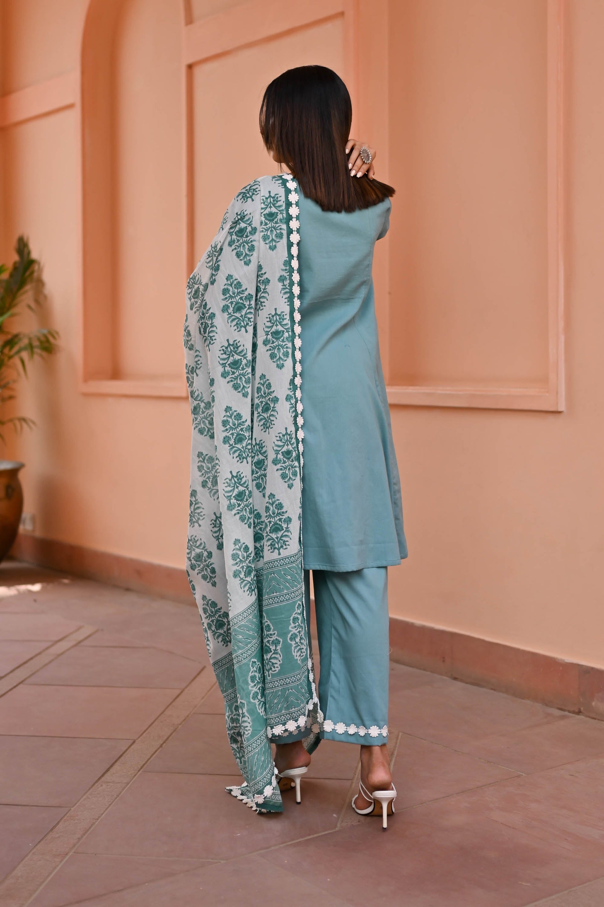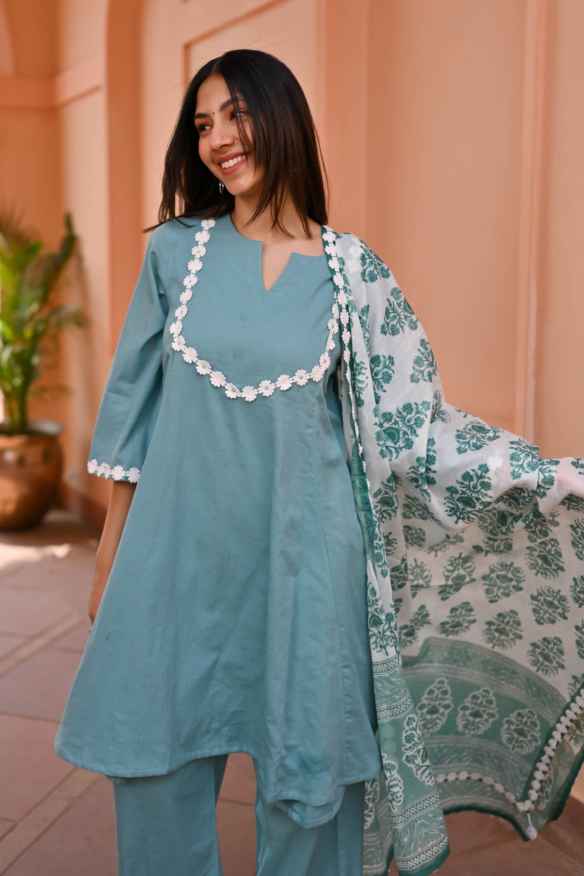 Immerse yourself in timeless elegance with the Padma Trio Cotton Suit Set. Fashioned from premium cotton, its sea green tones radiate sophistication. The relaxed-fit kurta boasts a round neck with a notch, enhanced by intricate floral applique details on the yoke. Complemented by three-quarter sleeves adorned with floral appliques, and effortlessly paired with matching pants and a contrasting dupatta, this ensemble epitomizes understated grace. Elevate your style when you dress to perfection in our Mulmul Cotton Suit. Crafted from premium cotton, this Anarkali suit features solid kurta pants paired with a beautifully printed dupatta. Embrace comfort and style in sea green hues, perfect for any occasion. Pakistani cotton suits for women exude timeless elegance and grace, offering unmatched breathability and sophistication. Discover the epitome of chic with our cotton Anarkali suit collection today.