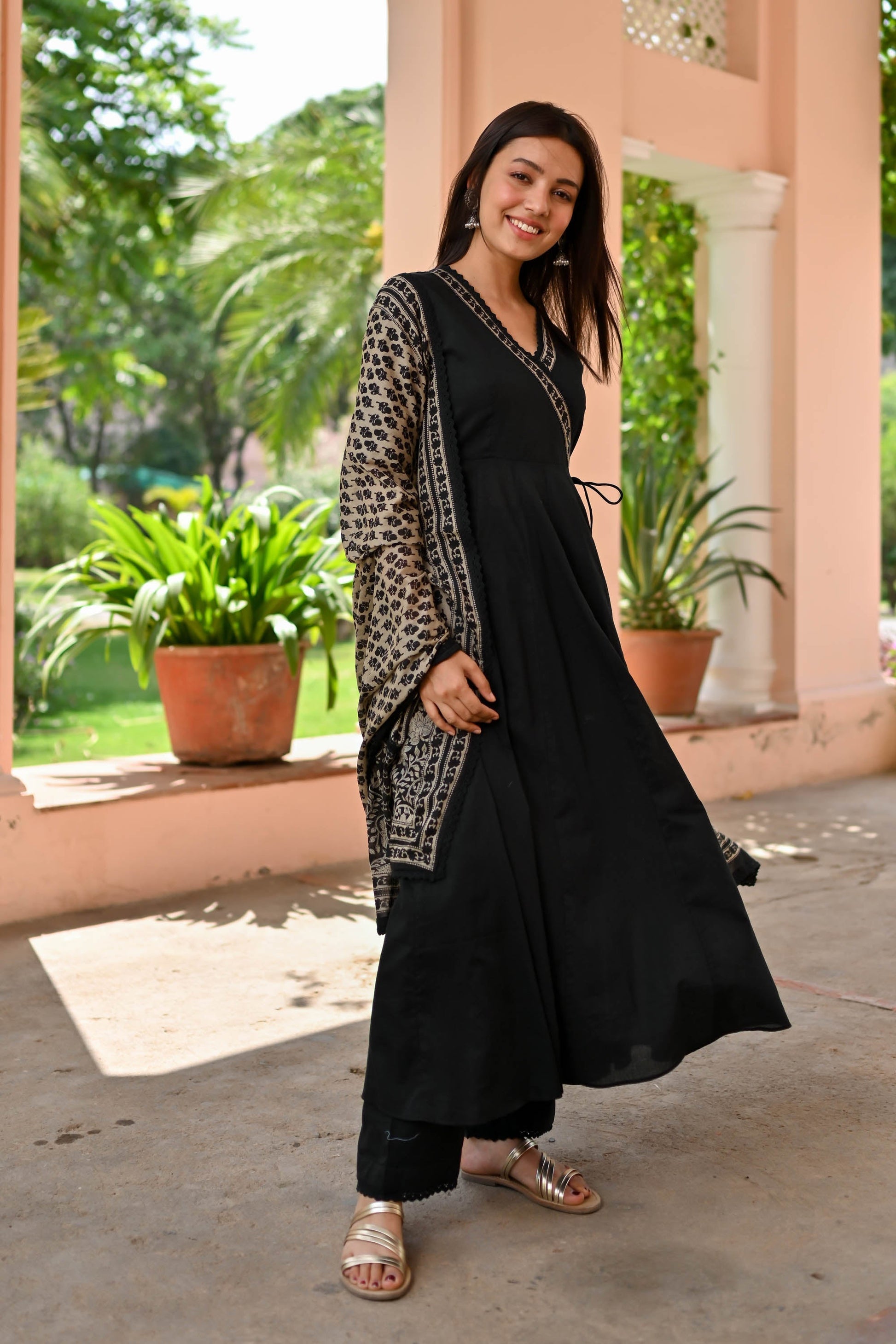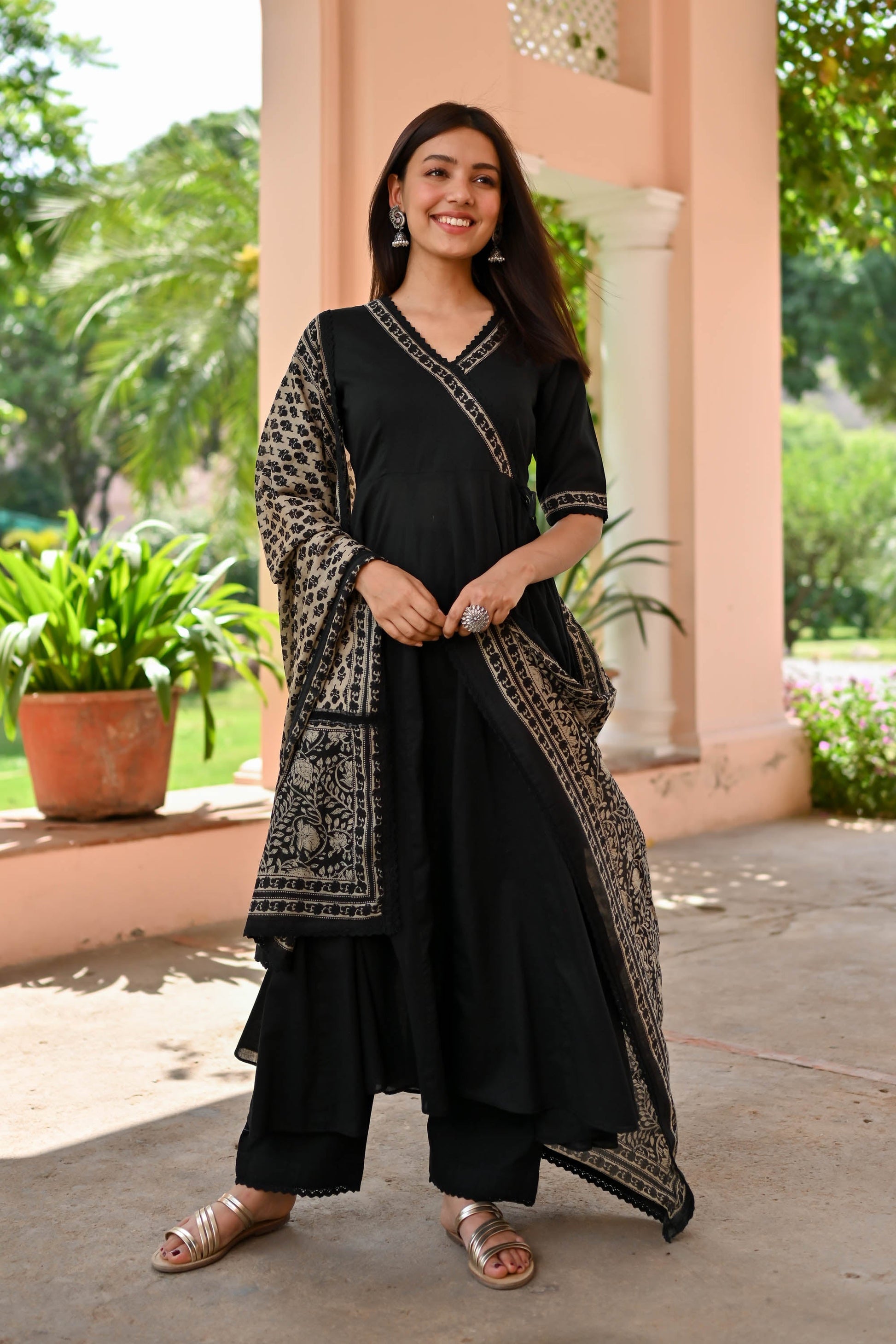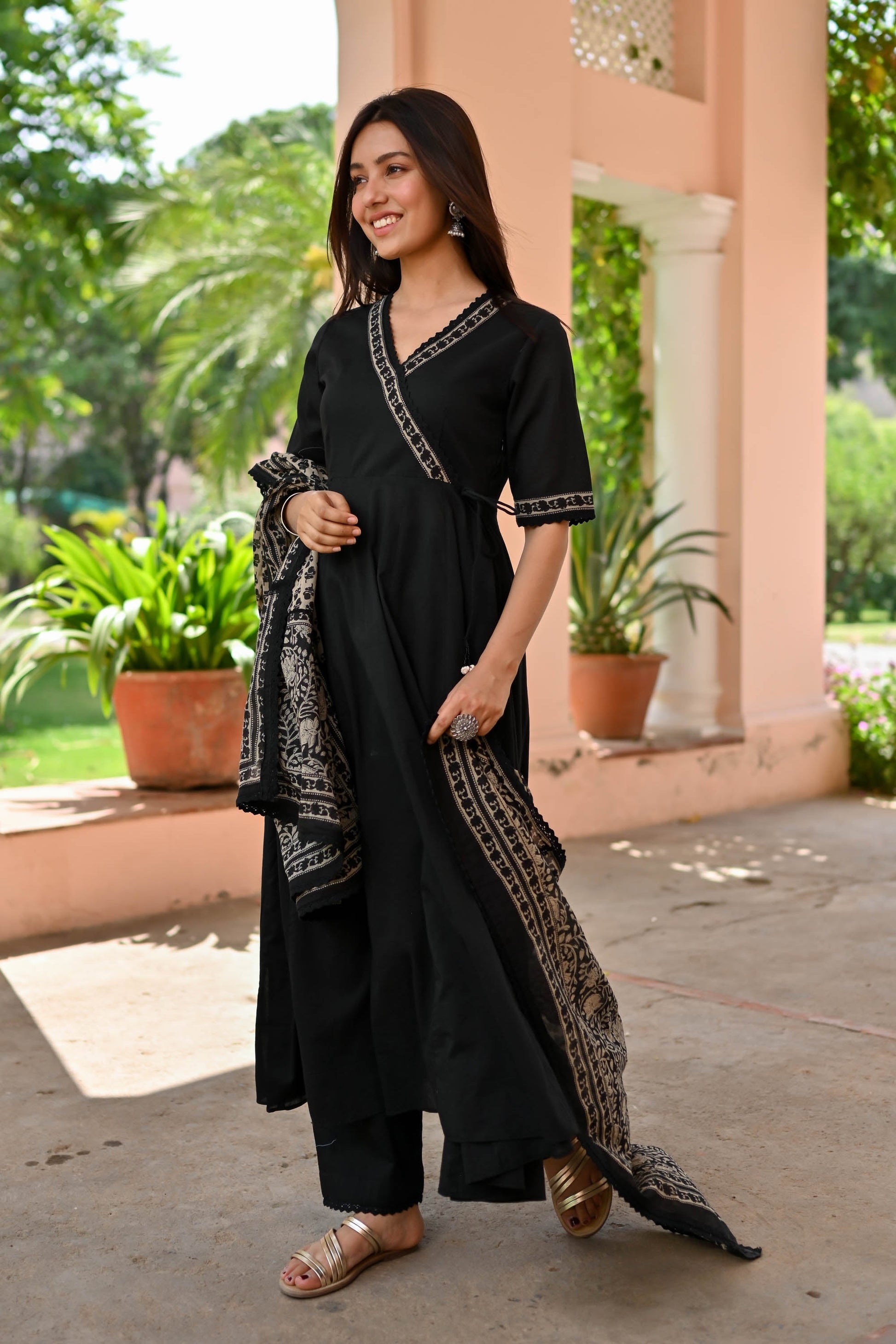 Introducing the Pari Cotton Suit Set Of Three, a symbol of elegance. Luxuriously crafted from premium cotton, its midnight black hues exude sophistication. The angrakha pattern yoke with contrasting panel detailing, dori with tassel detailing under the yoke, and elbow-length sleeves with contrasting panels elevate its allure. Paired with matching pants and a floral printed dupatta, this ensemble epitomizes timeless charm with a modern twist.