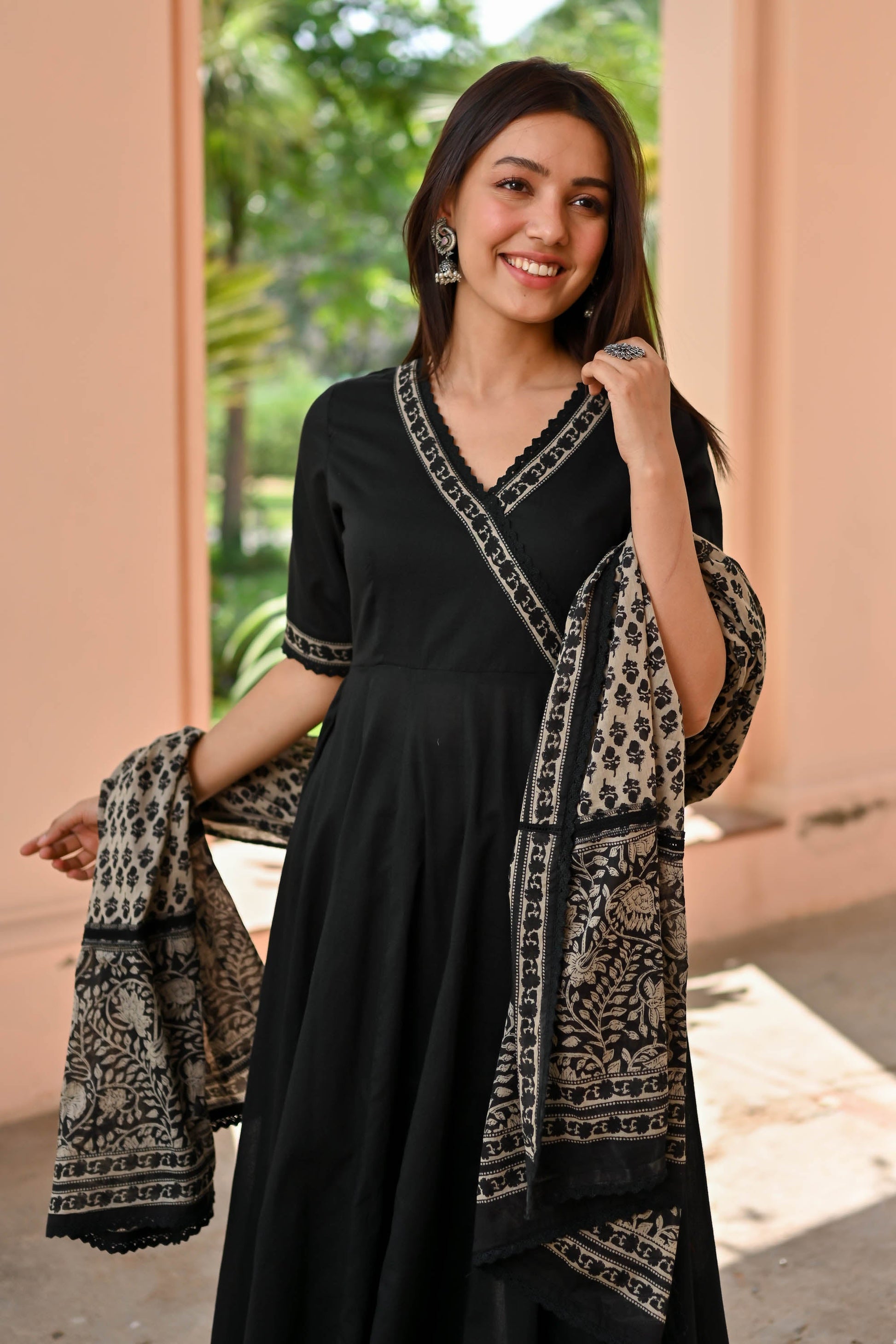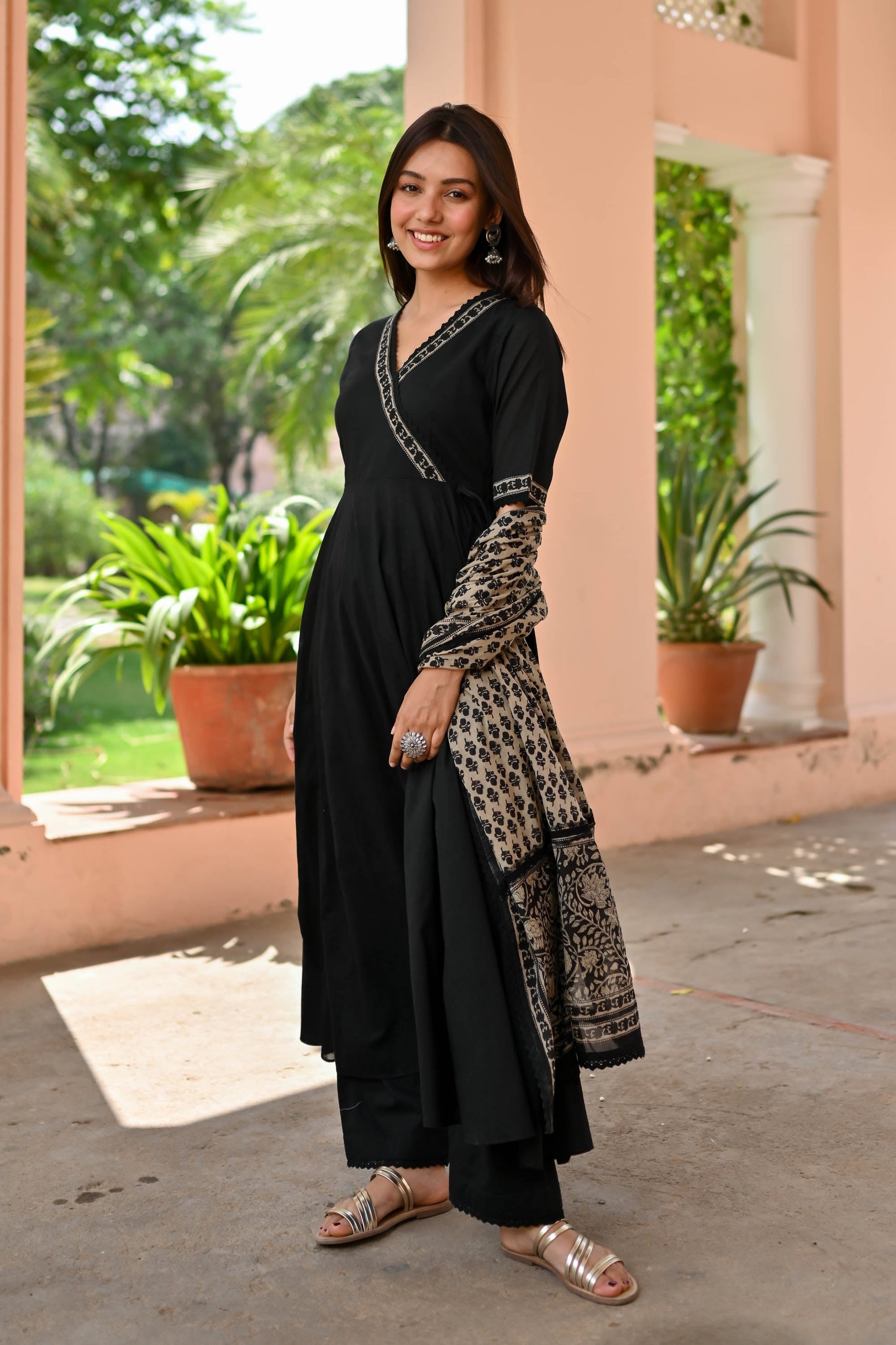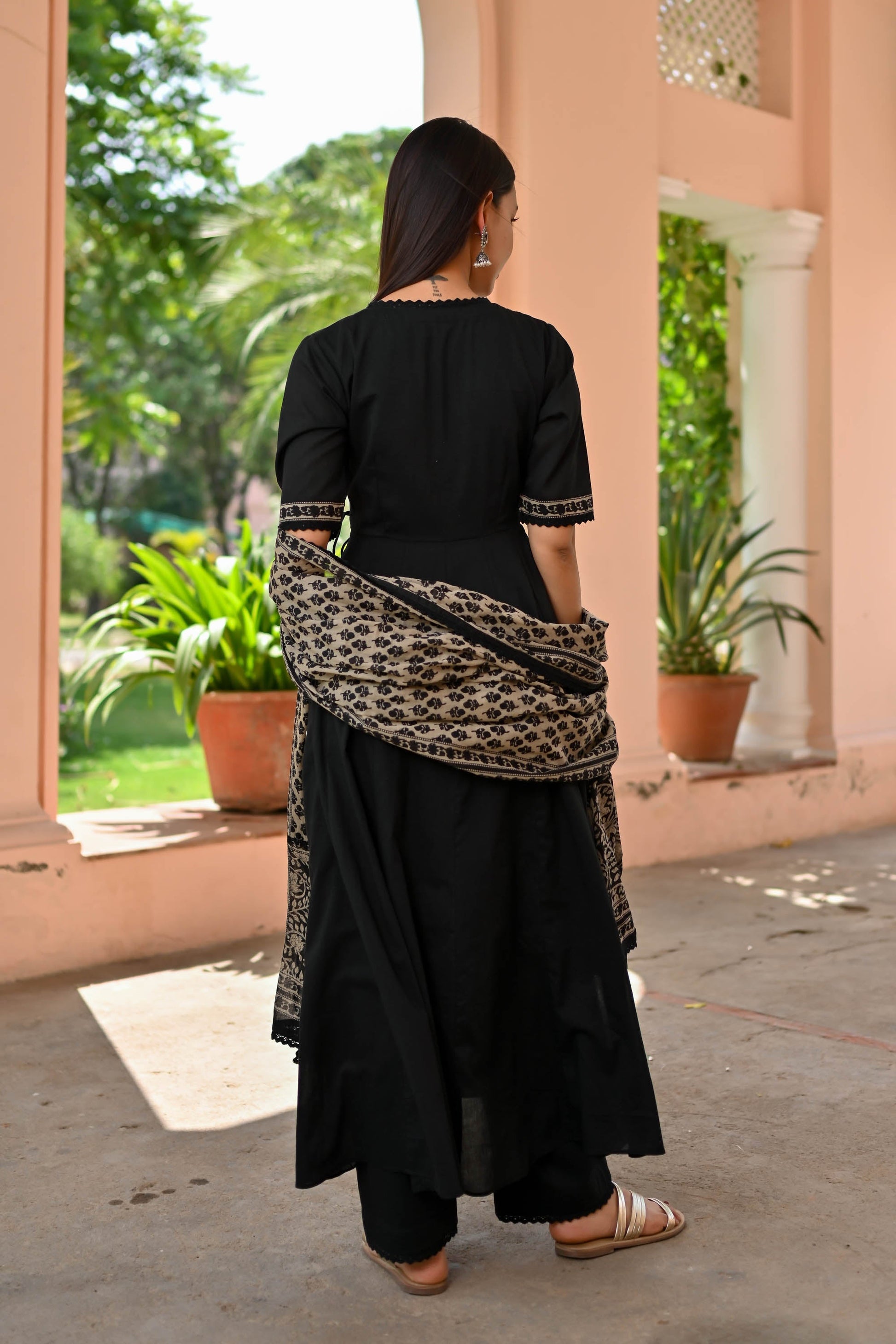 Introducing the Pari Cotton Suit Set Of Three, a symbol of elegance. Luxuriously crafted from premium cotton, its midnight black hues exude sophistication. The angrakha pattern yoke with contrasting panel detailing, dori with tassel detailing under the yoke, and elbow-length sleeves with contrasting panels elevate its allure. Paired with matching pants and a floral printed dupatta, this ensemble epitomizes timeless charm with a modern twist.