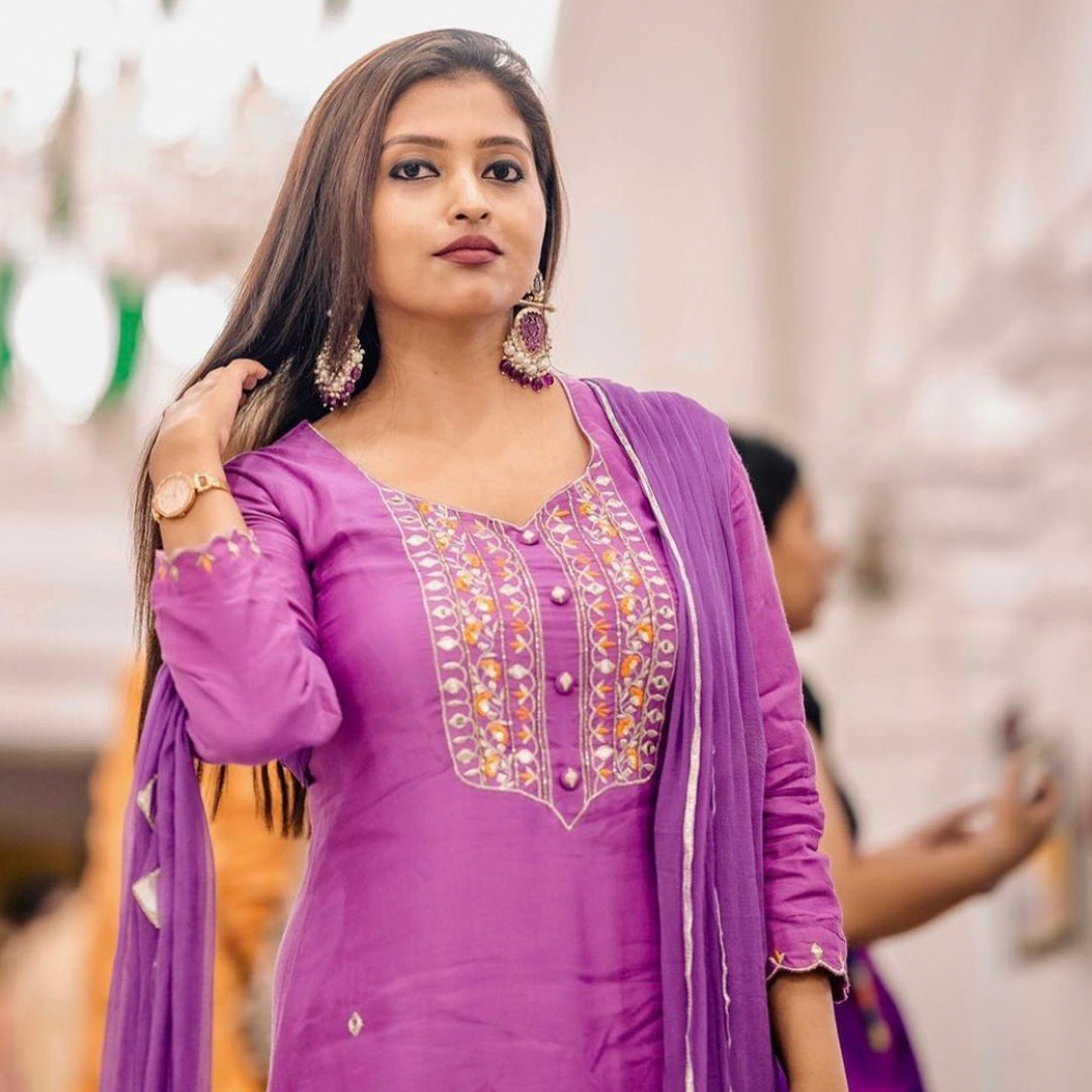 Introducing our exquisite Paridhi Suit Set, the perfect outfit for making a statement on any special occasion. This set is crafted from a luxurious blend of cotton and silk, ensuring it feels soft and comfortable against your skin. The beautiful purple colour is sure to turn heads, and the intricate embroidery detailing adds an extra layer of elegance to the overall look. The unique neckline adorned with embroidery is the highlight of the outfit, drawing attention to your face and neck, and showcasing your unique sense of style.