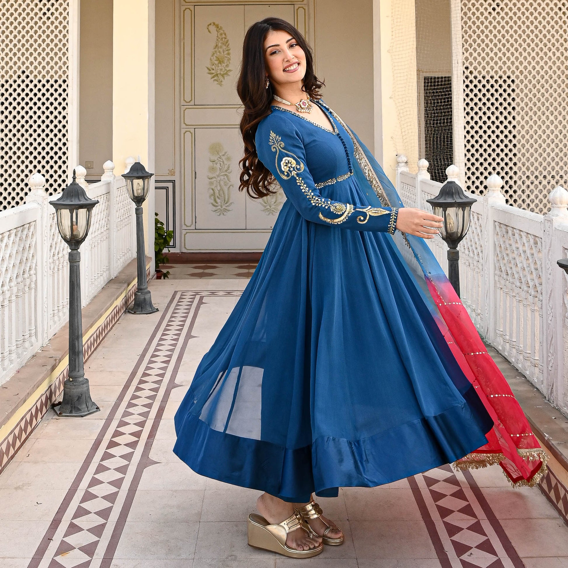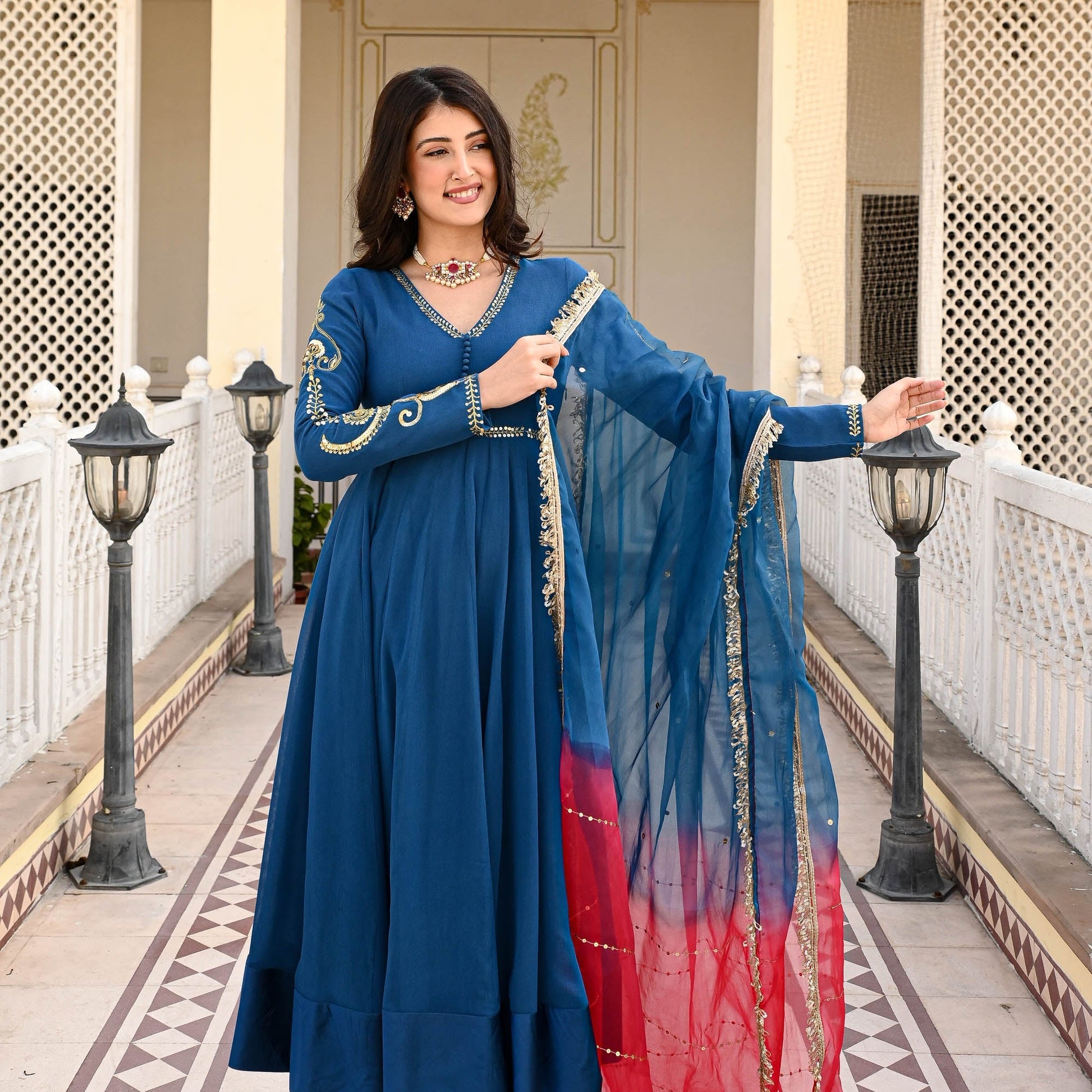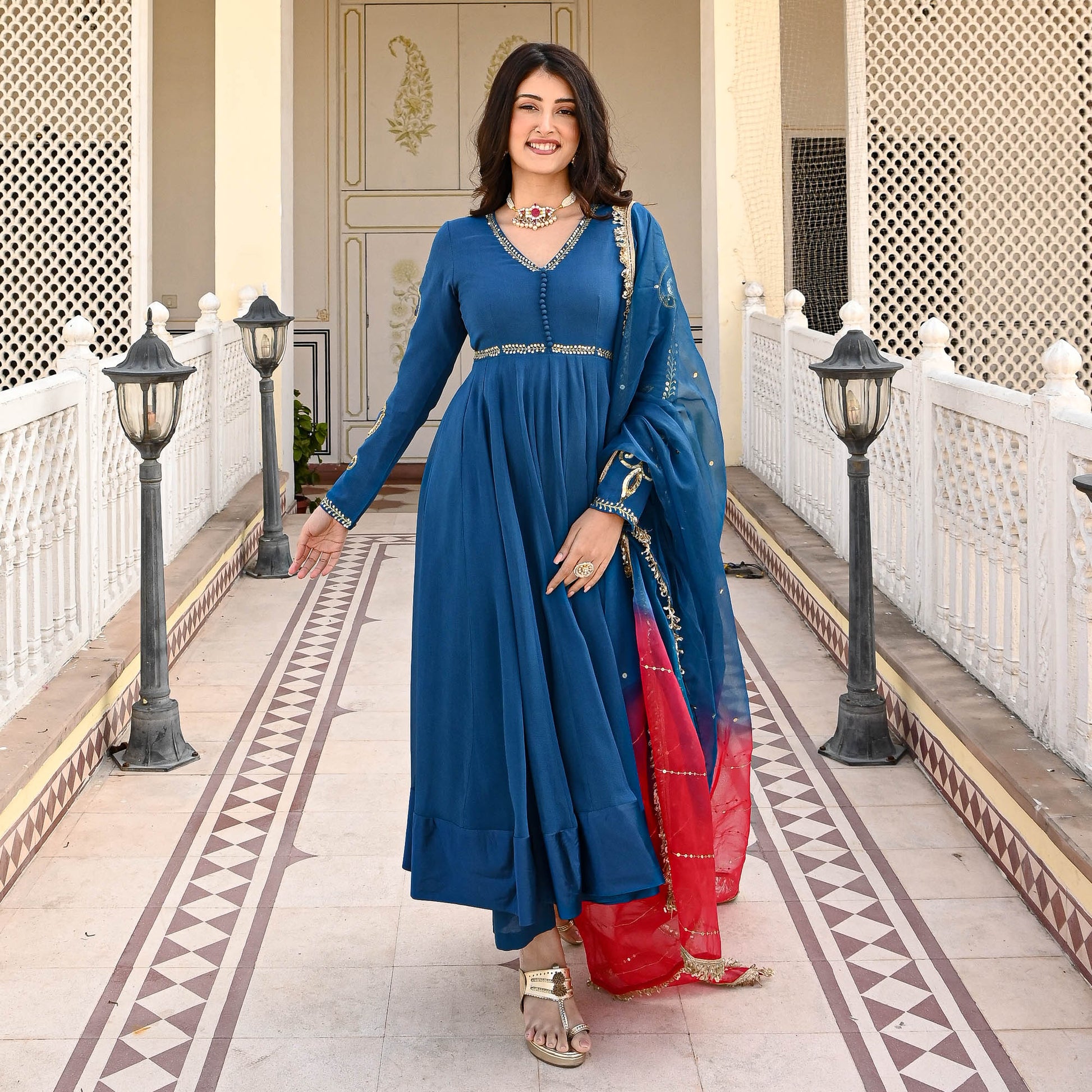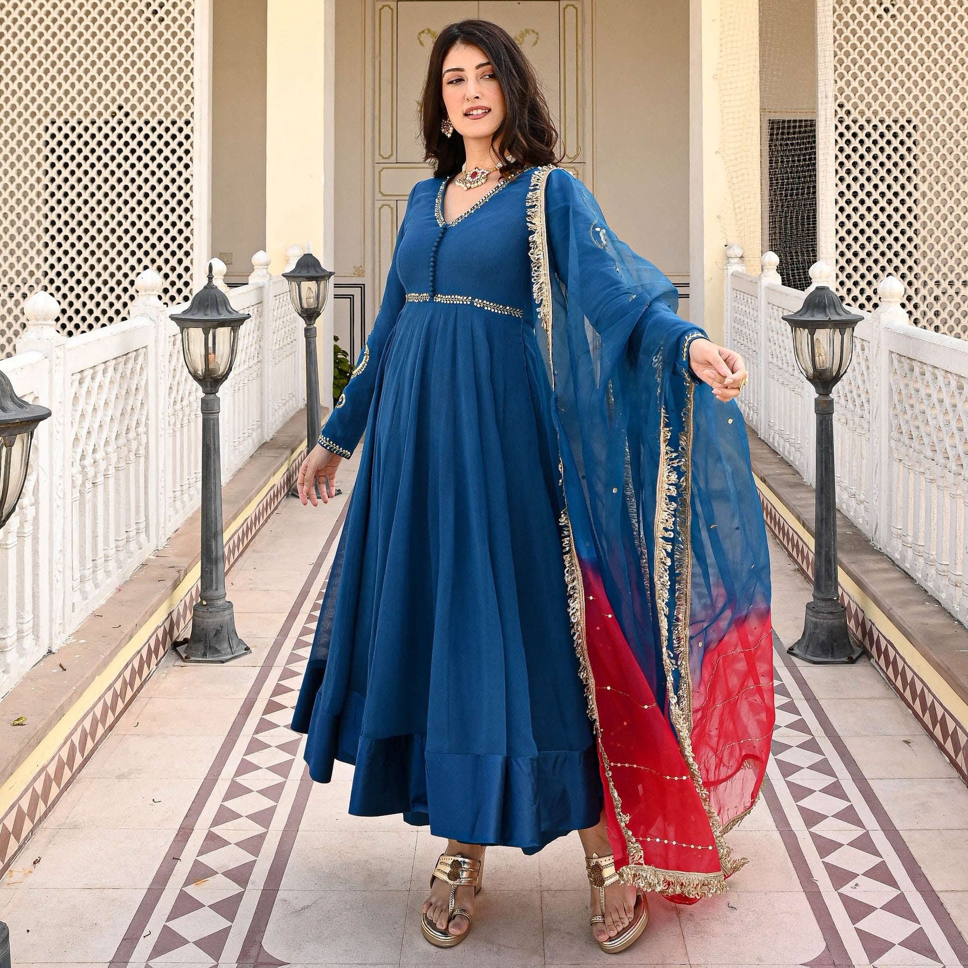 Introducing the radiant Parnika Suit Set, where vibrant hues of blue meet plush georgette elegance. The flared A-line kurta steals the show with its V-neckline adorned with sequin and zari embroidery, cascading gracefully under the yoke. Adding a charming touch, potli buttons line the front placket, while intricate placement buta embroidery adorns the full sleeves. Paired seamlessly with matching pants, it promises both style and comfort. Completing the ensemble is an ombre organza dupatta, featuring placement sequin throughout and delicate fringe lace on the edges, adding a touch of whimsy to this exquisite attire. Embrace timeless sophistication with the Parnika Suit Set, a true masterpiece of chic allure.
