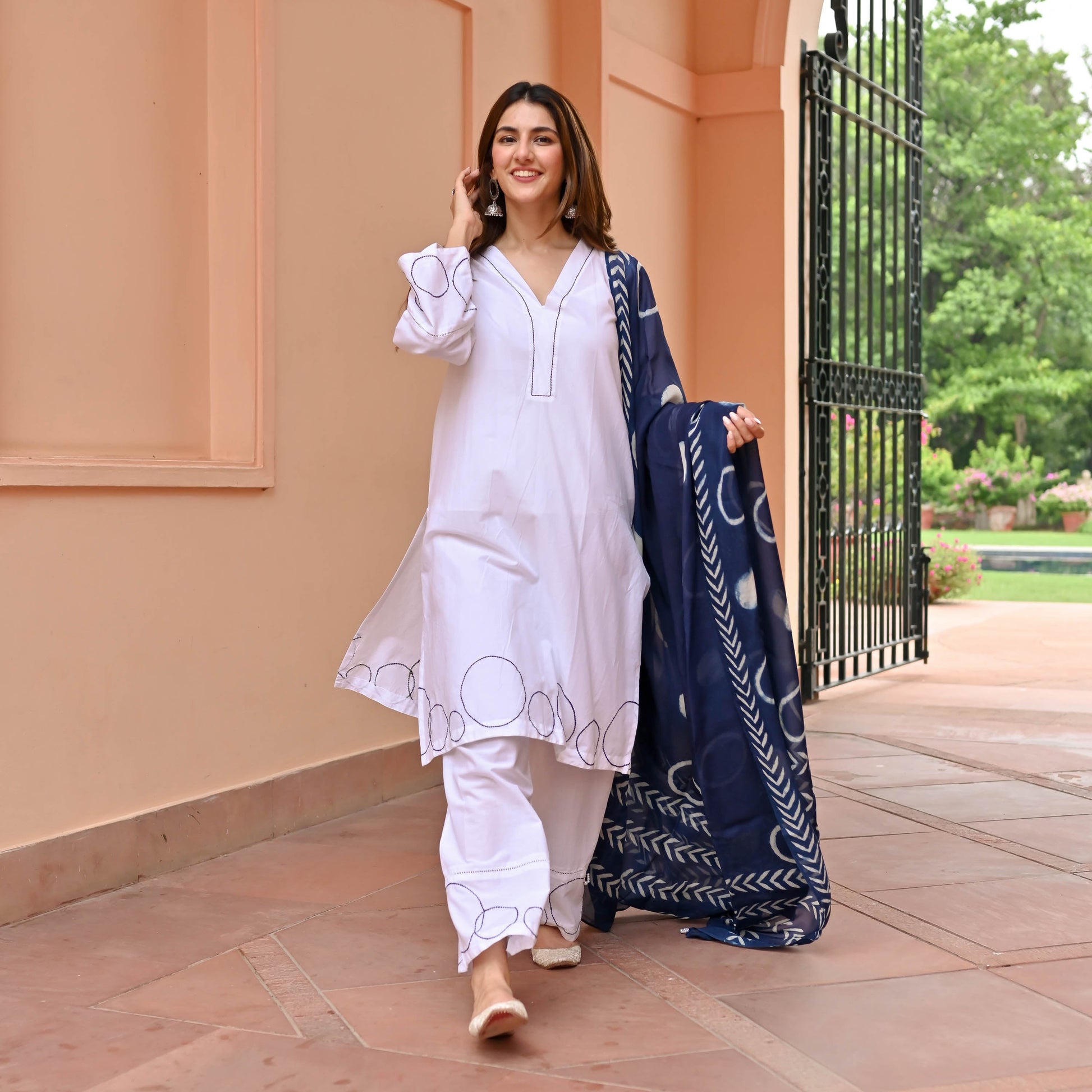 Pearl White Suit with Indigo Dupatta offers a stunning blend of elegance and comfort. Crafted from plush white cotton, the relaxed-fit A-line kurta features a V-neckline and three-quarter sleeves adorned with delicate threadwork embroidery. Paired with matching pants, this ensemble is beautifully complemented by a flowy organza indigo printed dupatta, making it perfect for festive occasions and special events.
