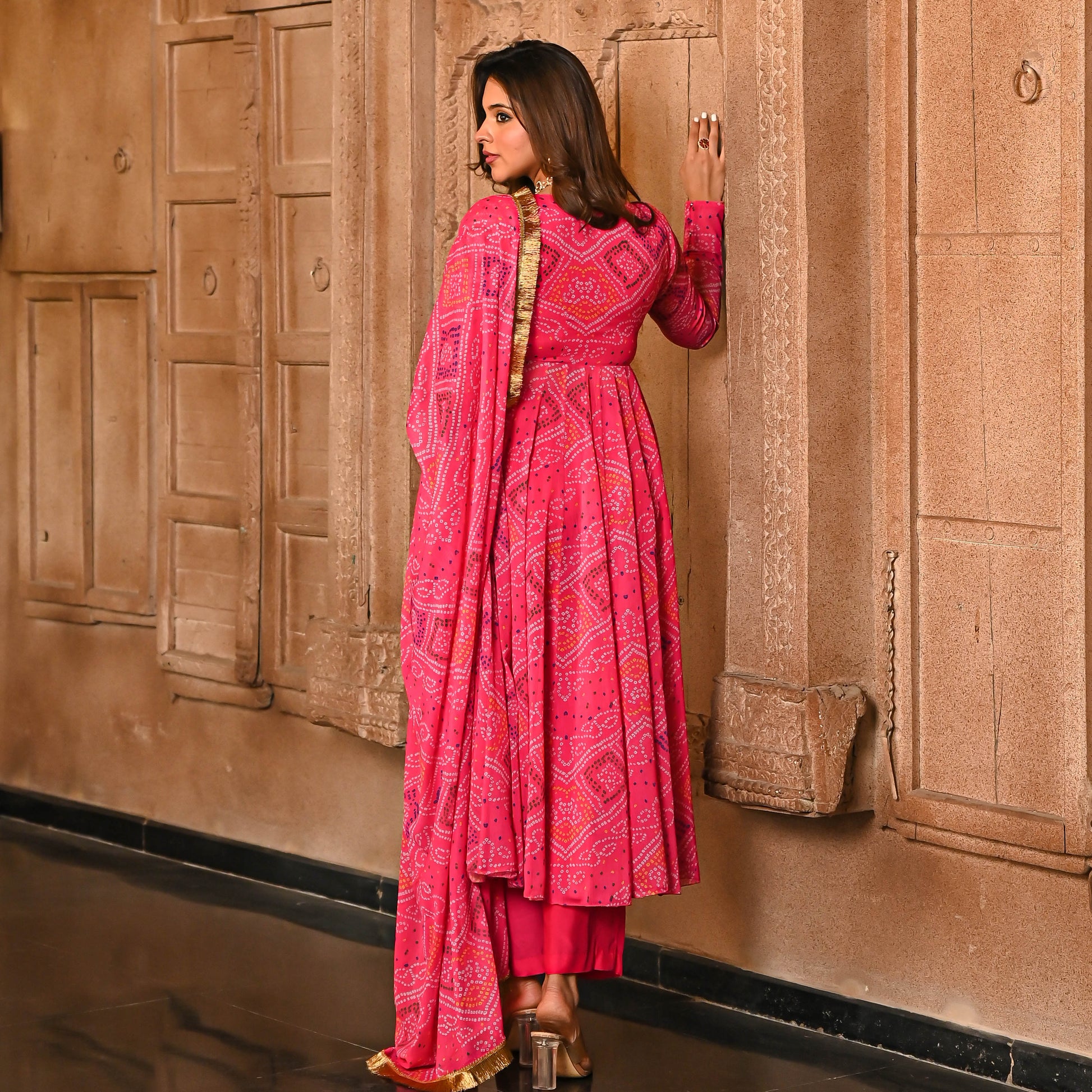 Bring out your style quotient with this Hot Pink Bandhani Suit Set. Here to set you apart from the crowd, this suit set features gorgeous gotta detailing on the matching dupatta. Embrace your main-character energy in this absolute stunner.
