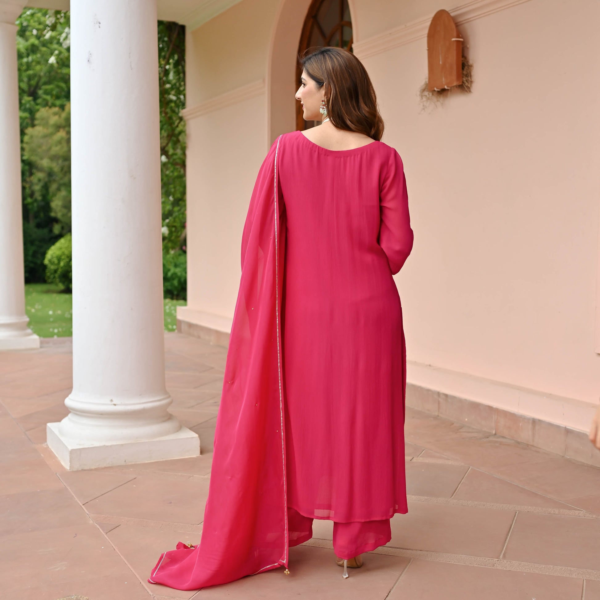 The Pink Charm Georgette Suit Set dazzles in vibrant hot pink on sumptuous georgette fabric. The straight kurta boasts a high round neckline, full-length sleeves, and intricate placement embellishments, highlighted by a heavy floral design on the front. Paired with matching pants and a sequin-embellished dupatta, this set radiates elegance and charm.