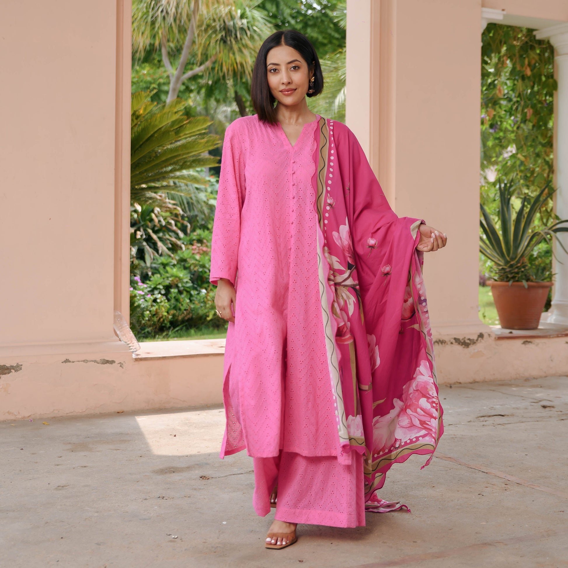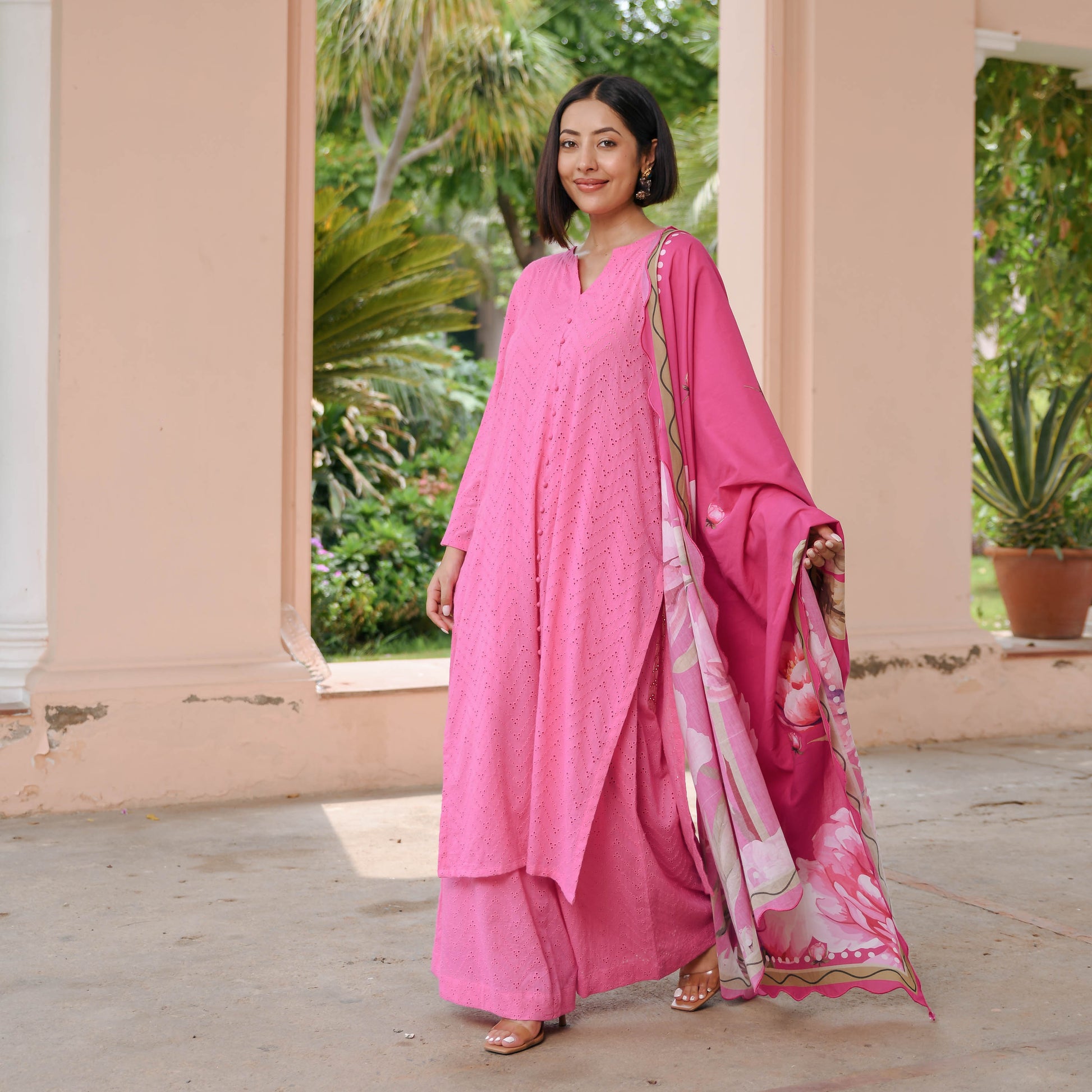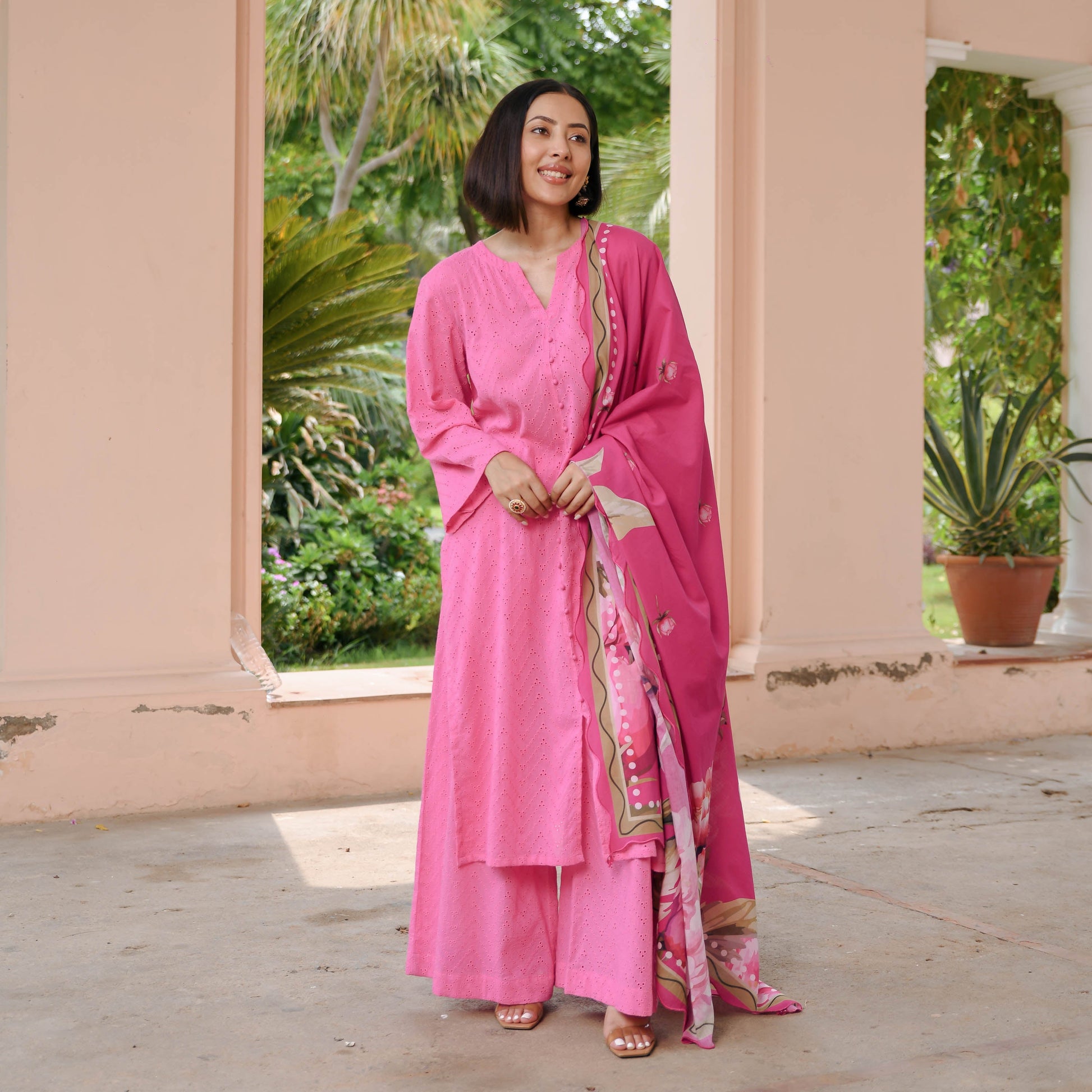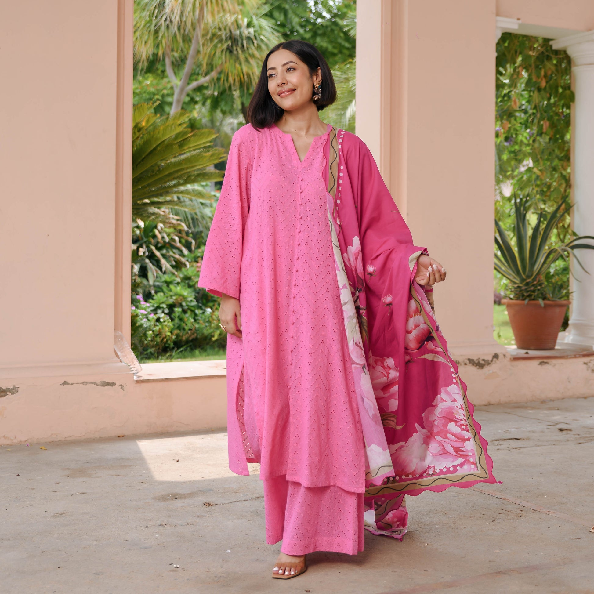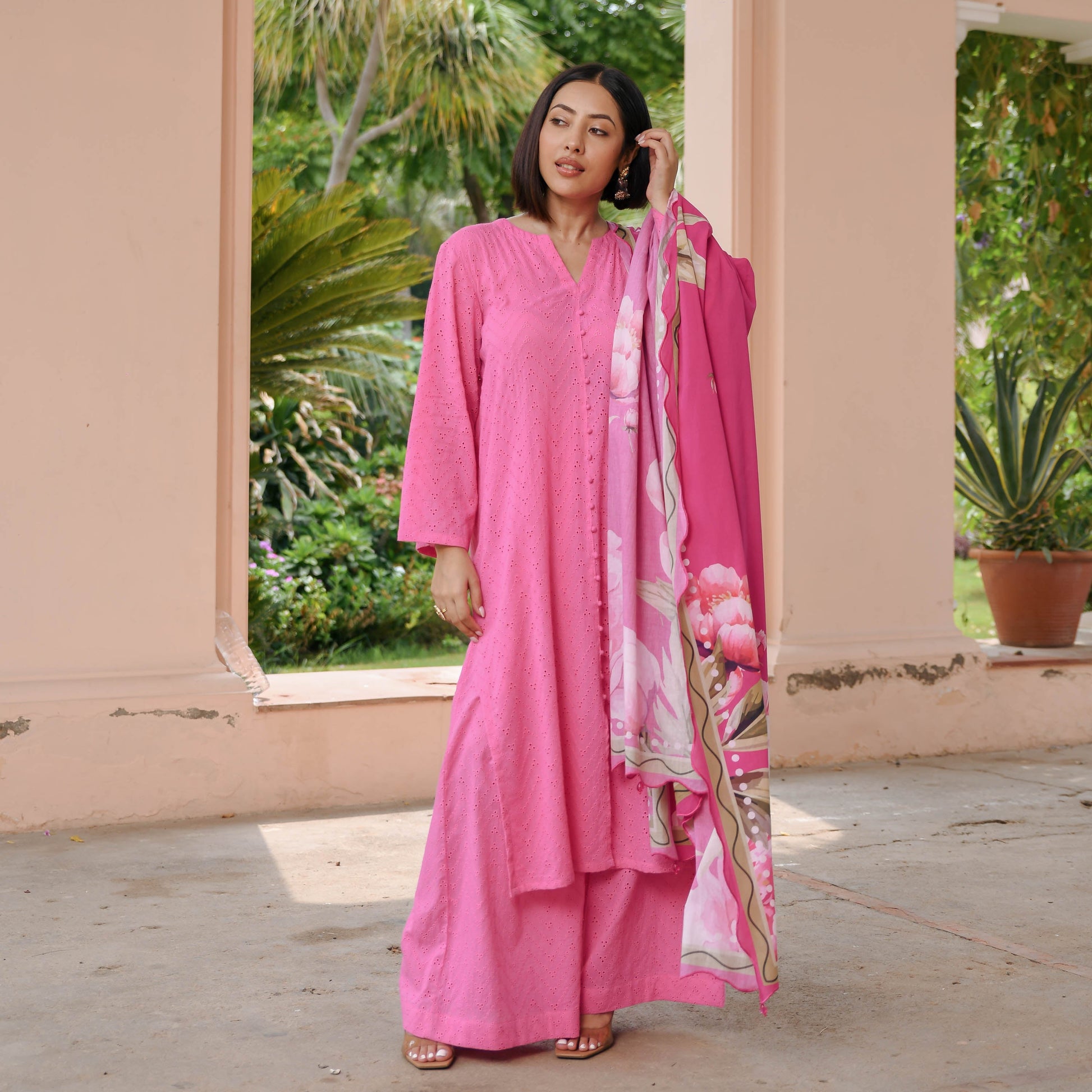 Brighten up your wardrobe with the Pink Cotton Schiffli Suit Set! Crafted from plush cotton schiffli, this set features a loose-fit straight kurta with a V-neckline and charming potli buttons down the front. Full-length sleeves add elegance, while the matching pants ensure comfort. Paired with a vibrant multicolor floral printed dupatta, it’s a playful and stylish choice for any event!