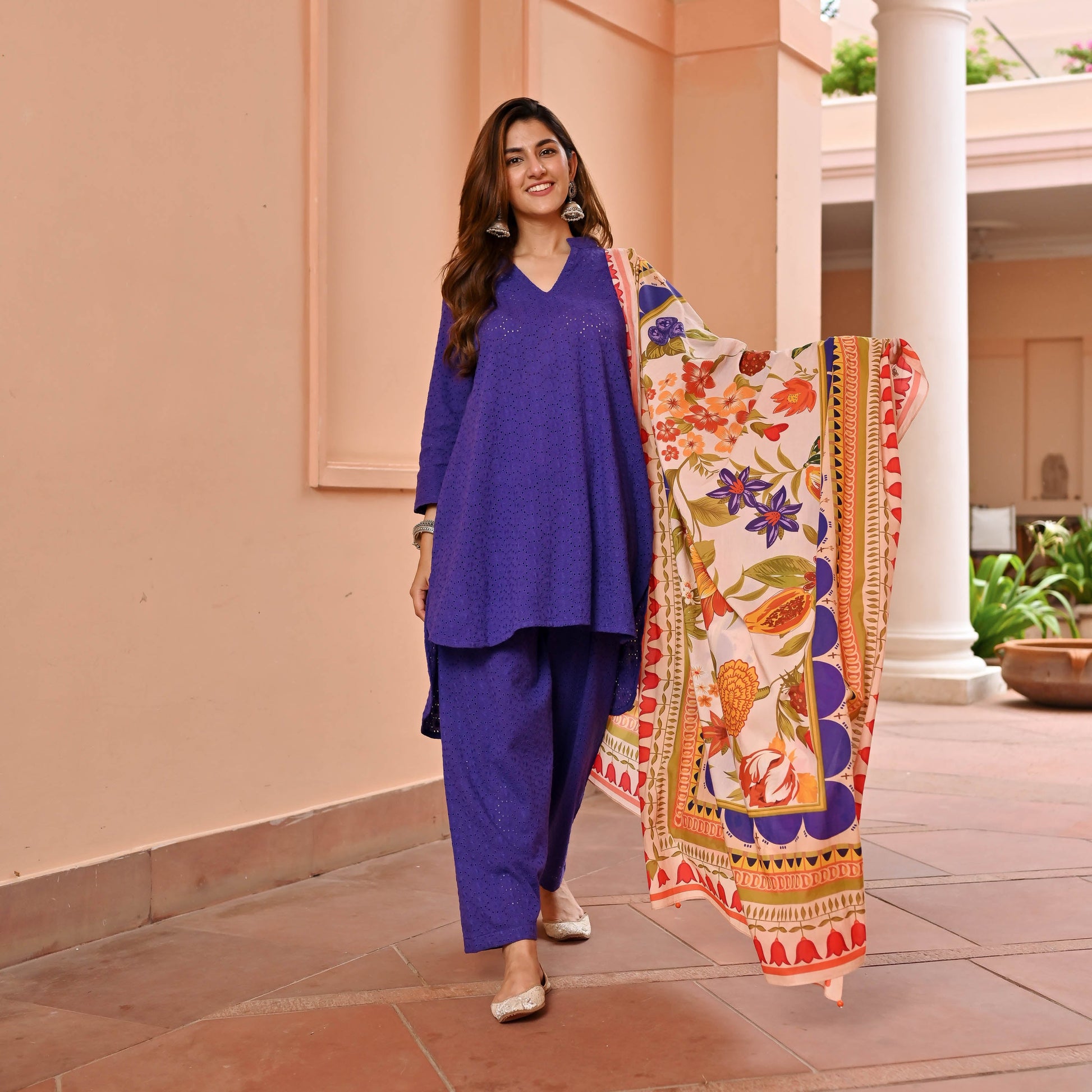 Shine bright in the Purple Cotton Schiffli Suit Set! Crafted from plush electric purple cotton schiffli, this set features a loose-fit straight kurta with a chic mandarin collar, V-neckline, and a playful high-low hemline. The three-quarter cuffed sleeves add a trendy touch. Paired with matching pants and a vibrant multicolor floral printed dupatta, it’s a dazzling choice for effortless style!