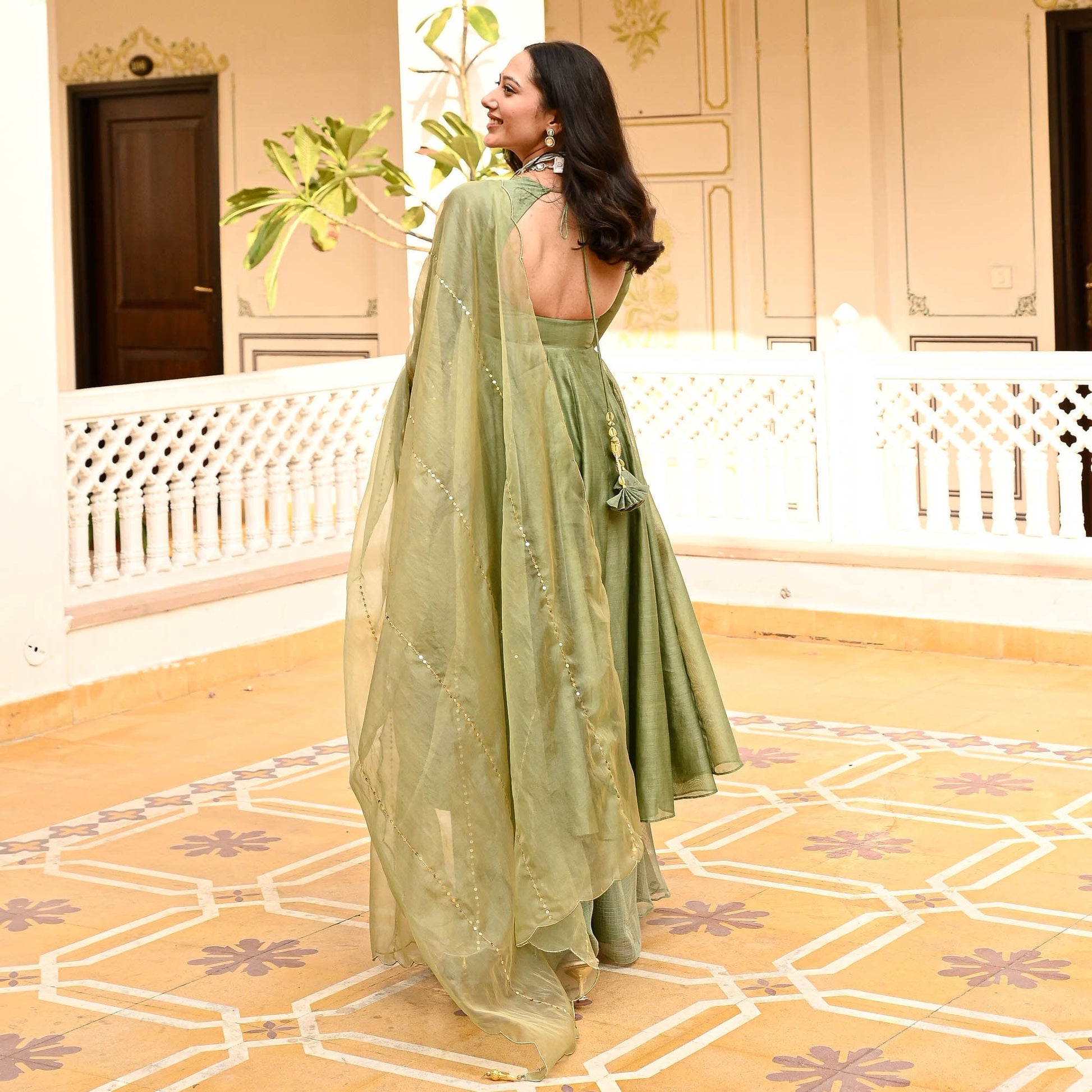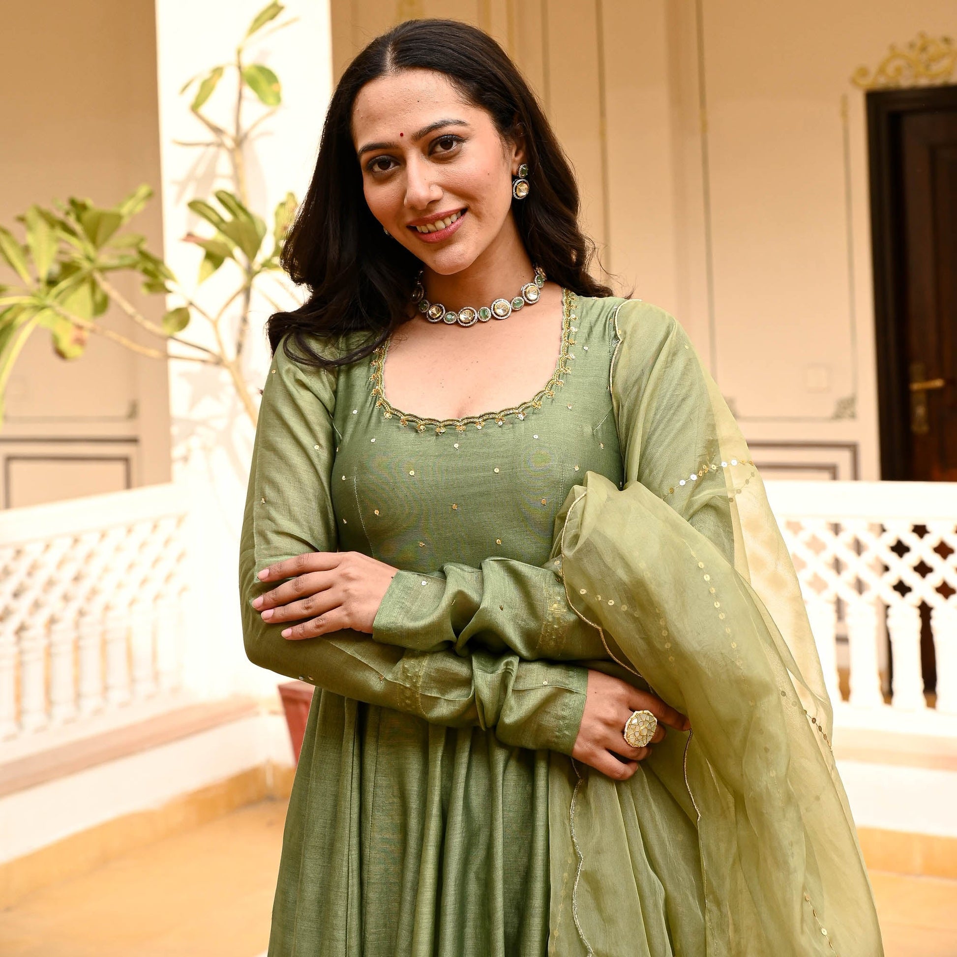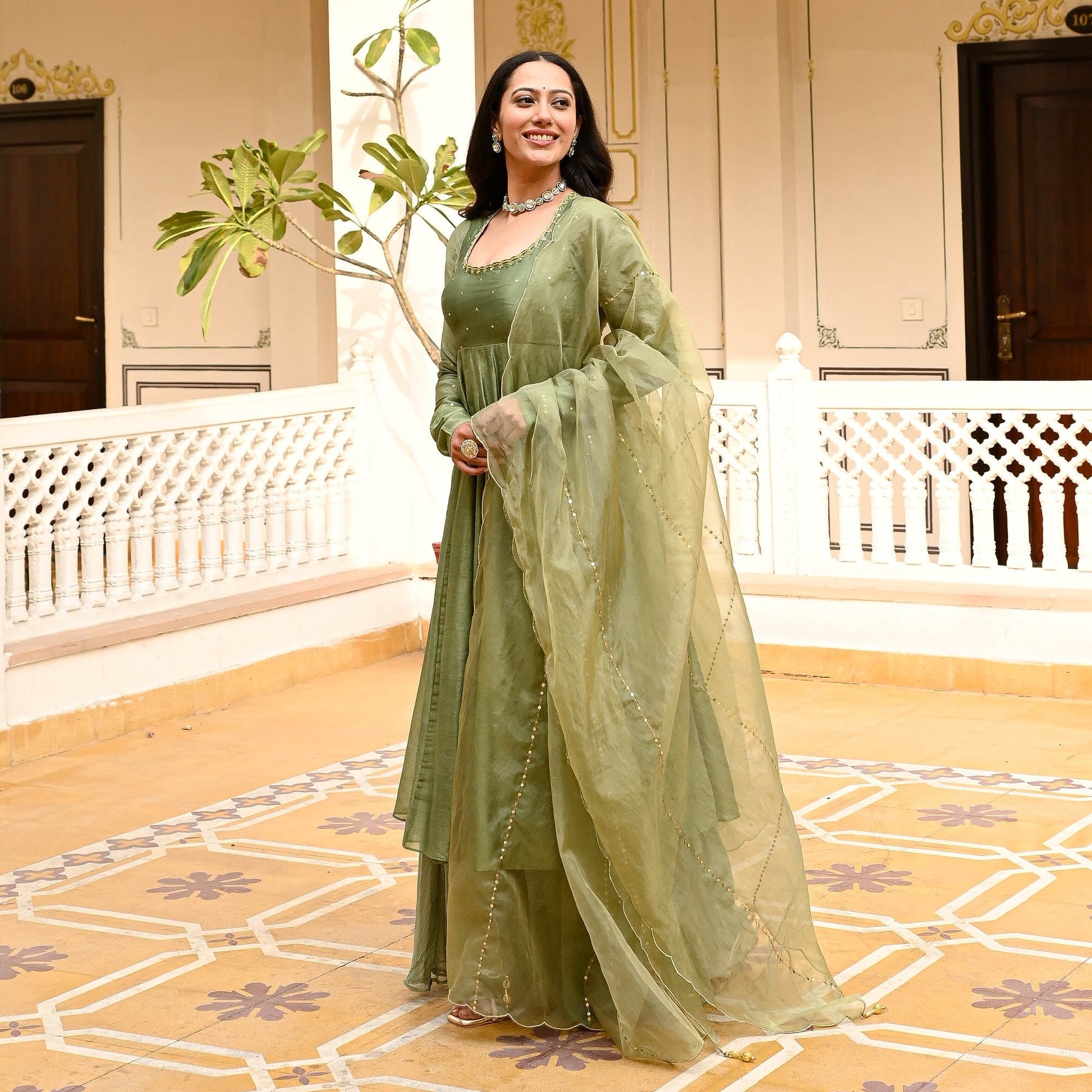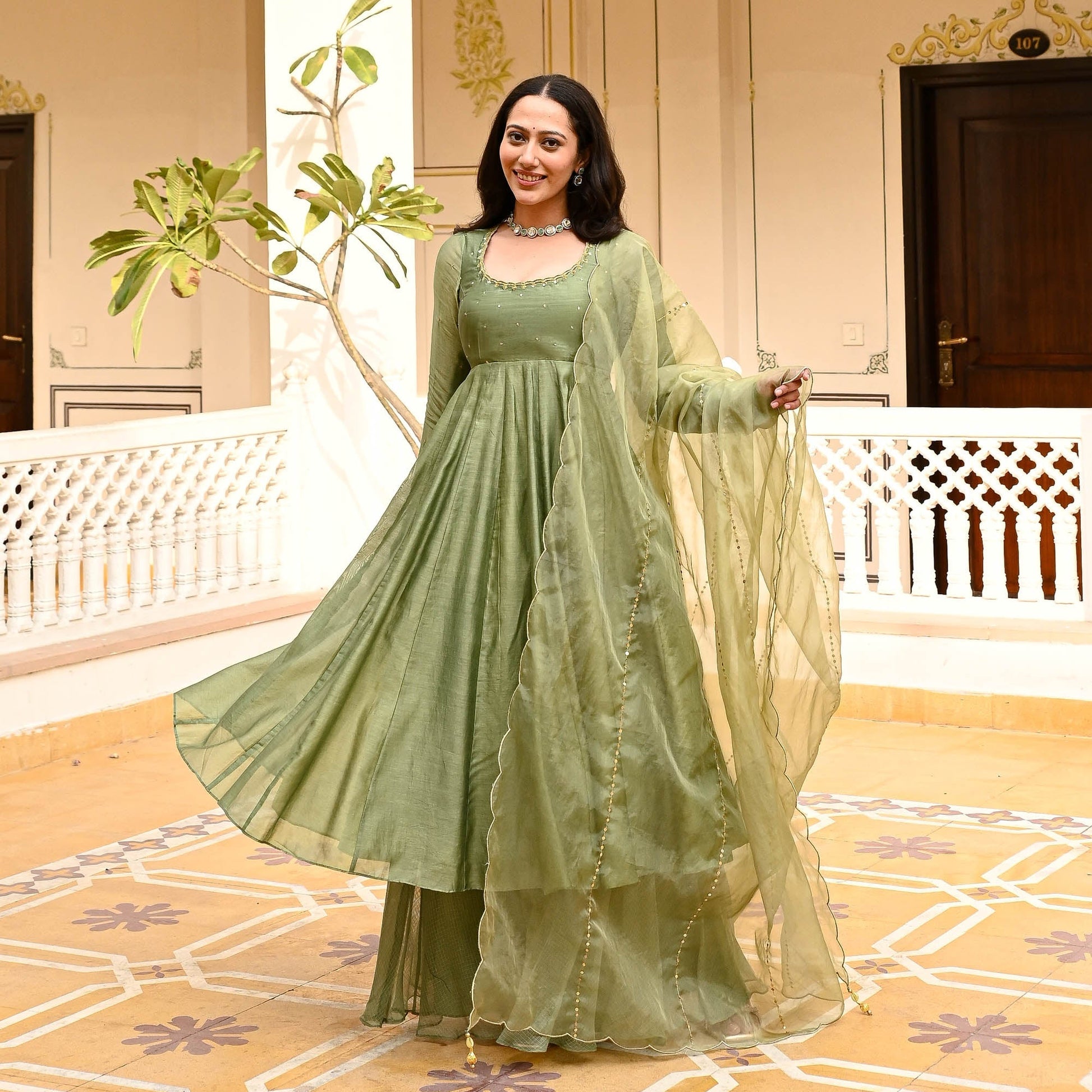Indulge in the timeless elegance of our Raas Suit Set, meticulously crafted from sumptuous chanderi fabrics for an unparalleled touch of luxury. The flared kurta boasts a graceful scoop neck adorned with exquisite embroidery along the neckline, complemented by delicate embellishments on the yoke, exuding an aura of refined charm. Embrace sophistication with full sleeves that add a regal flair to the ensemble. Paired harmoniously with a matching flared Kota Doria palazzo, the ensemble exudes fluidity and grace with every step. Complete the ensemble with an ethereal organza dupatta featuring scalloped edges and intricate embellishments throughout, elevating your look to unparalleled heights of opulence and style. Revel in the beauty of tradition with our Raas Suit Set, a masterpiece of craftsmanship and elegance.