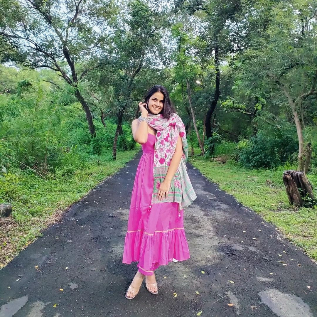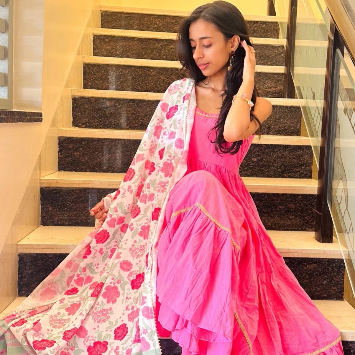 The Rinni Cotton Suit Set Trio, crafted from the finest cotton fabrics, showcases stunning pink hues accentuated by a strappy kurta with delicate lace detailing around the neckline and a flared hemline. Paired with matching pants and a contrasting ethnic motif printed dupatta, this set beautifully combines playful charm with traditional elegance, perfect for any festive occasion.