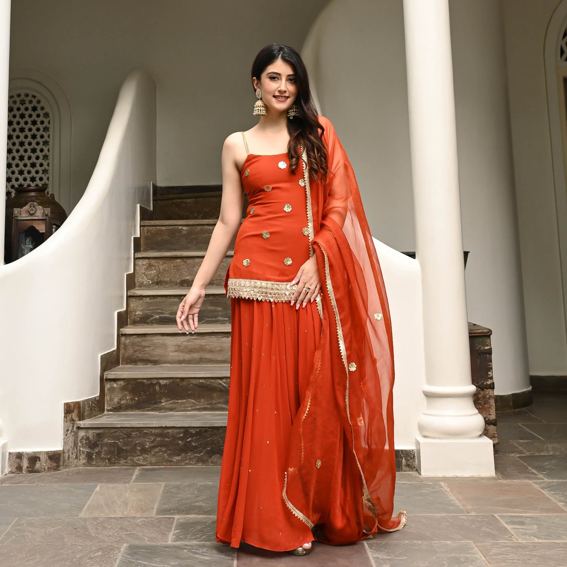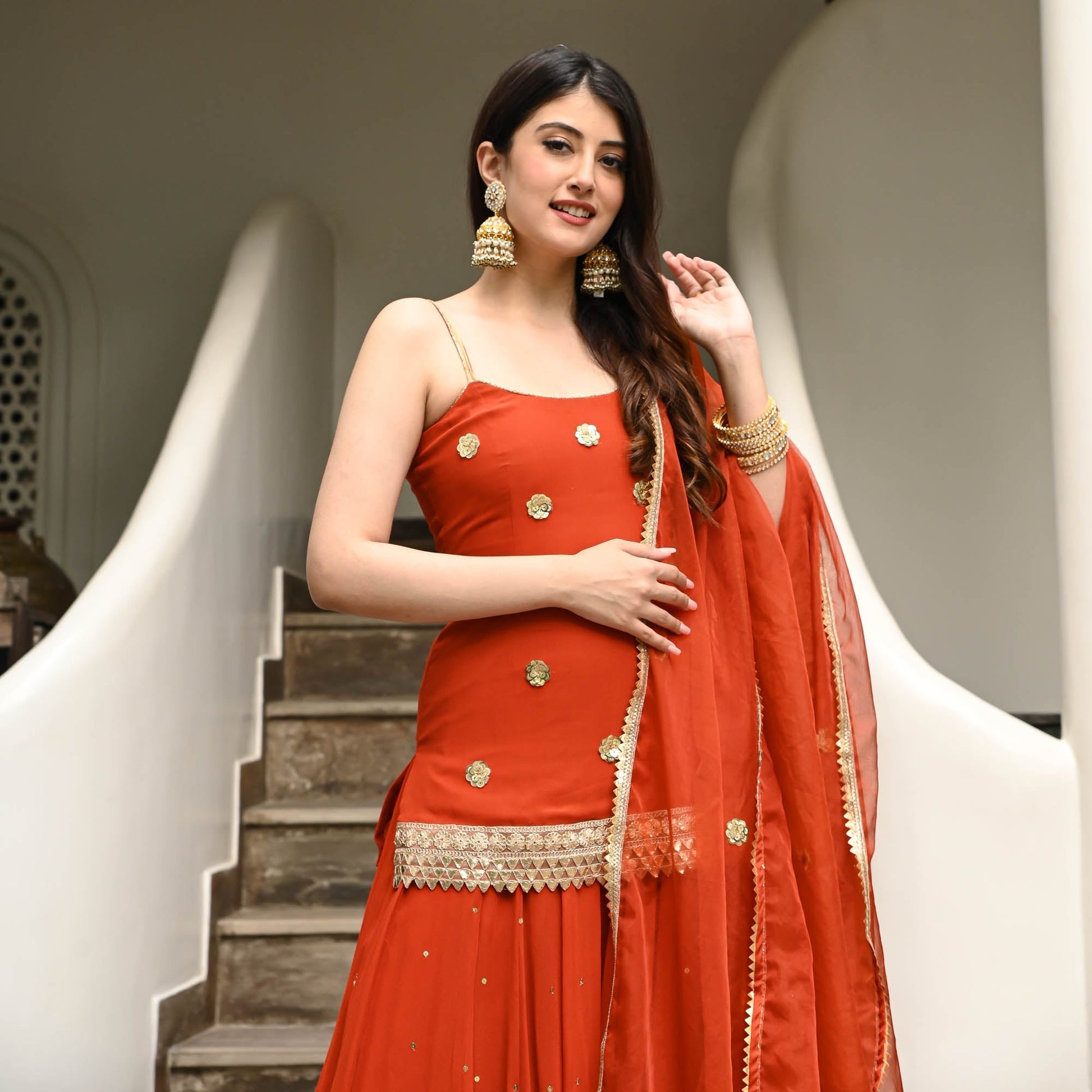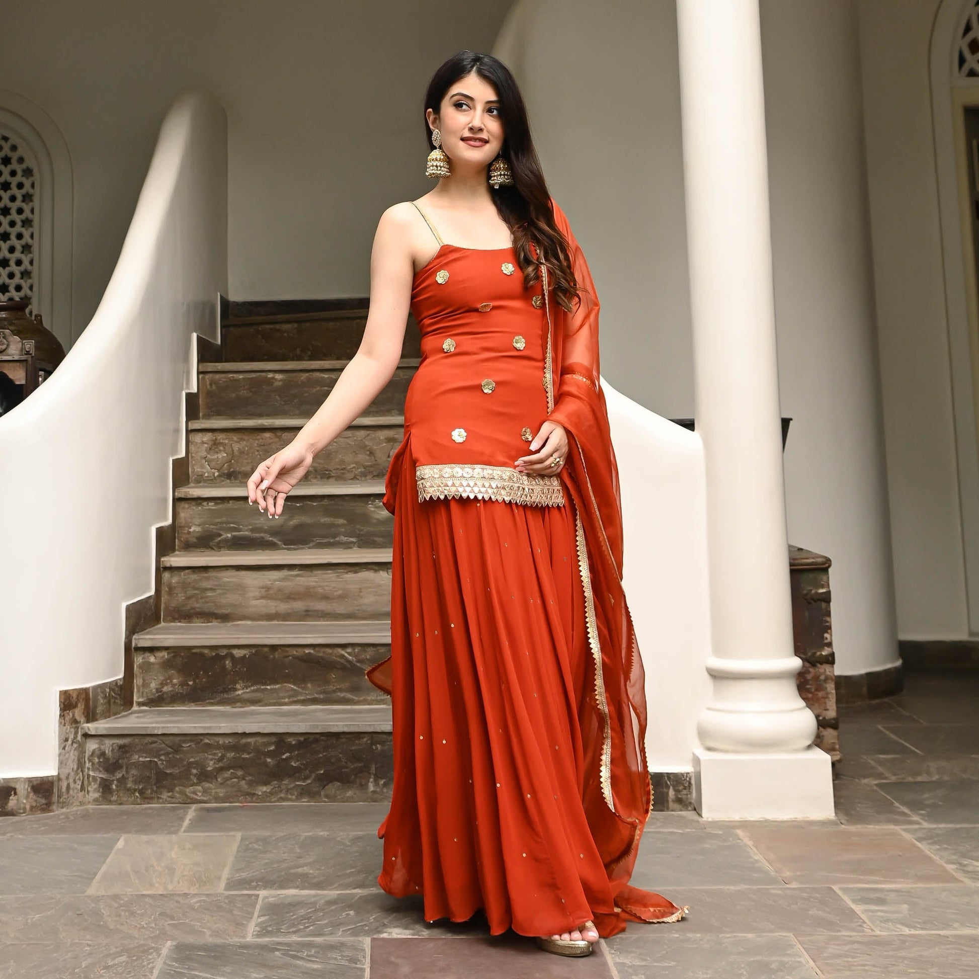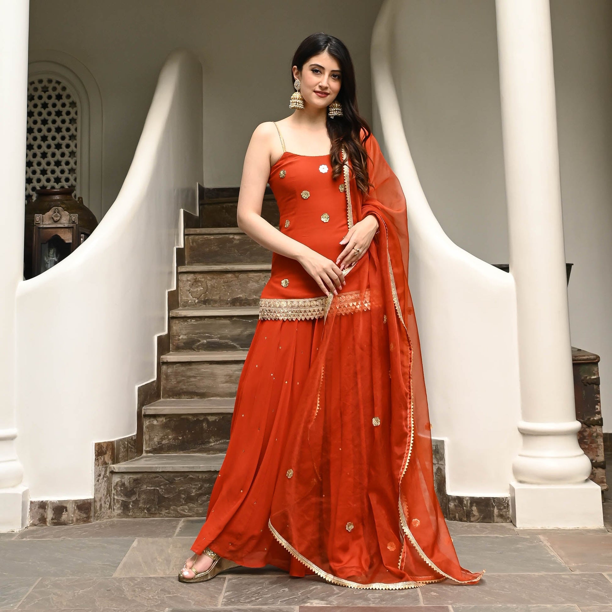 Elevate your style game with the Roli Suit Set, a true embodiment of understated elegance. Crafted from a captivating rust-orange georgette fabric, this ensemble exudes warmth and charm. The outfit is adorned with intricate sequin work and strappy sleeves, adding a touch of glam to its timeless appeal.