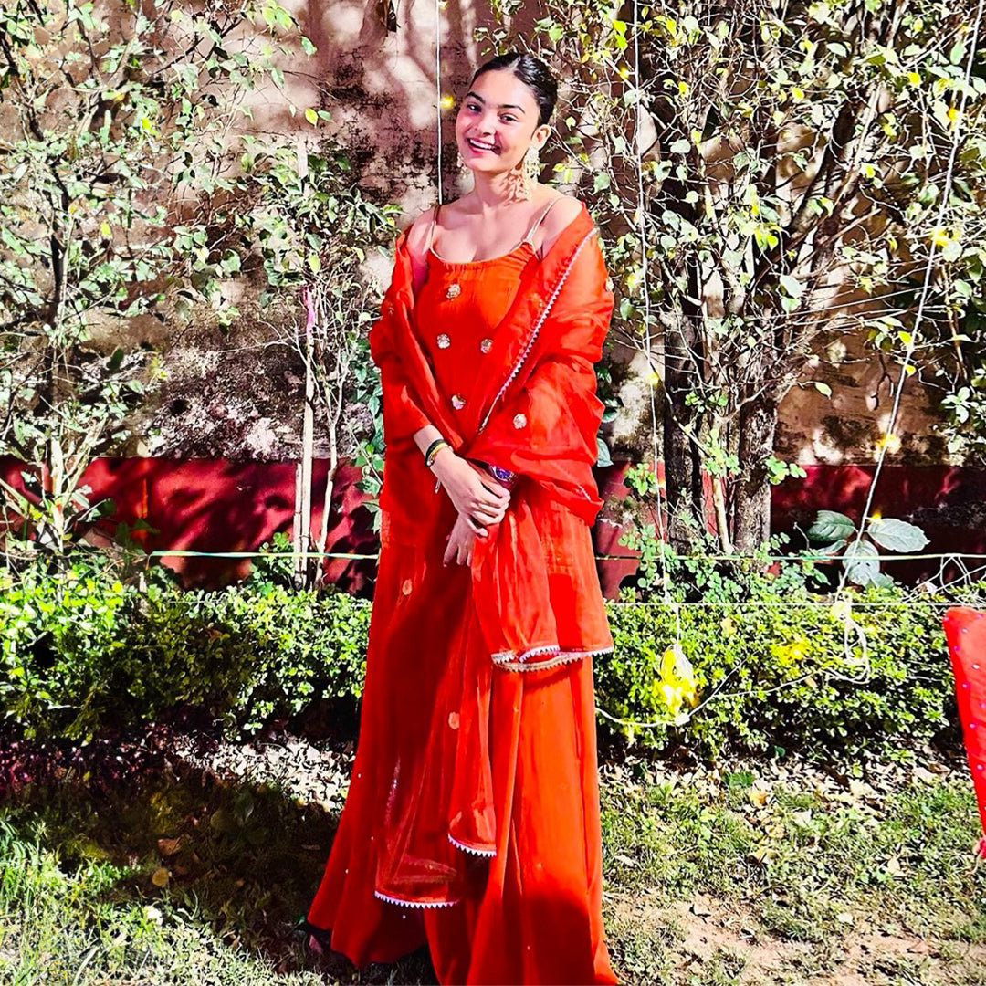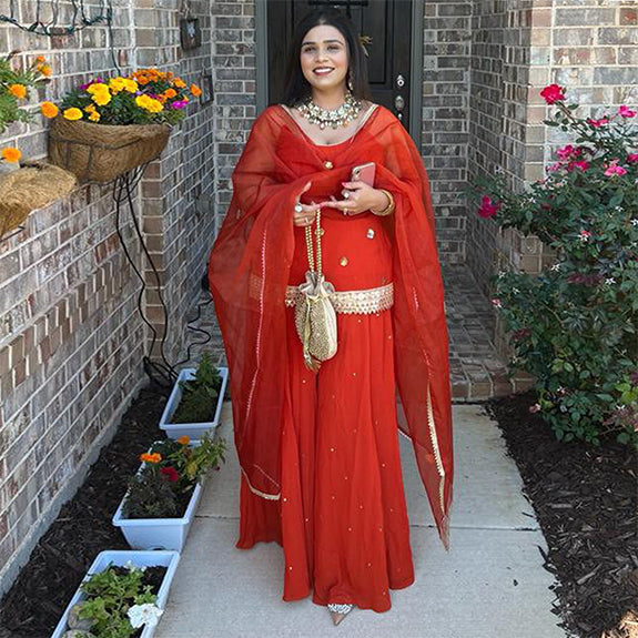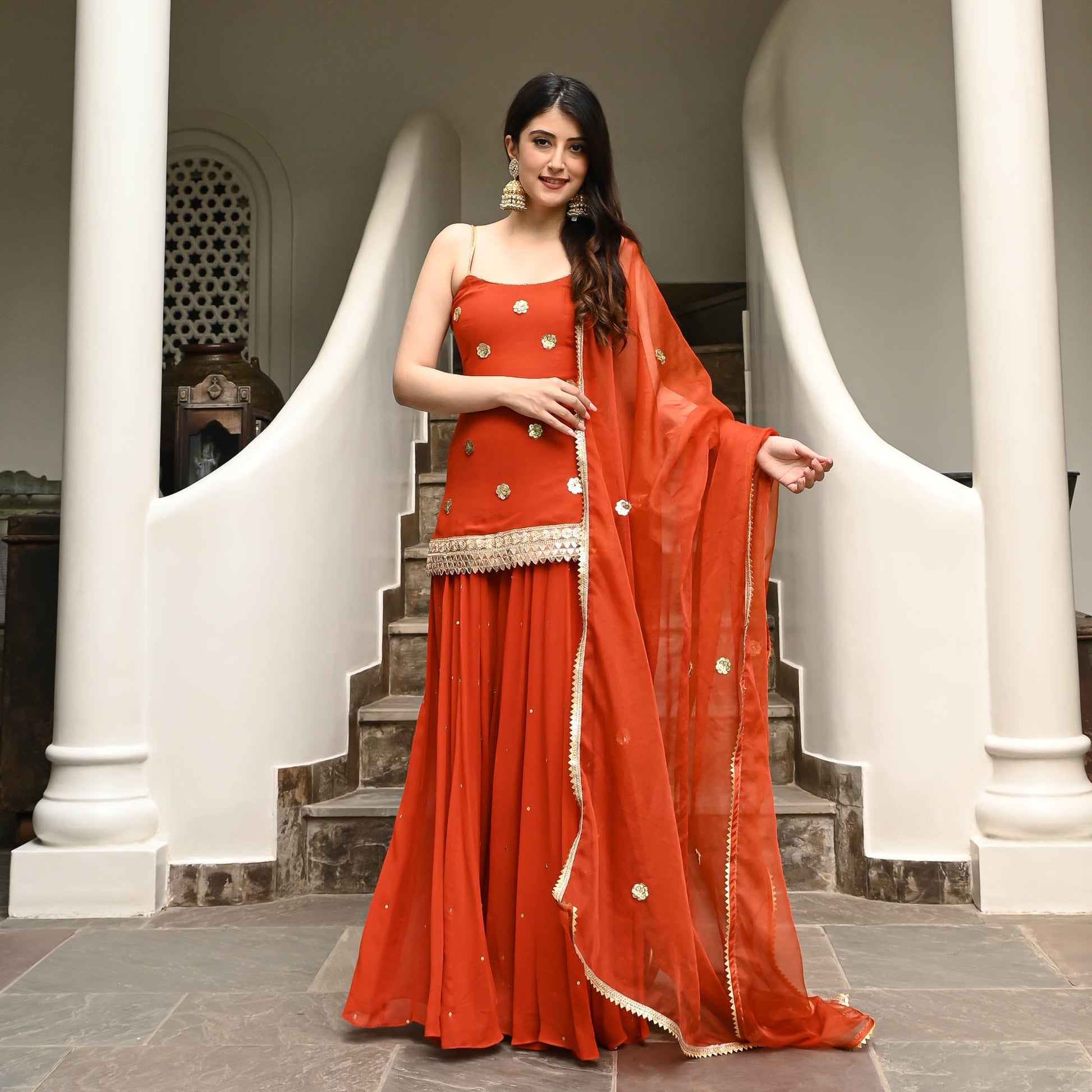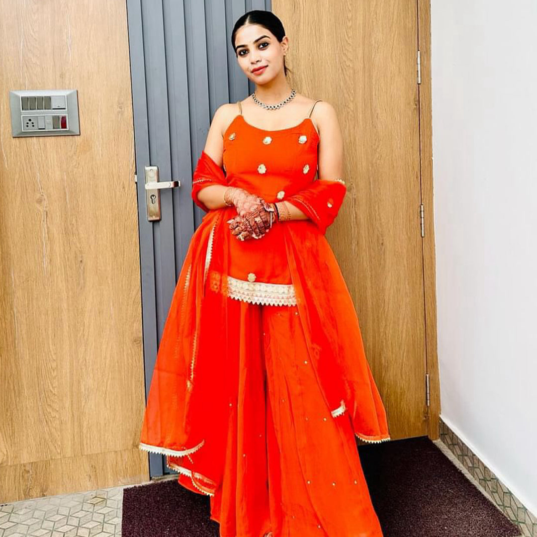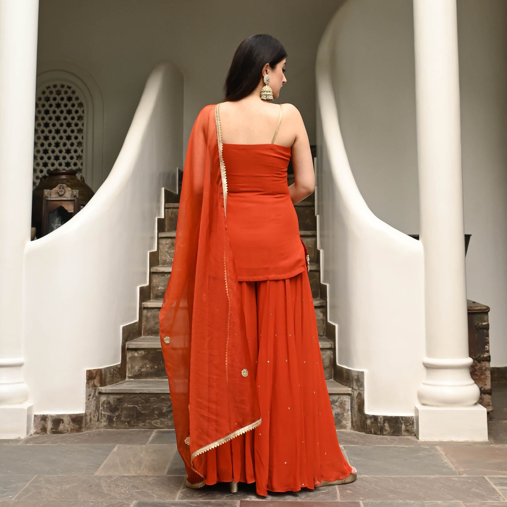 Elevate your style game with the Roli Suit Set, a true embodiment of understated elegance. Crafted from a captivating rust-orange georgette fabric, this ensemble exudes warmth and charm. The outfit is adorned with intricate sequin work and strappy sleeves, adding a touch of glam to its timeless appeal.