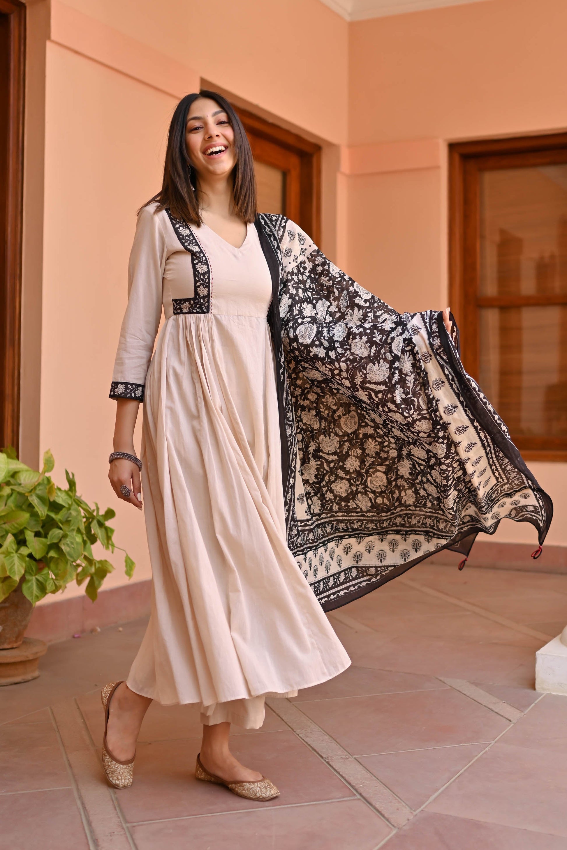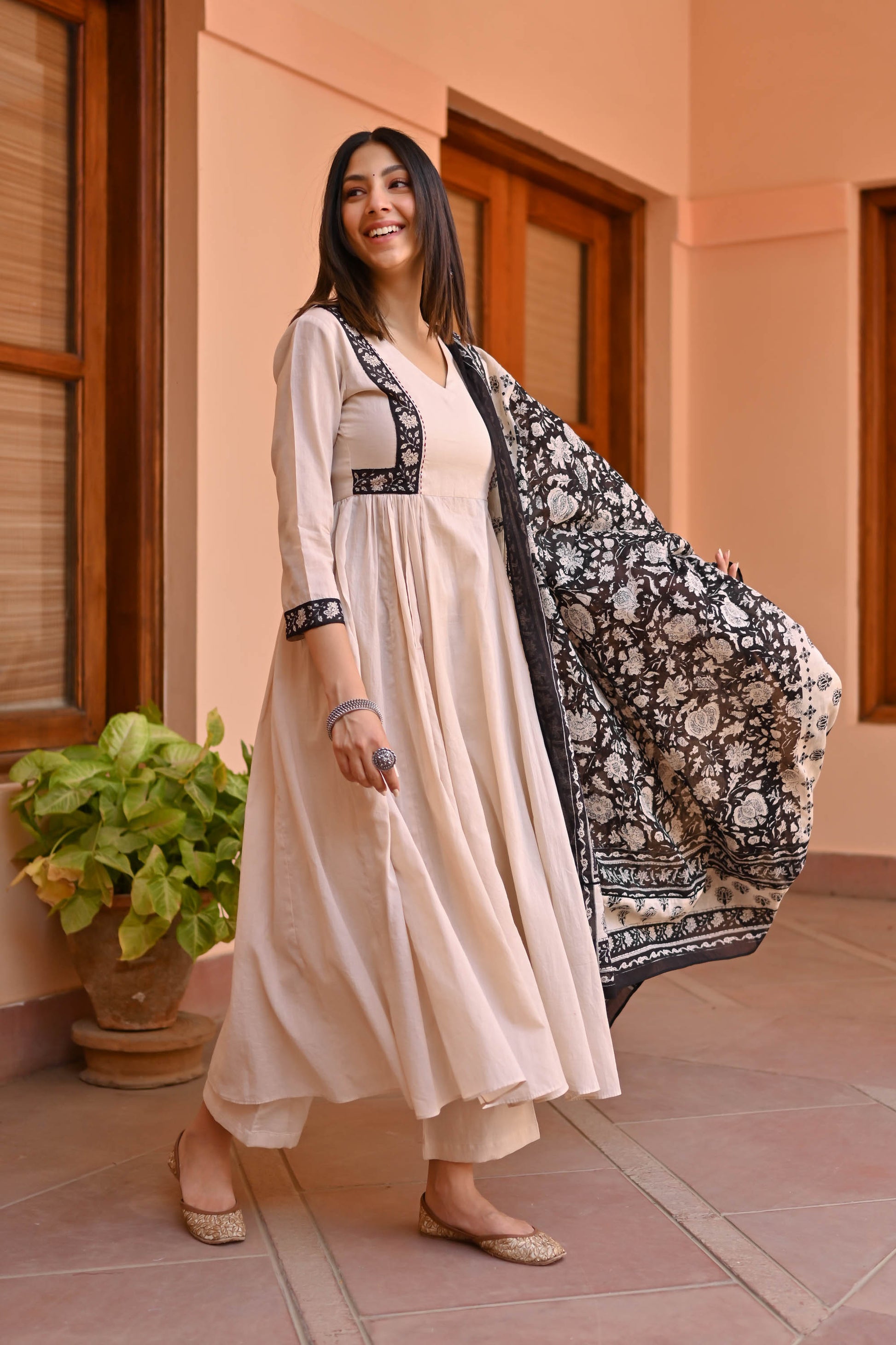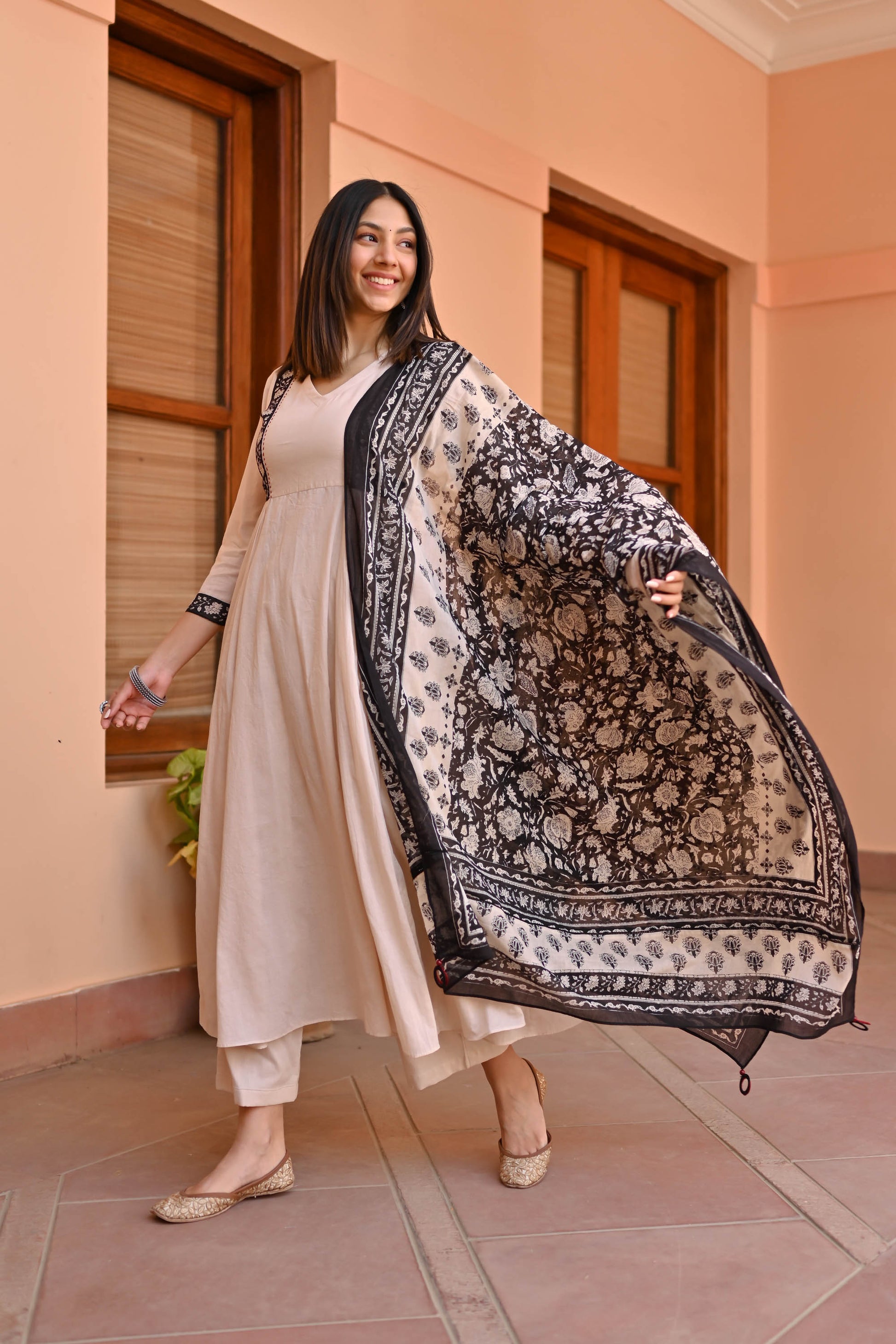 Indulge in elegance with the Rose Cotton Suit Set Trio. Meticulously crafted from premium cotton, its captivating beige tones exude sophistication. The flared kurta showcases a V-neckline, contrast panel detailing on the front yoke, and gathers beneath for a graceful silhouette. Paired with coordinating pants and an ethnic motif-printed dupatta, this ensemble epitomizes timeless charm for every occasion.