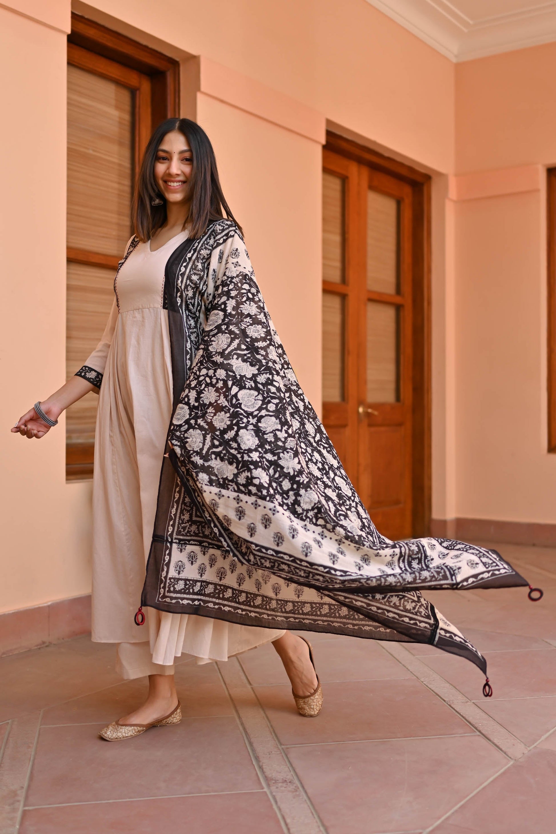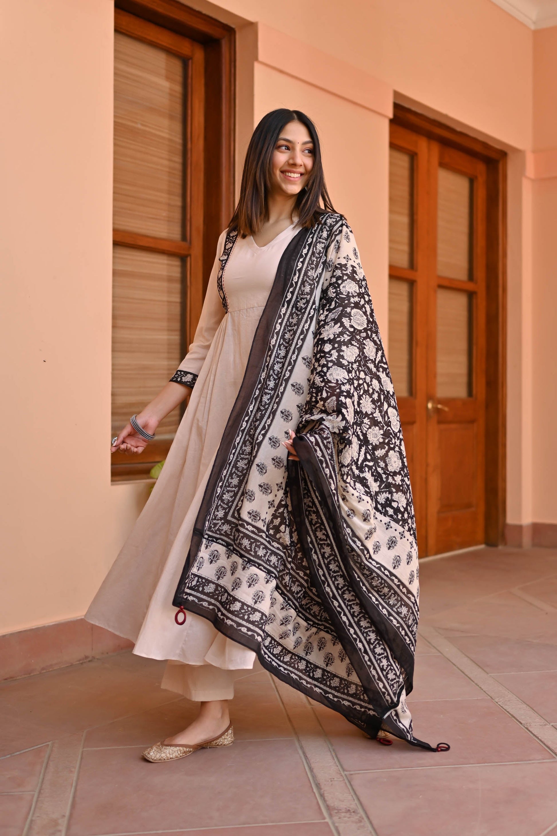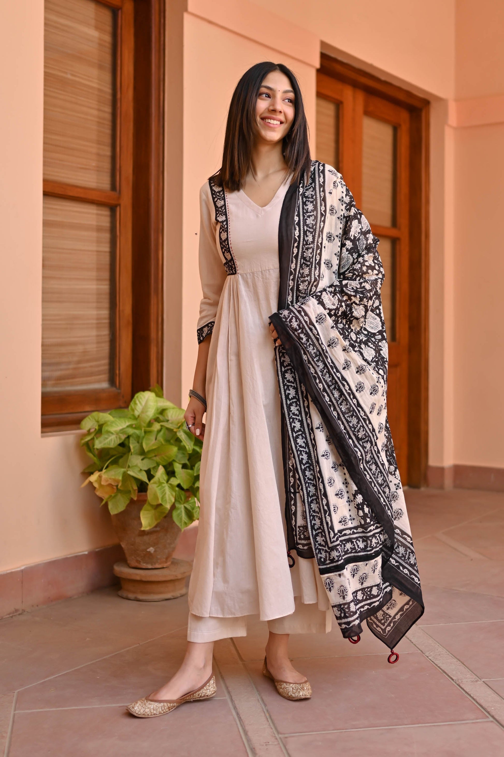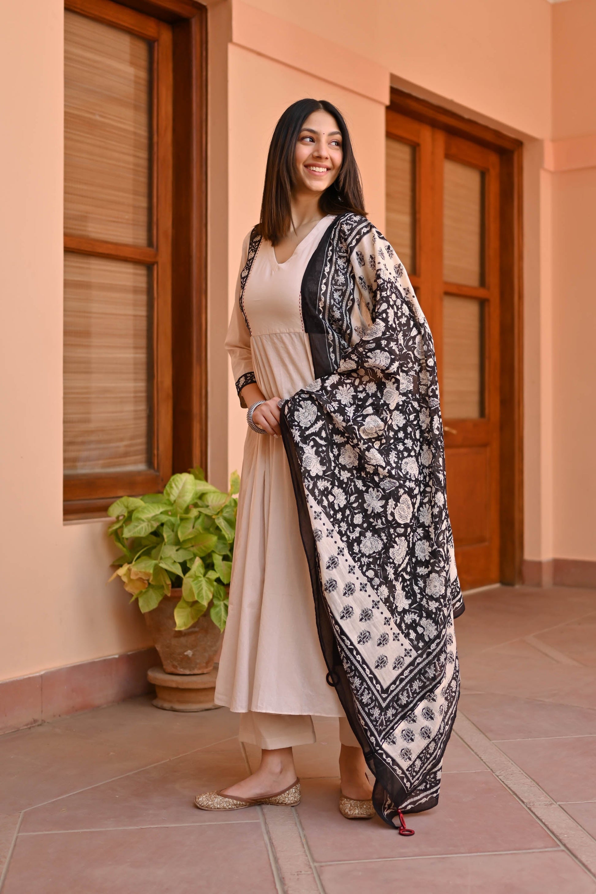 Indulge in elegance with the Rose Cotton Suit Set Trio. Meticulously crafted from premium cotton, its captivating beige tones exude sophistication. The flared kurta showcases a V-neckline, contrast panel detailing on the front yoke, and gathers beneath for a graceful silhouette. Paired with coordinating pants and an ethnic motif-printed dupatta, this ensemble epitomizes timeless charm for every occasion.
