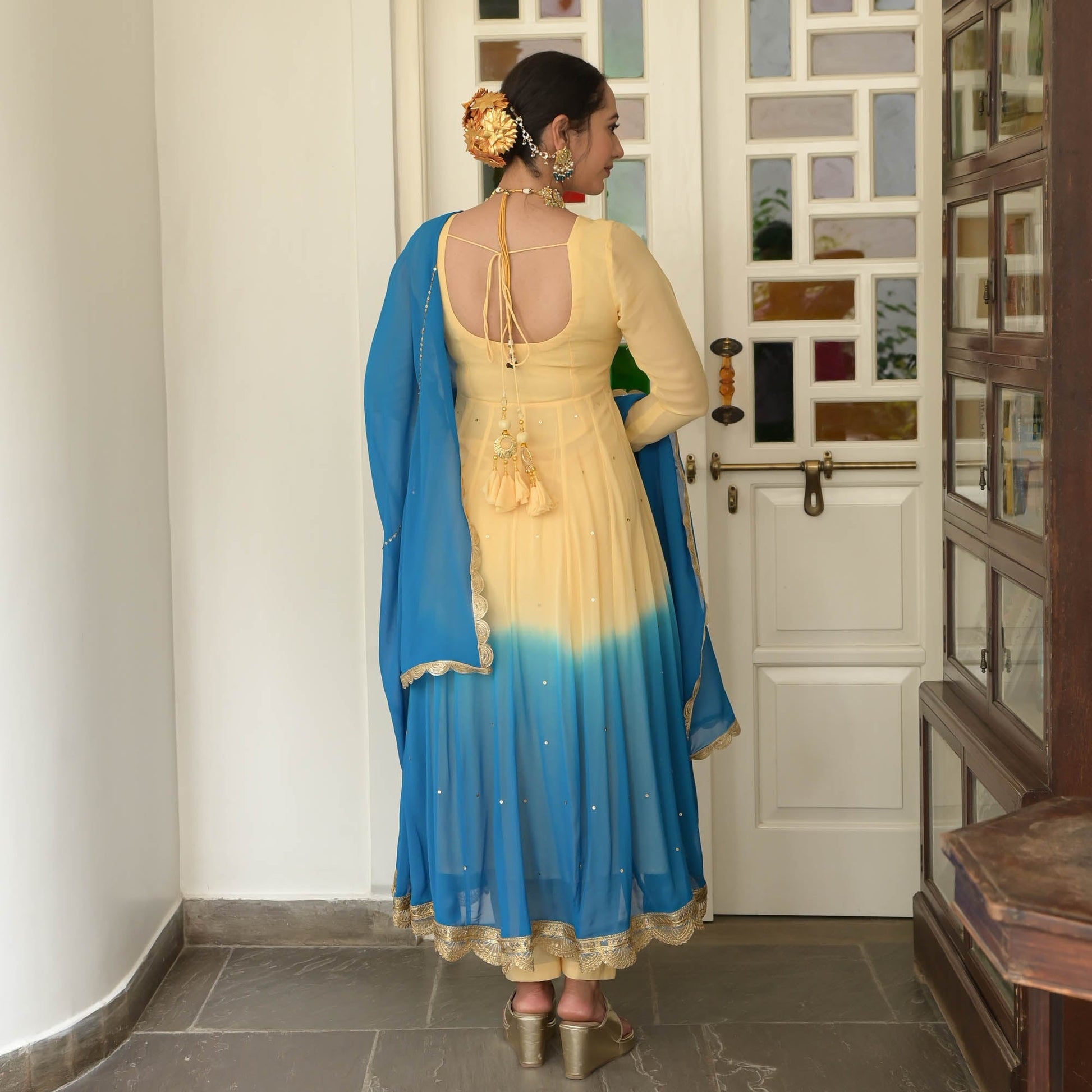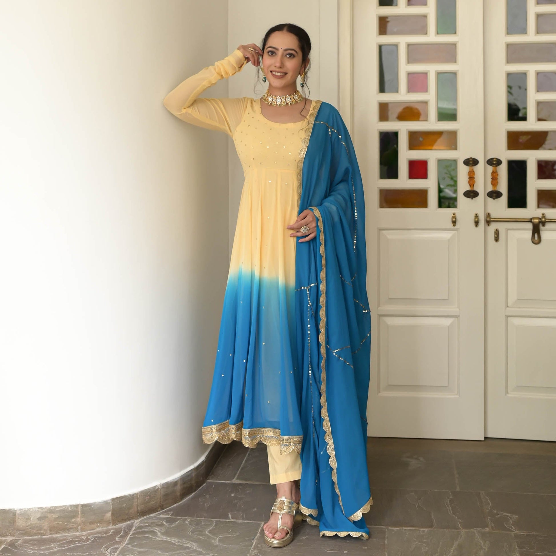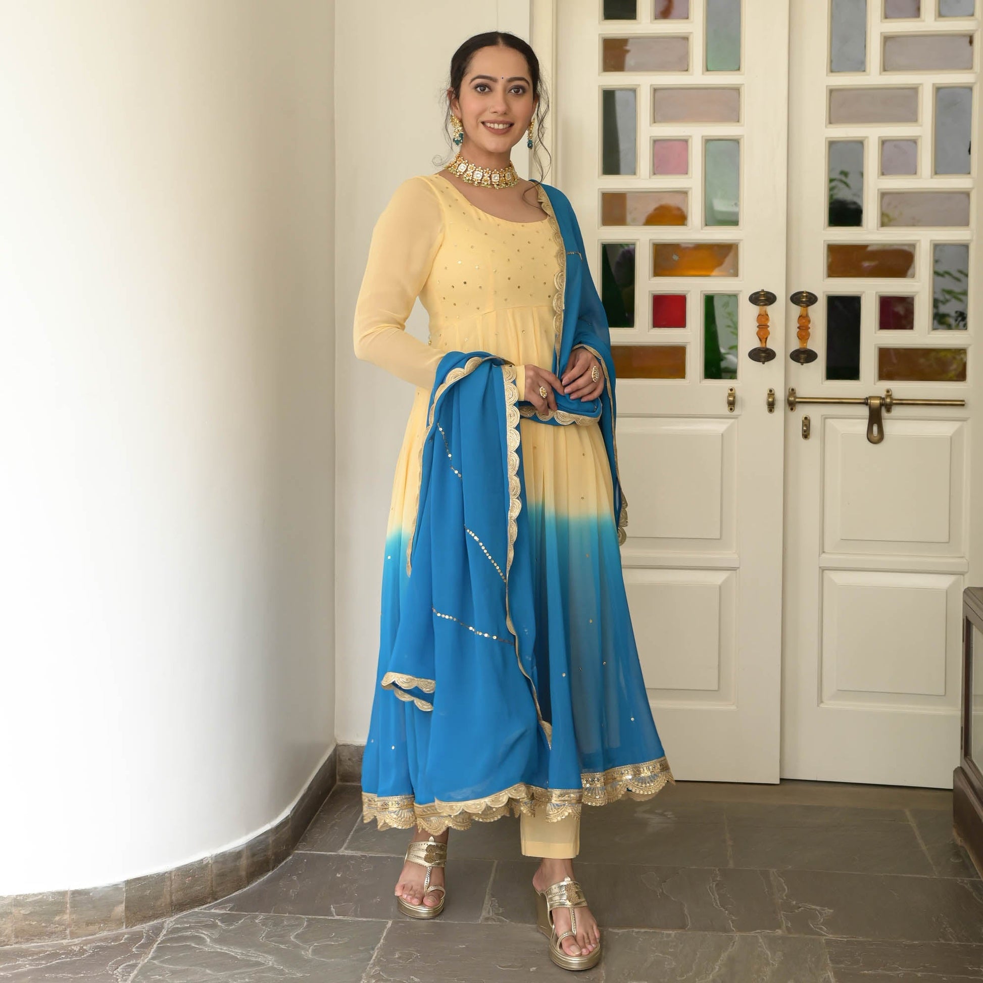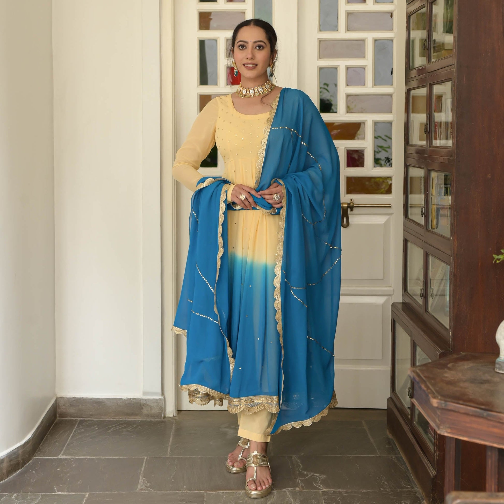 Make a striking entrance with our Rudra Suit Set, a harmonious blend of colours and craftsmanship. Crafted from a captivating yellow and blue ombre georgette fabric, this ensemble is a true work of art. It features intricate sequin and threadwork that adds a touch of opulence to its ethereal charm.