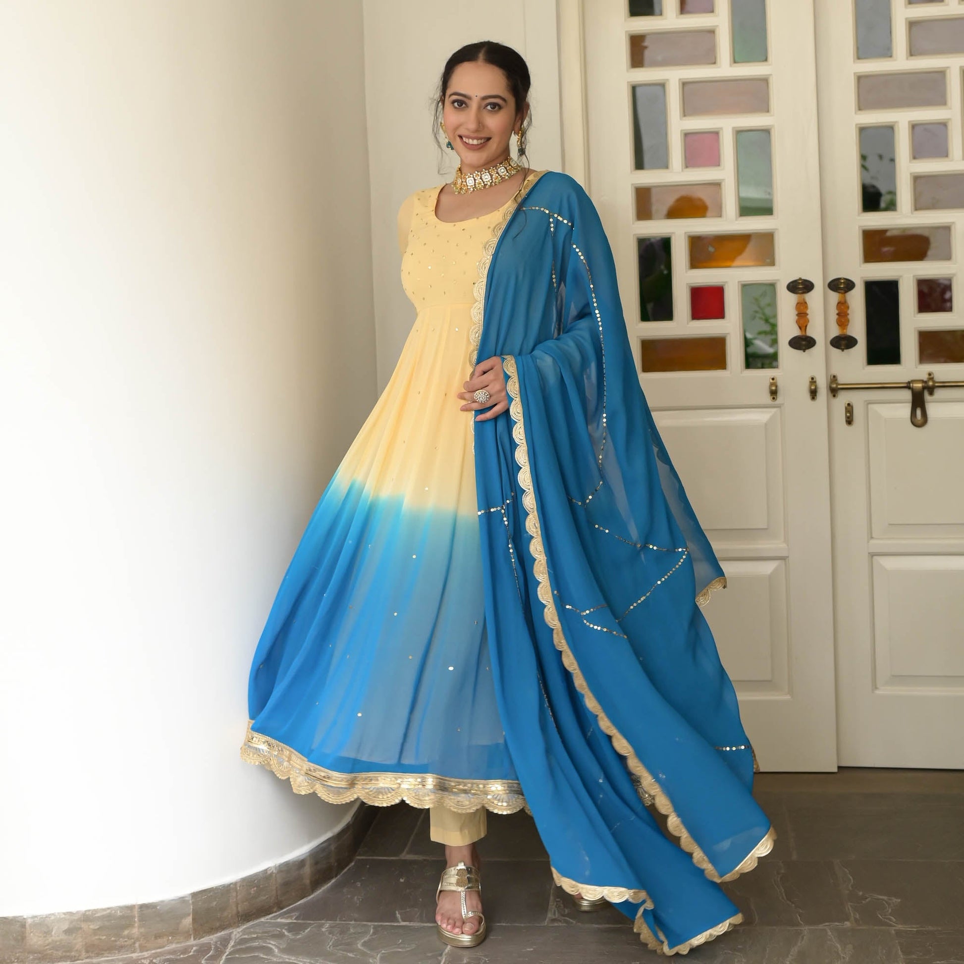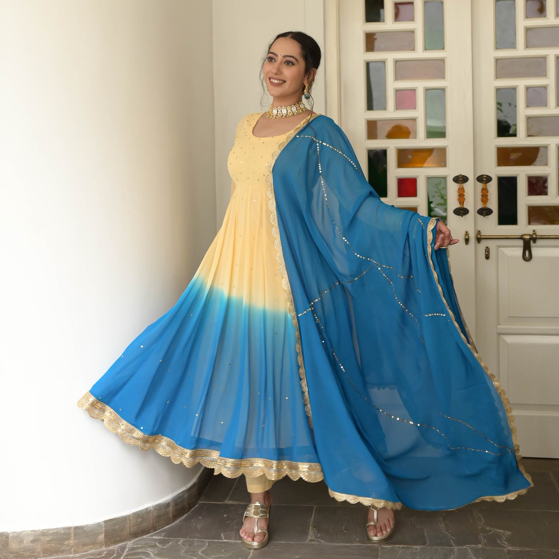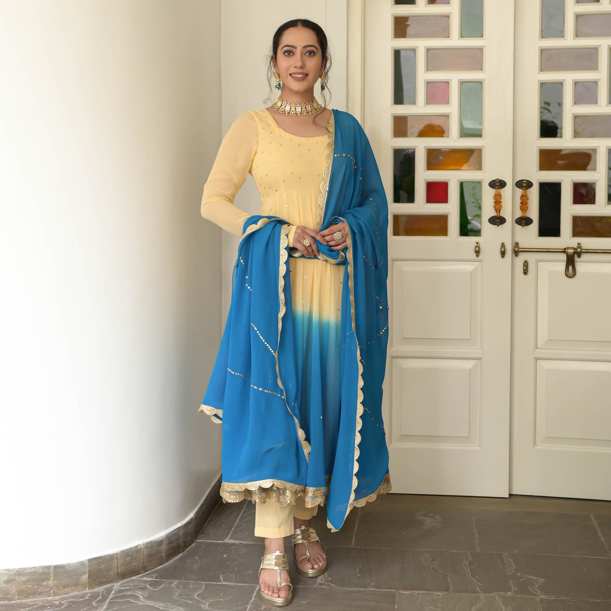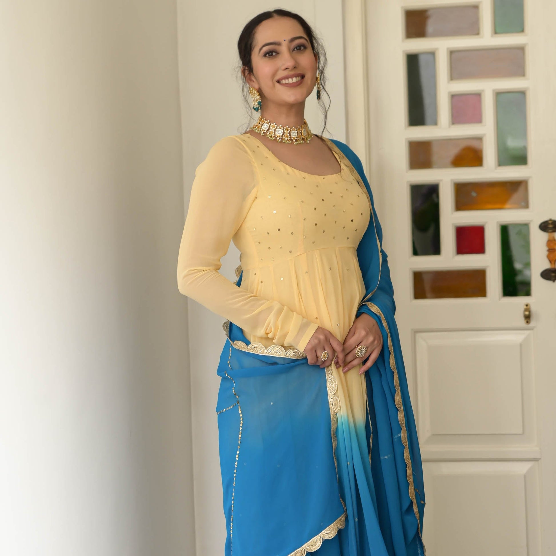 Make a striking entrance with our Rudra Suit Set, a harmonious blend of colours and craftsmanship. Crafted from a captivating yellow and blue ombre georgette fabric, this ensemble is a true work of art. It features intricate sequin and threadwork that adds a touch of opulence to its ethereal charm.