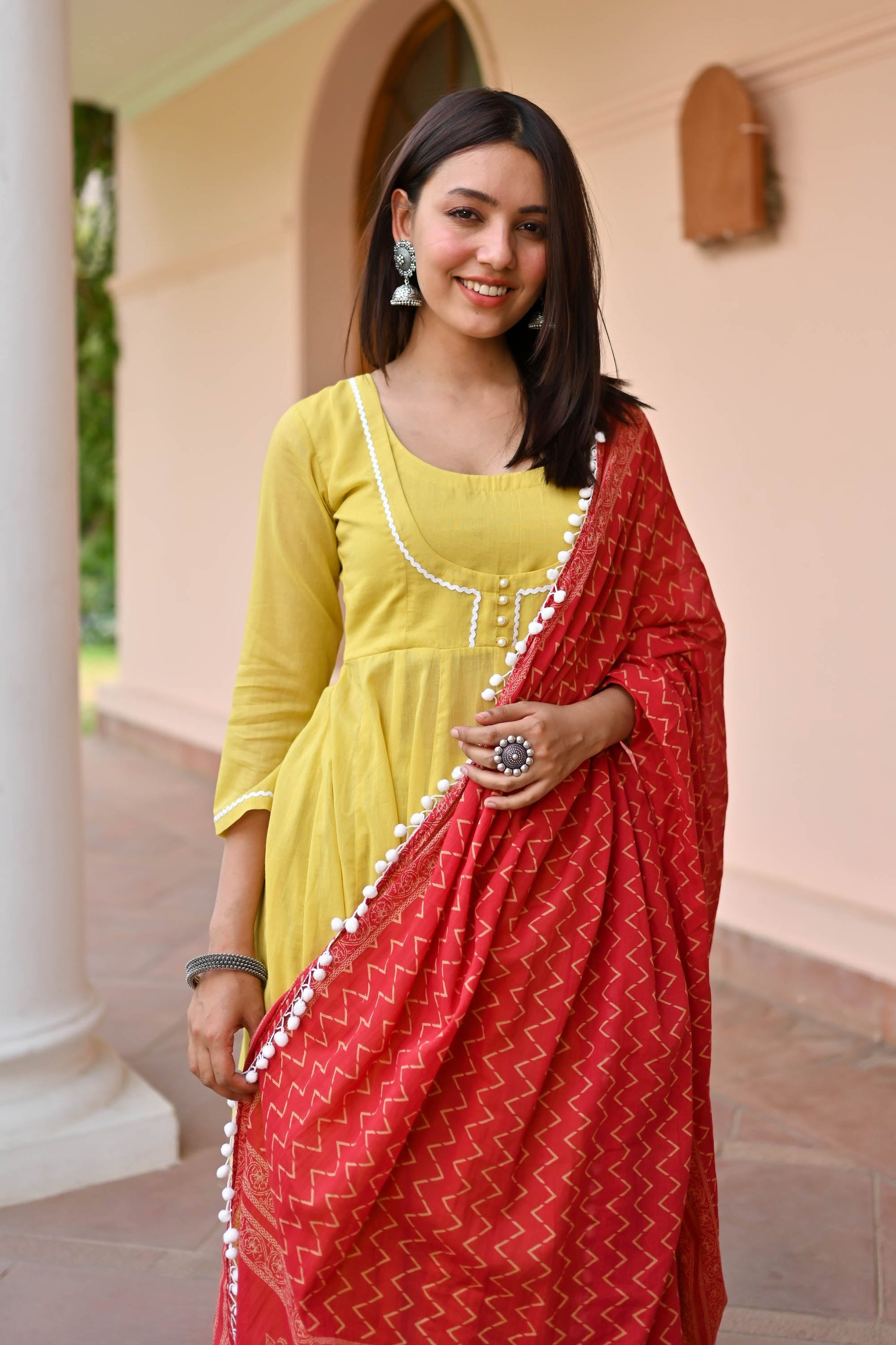 Introducing the Rutuja Cotton Suit Set Of Three, a blend of luxury and style. Crafted from premium cotton, this vibrant mustard suit showcases a round neckline, overlap yoke with crochet lace and buttons, three-quarter sleeves, and a flared hemline. Paired with matching pants and an ethnic motif printed dupatta edged with crochet lace, it exudes elegance and charm for any occasion.