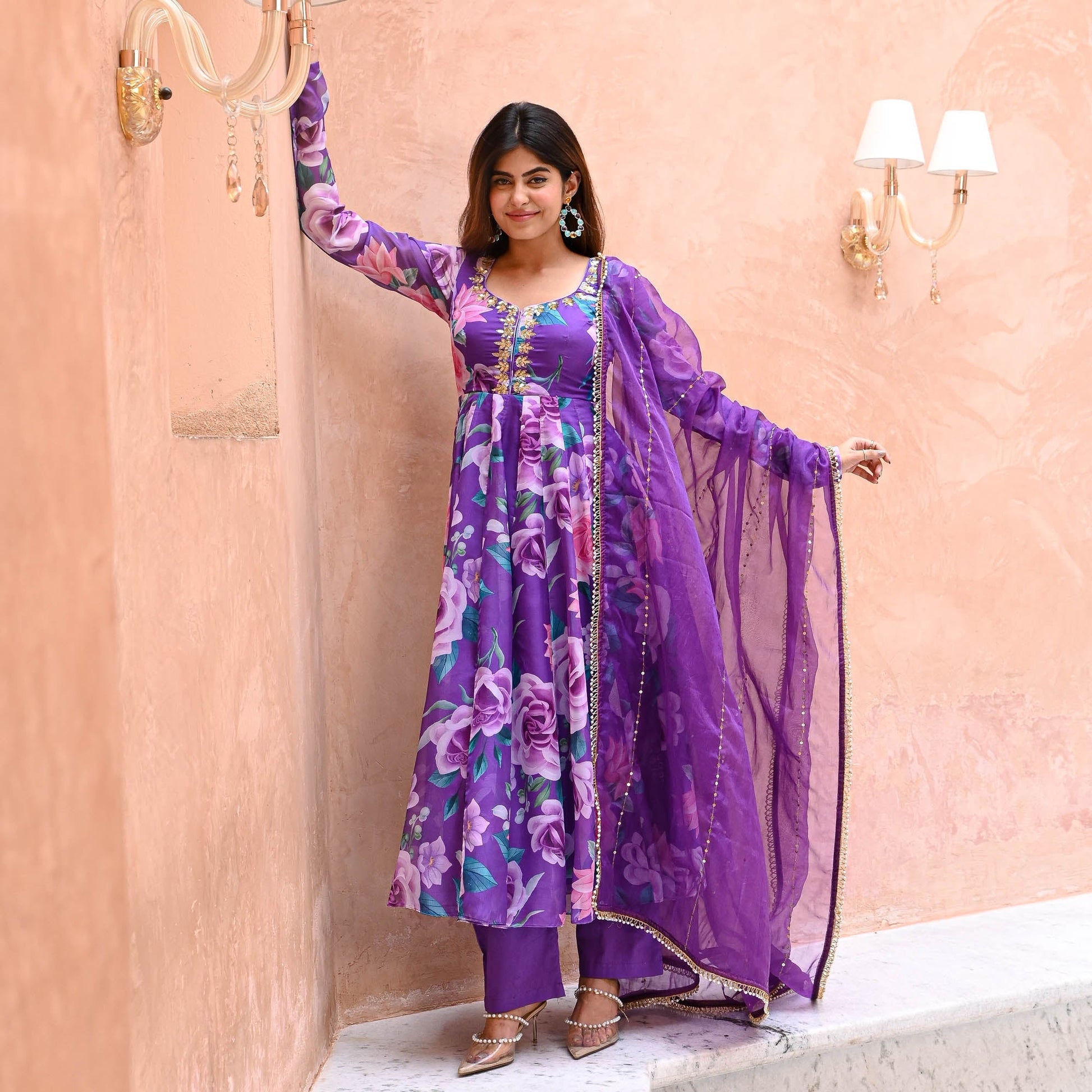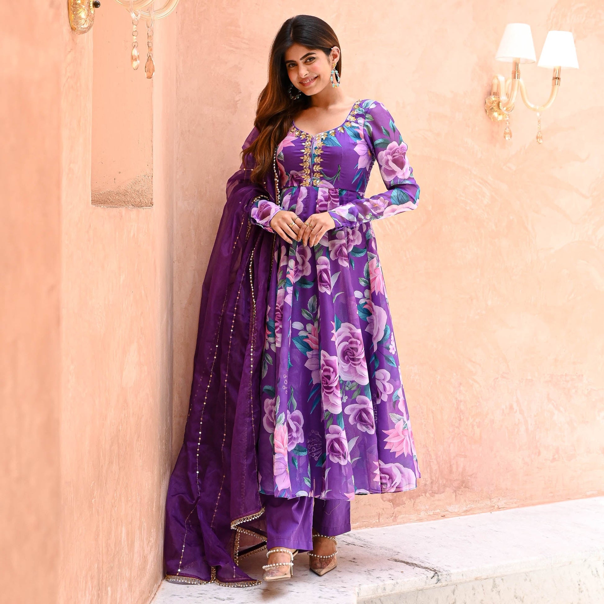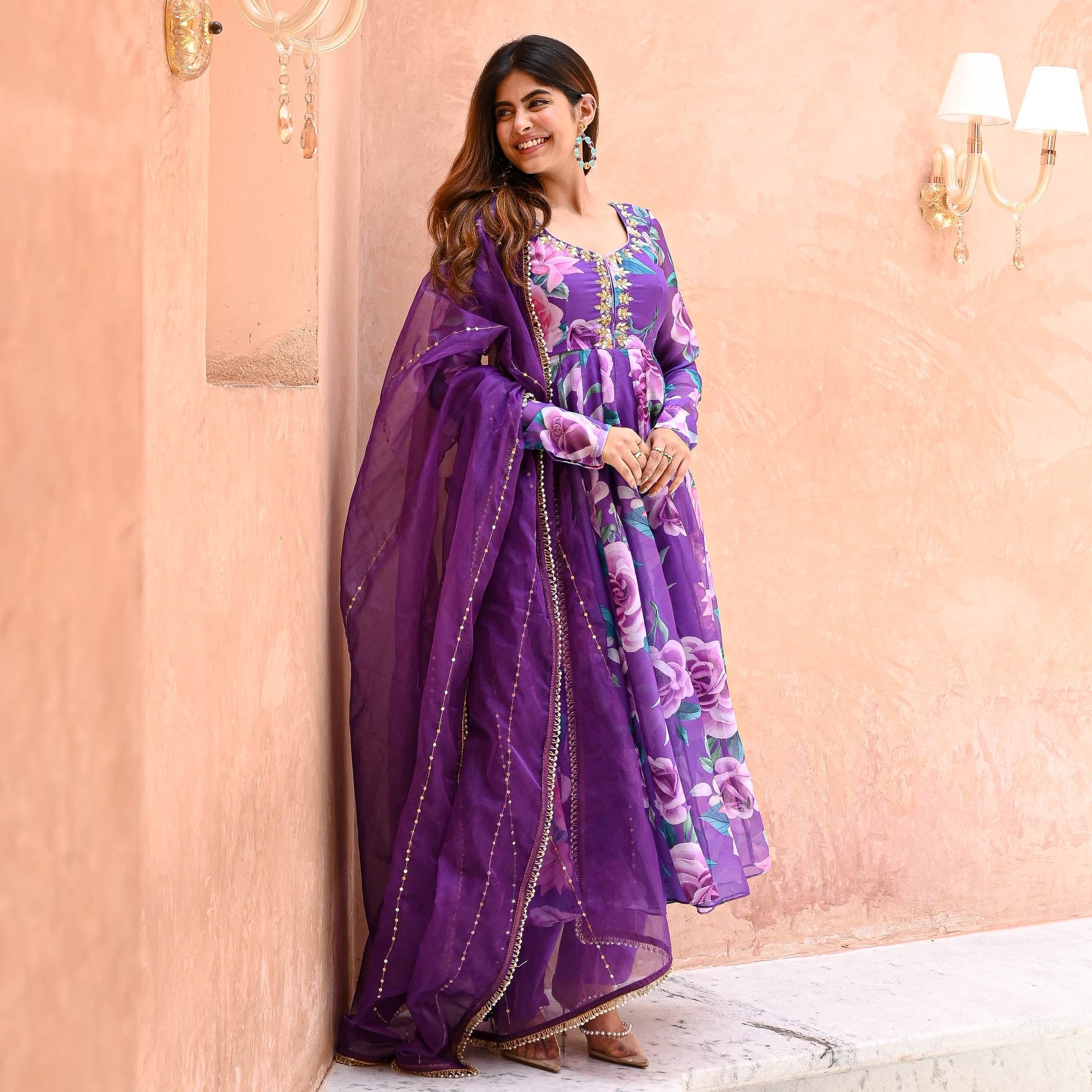 Saavan Suit Set exudes elegance with its luxurious digitally printed vibrant purple organza fabric adorned with lively floral prints. The flared kurta features an embellished U-neckline and gracefully bunched full sleeves. Complemented by matching flared palazzo pants, the ensemble is completed with an organza dupatta embellished with intricate lace details, perfect for a refined and captivating look.