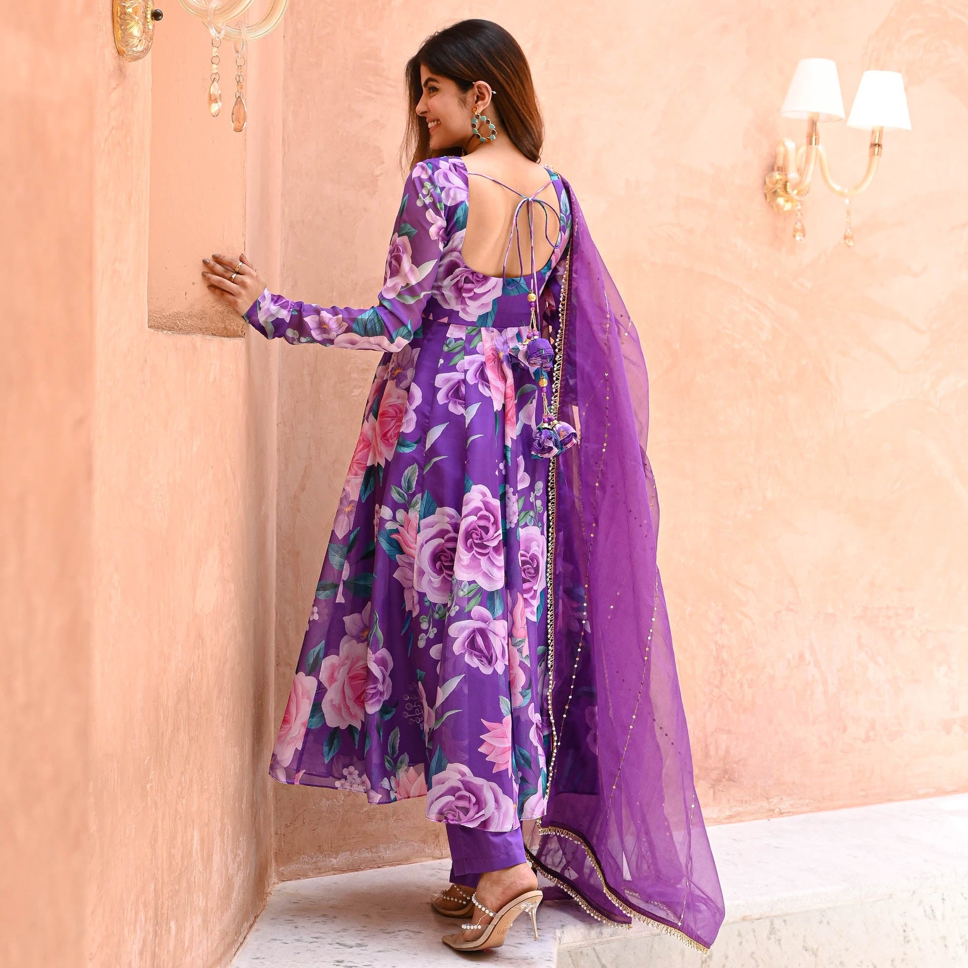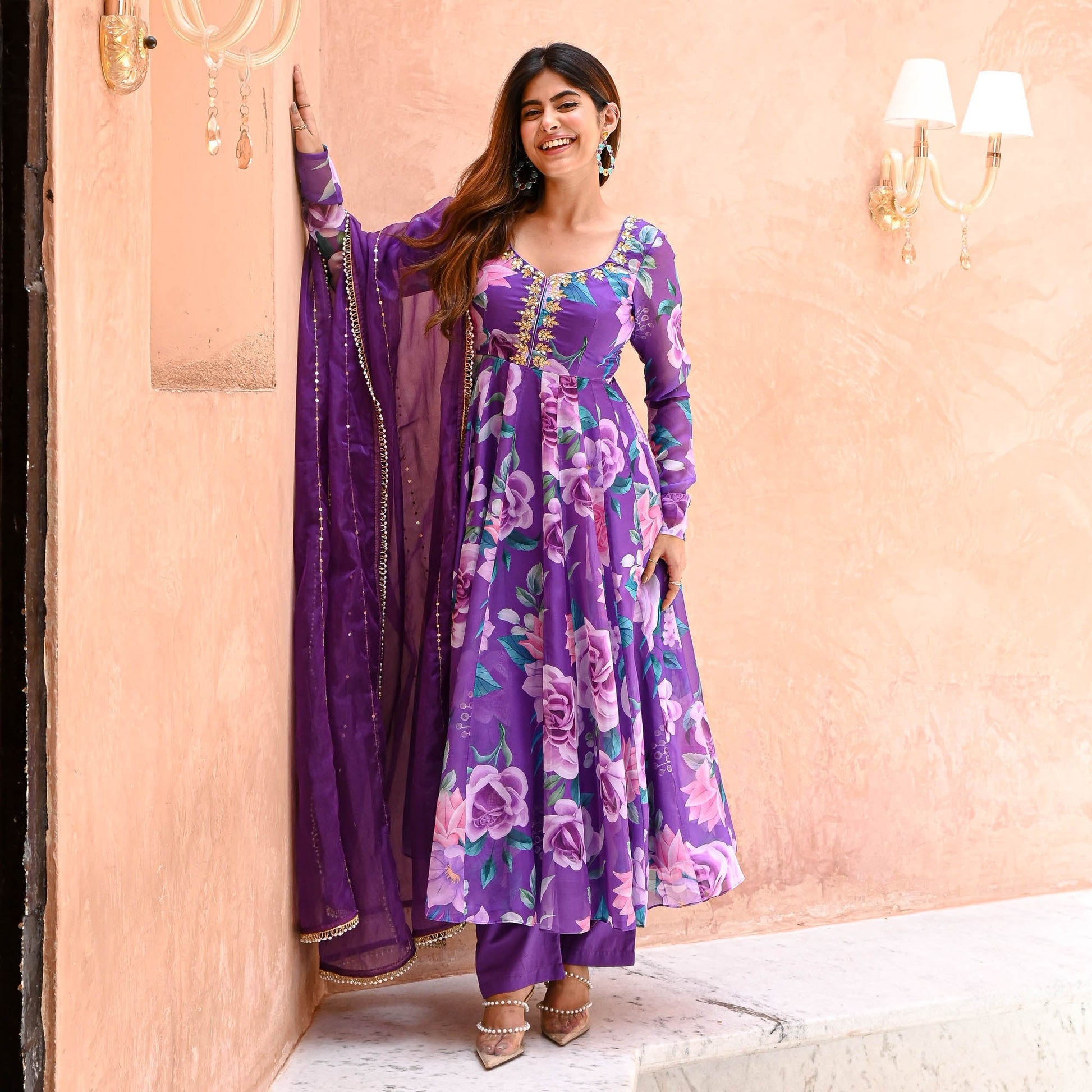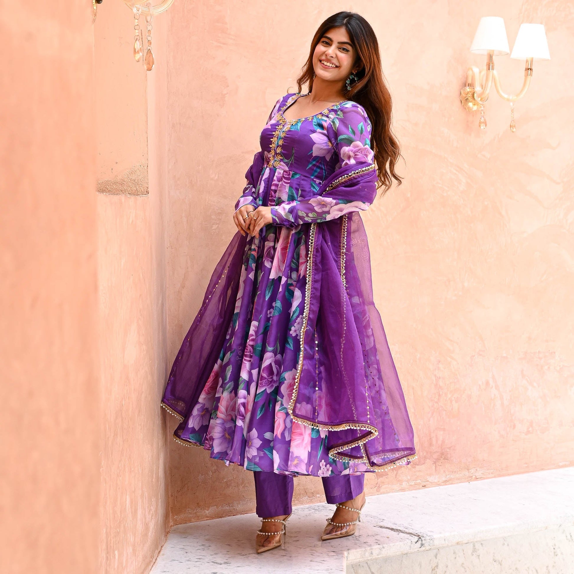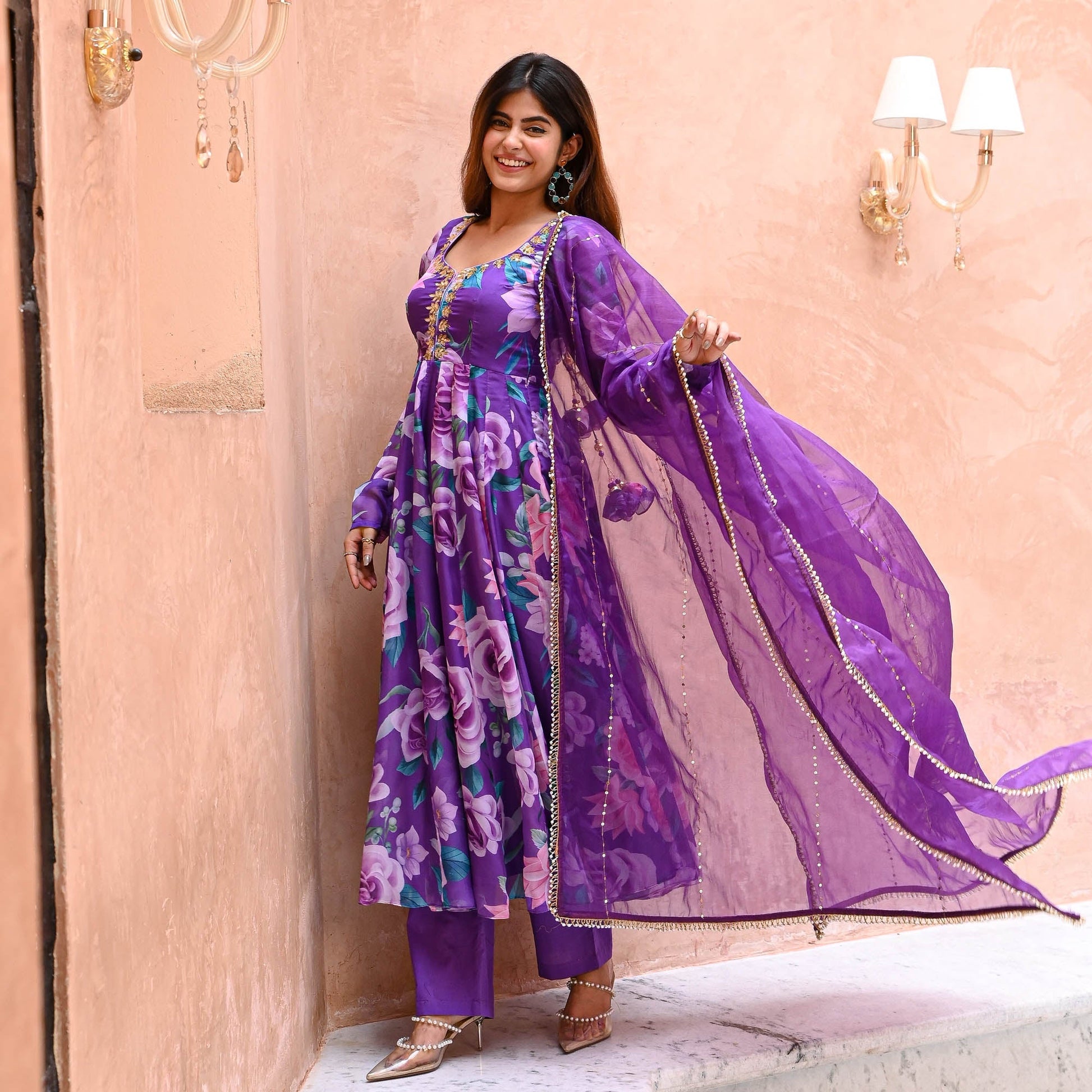 Saavan Suit Set exudes elegance with its luxurious digitally printed vibrant purple organza fabric adorned with lively floral prints. The flared kurta features an embellished U-neckline and gracefully bunched full sleeves. Complemented by matching flared palazzo pants, the ensemble is completed with an organza dupatta embellished with intricate lace details, perfect for a refined and captivating look.