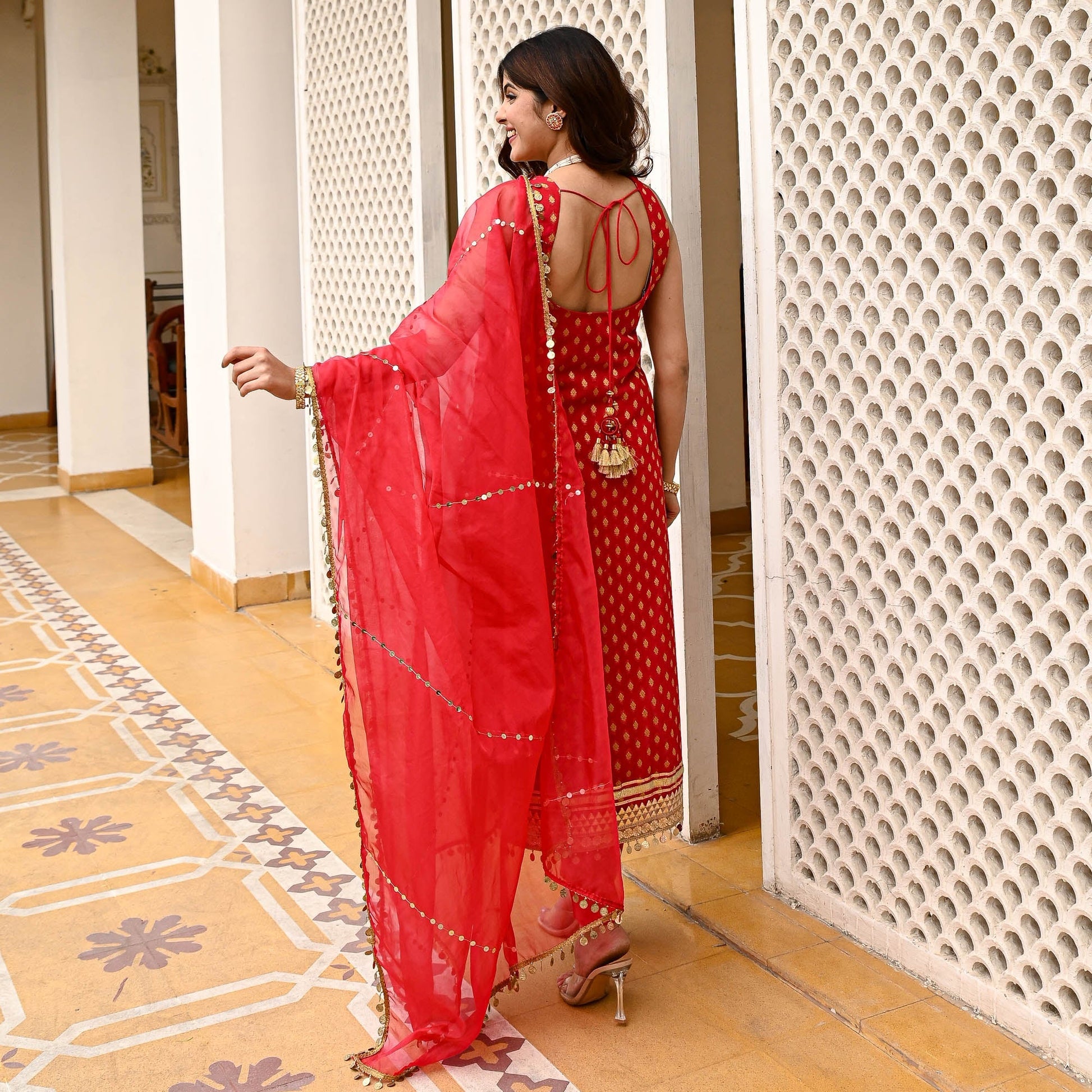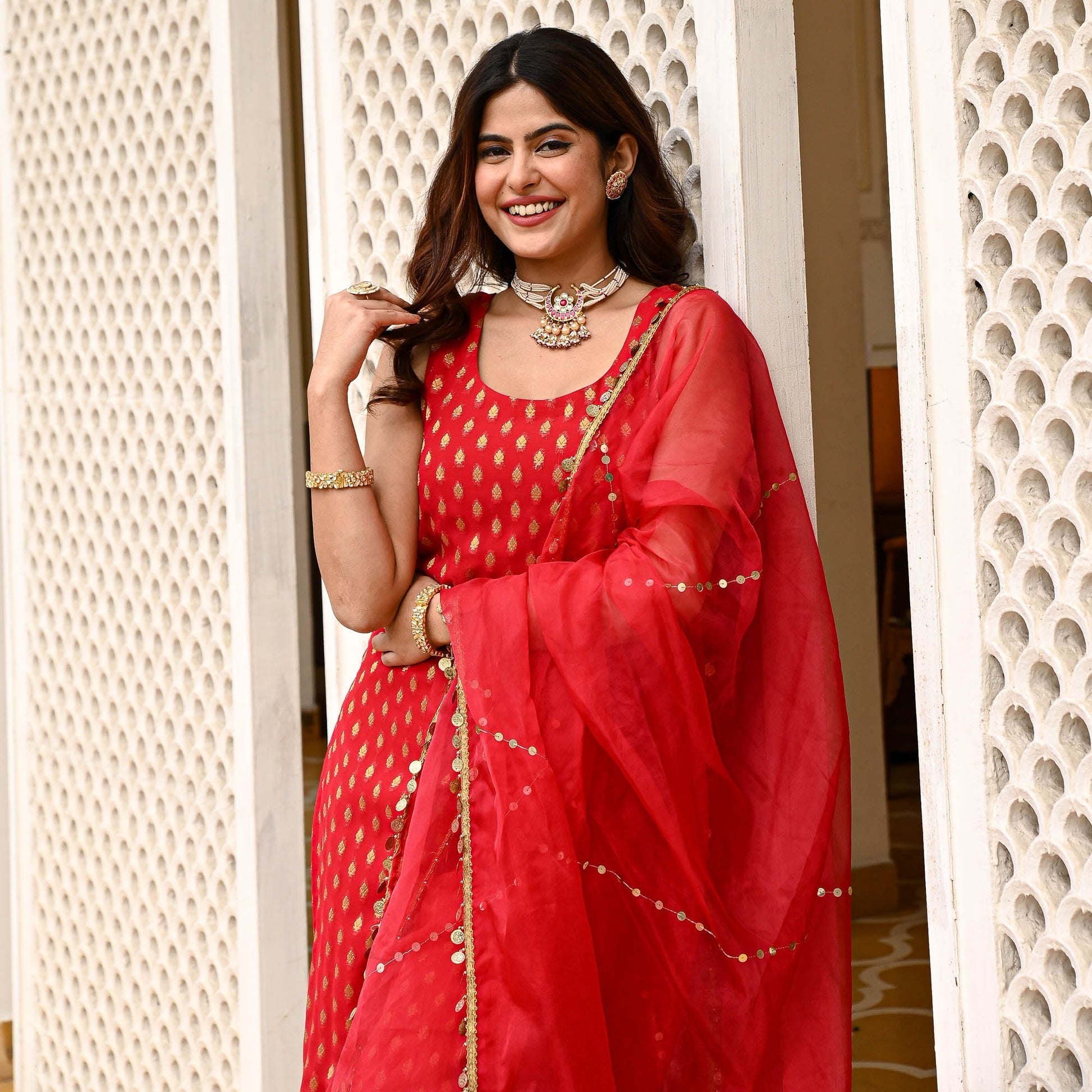 Indulge in the opulence of the Sabya Suit Set, where luxury meets tradition in a symphony of red jacquard. This exquisite ensemble boasts a sleeveless straight kurta, adorned with intricate sequin and gota handwork along the hemline. Complemented by matching pants and an organza dupatta, embellished with shimmering sequins and delicate coin lace trimmings. Elevate every occasion with timeless elegance.