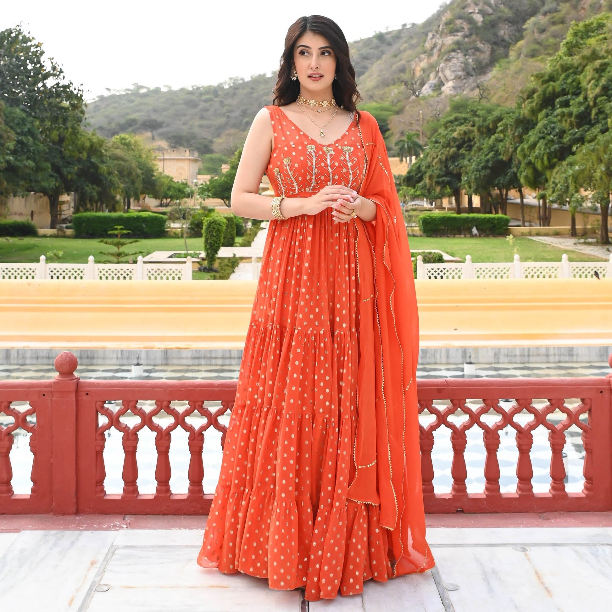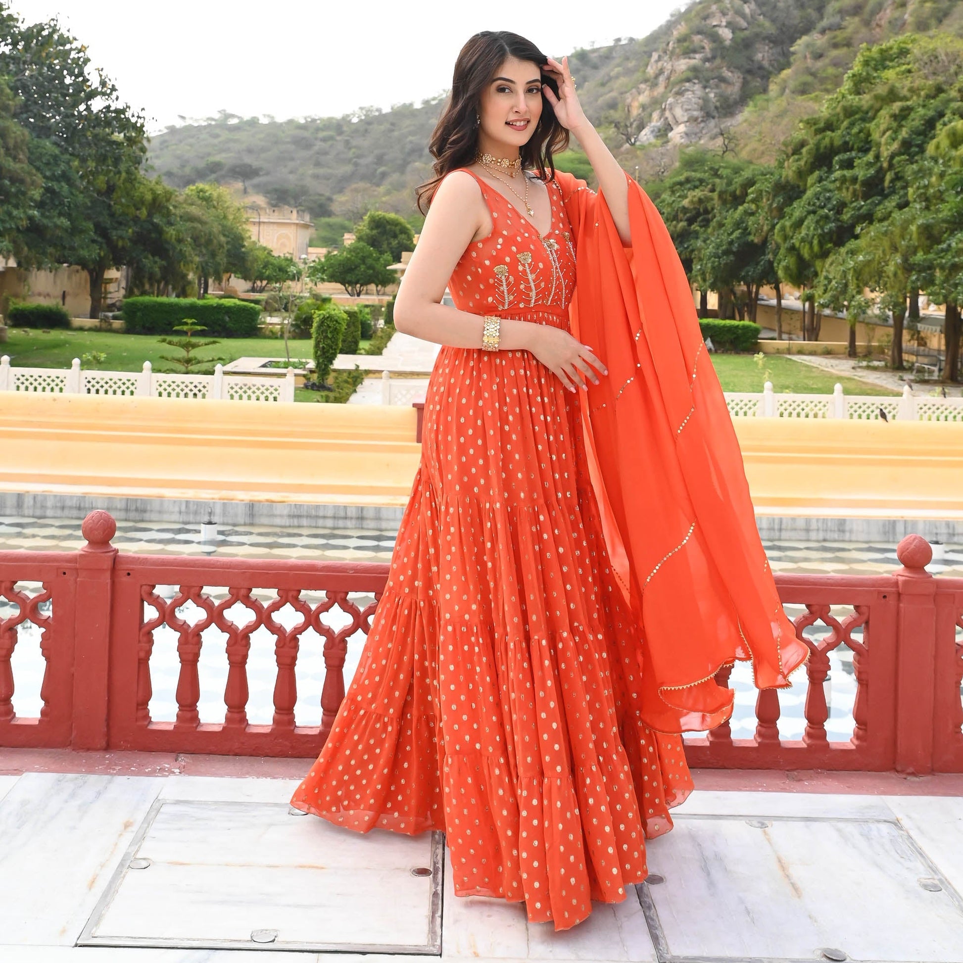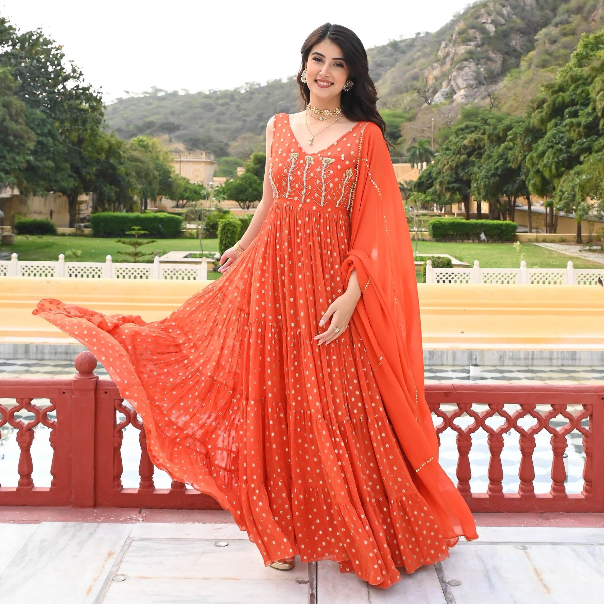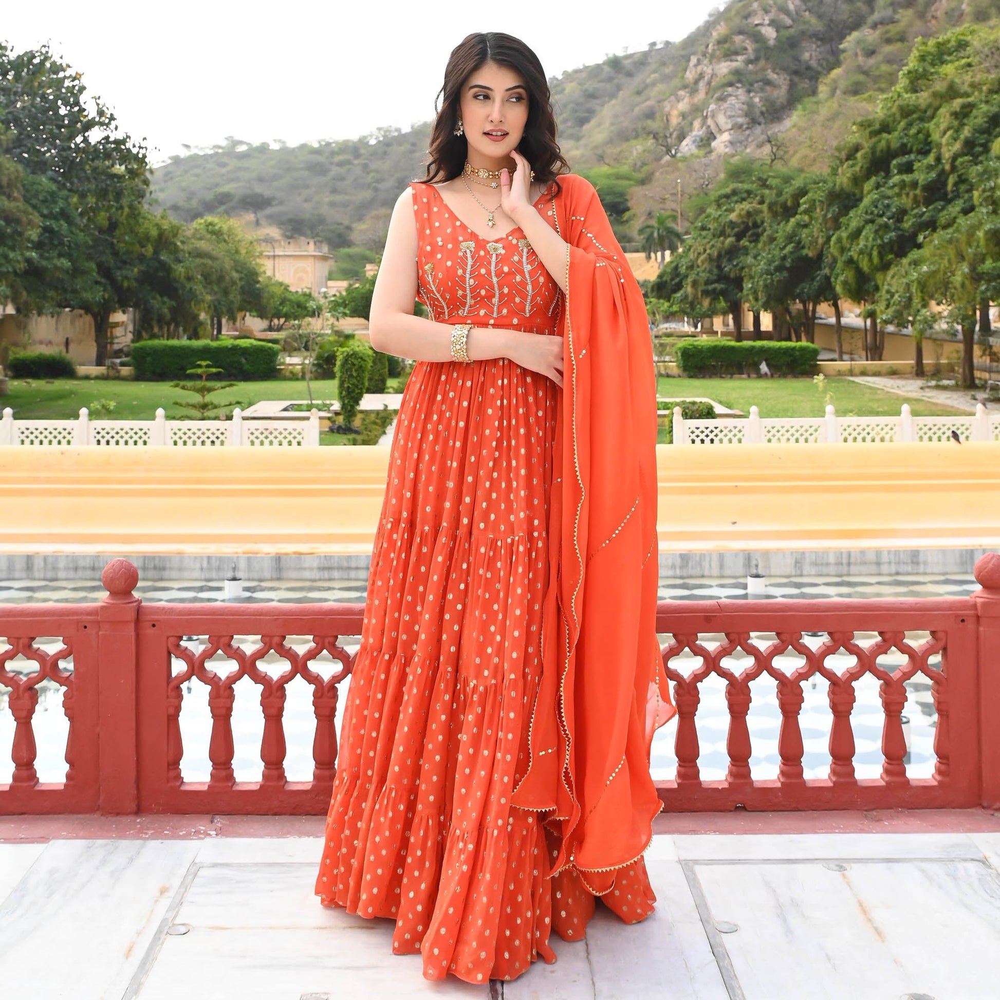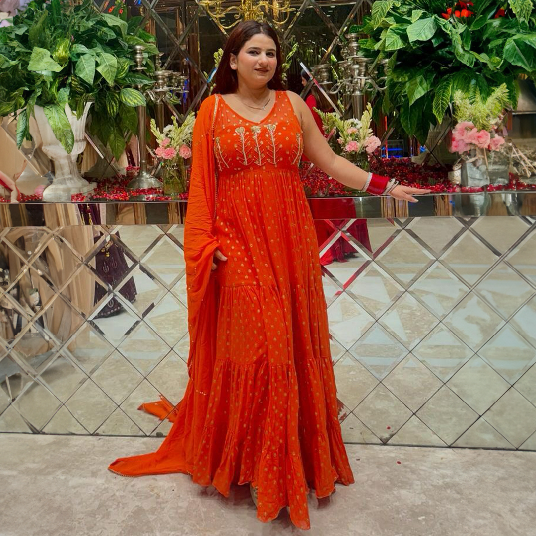 Our Sandhya Suit Set is a captivating ensemble that radiates joy like a sunset on a summer's day. The bright orange hue makes this ensemble a sizzling fusion of boldness and elegance while the Moti and Cut-Dana handwork adorning the suit adds a touch of glamour and opulence. To complete this enchanting picture, the georgette dupatta drapes gracefully, enhancing the outfit's allure.