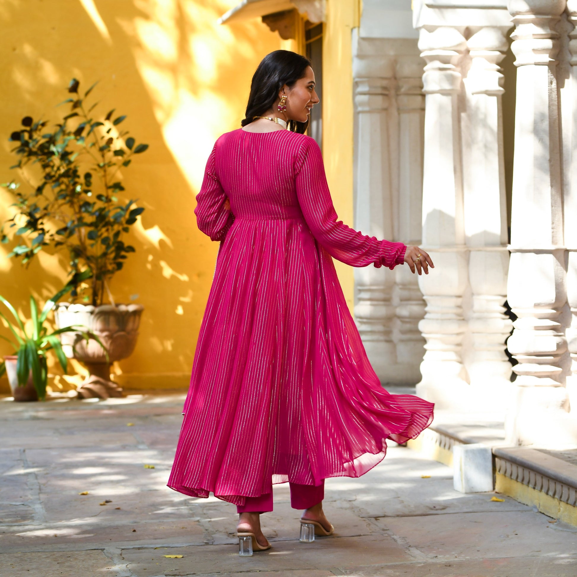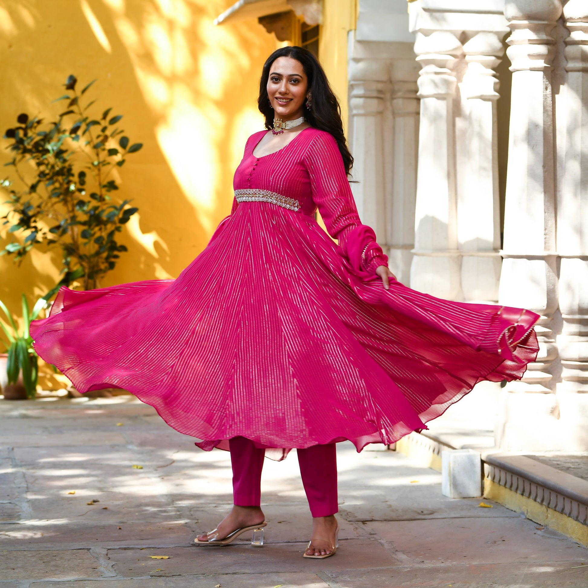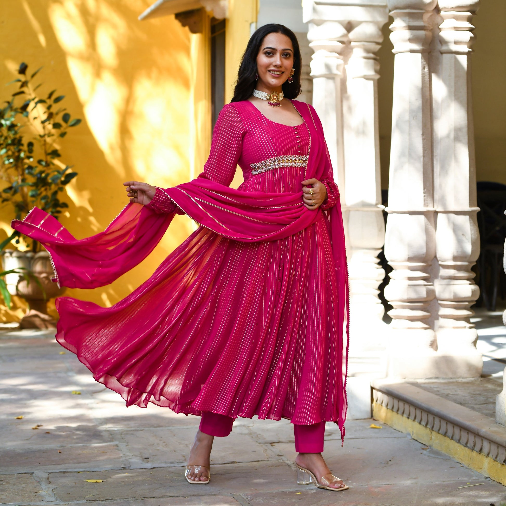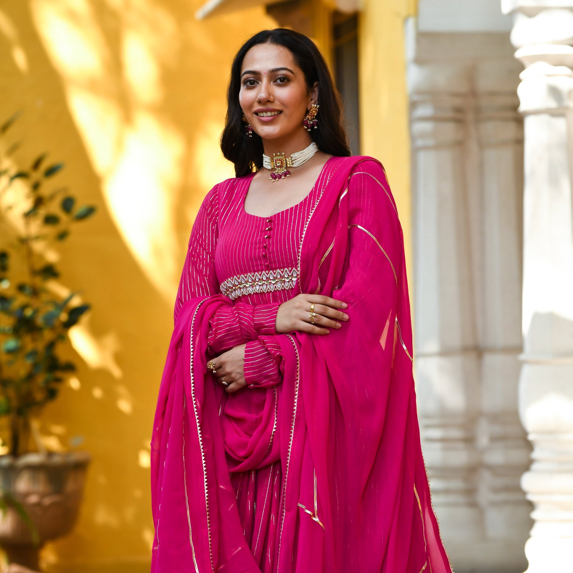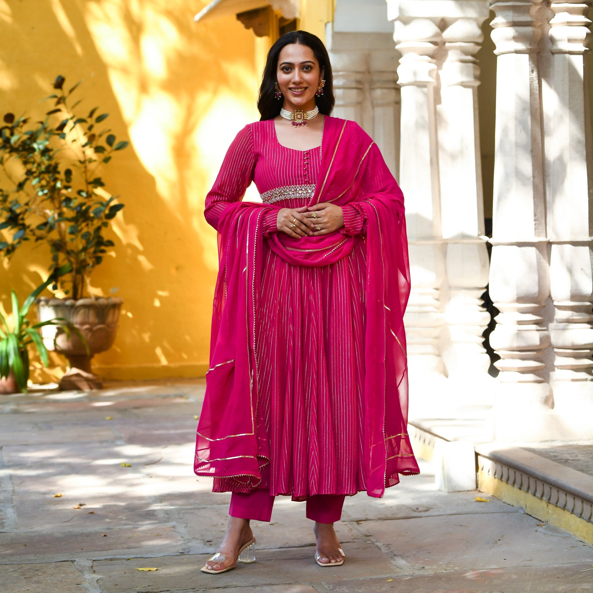 Made from high-quality Lurex, this gorgeous fit and flare Sanskriti Suit Set is a must-have for your festive or celebration wardrobe. From the absolutely charming magenta colour to the stunning Gotta Patti detailing, this outfit is sure to make you stand out from the crowd.