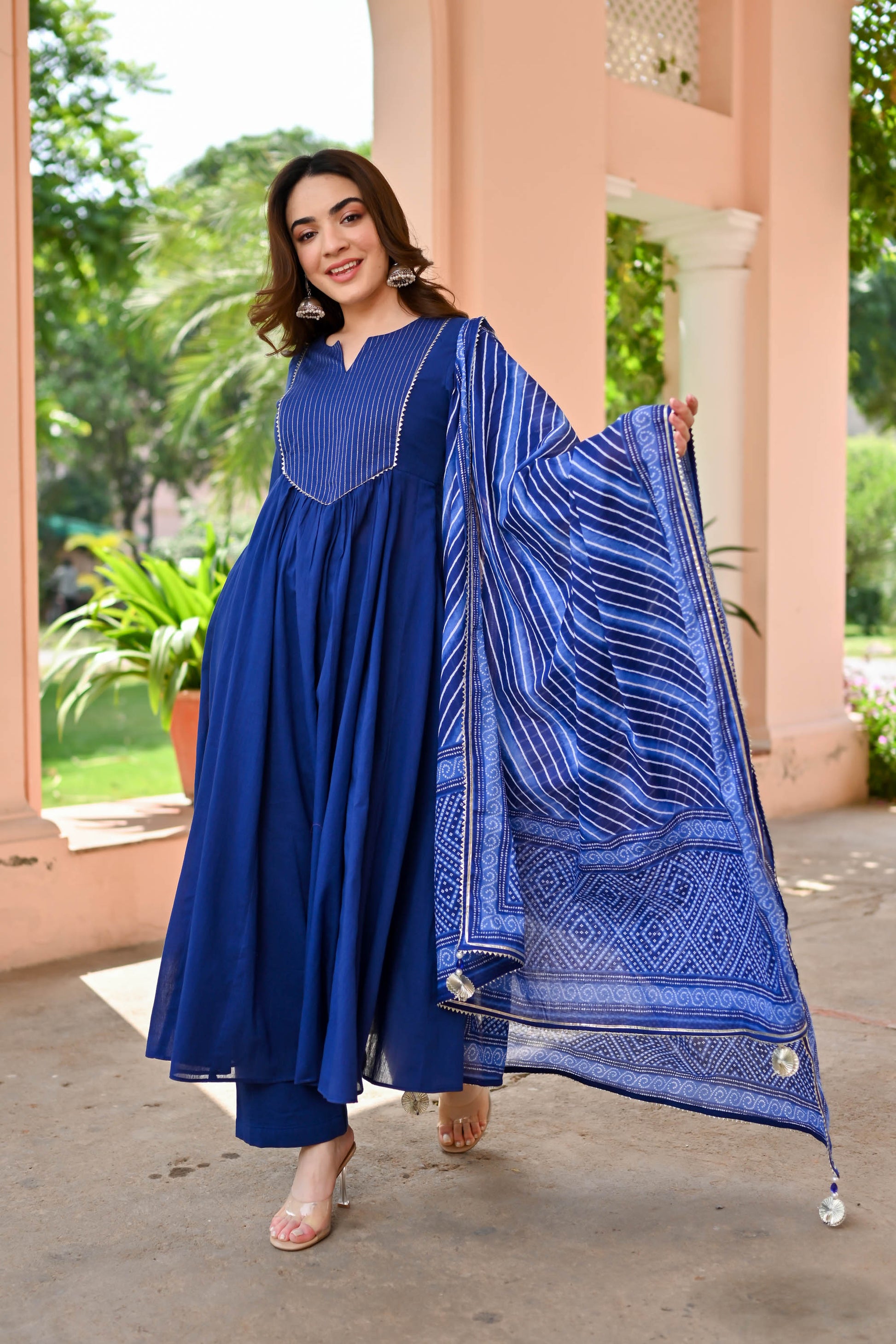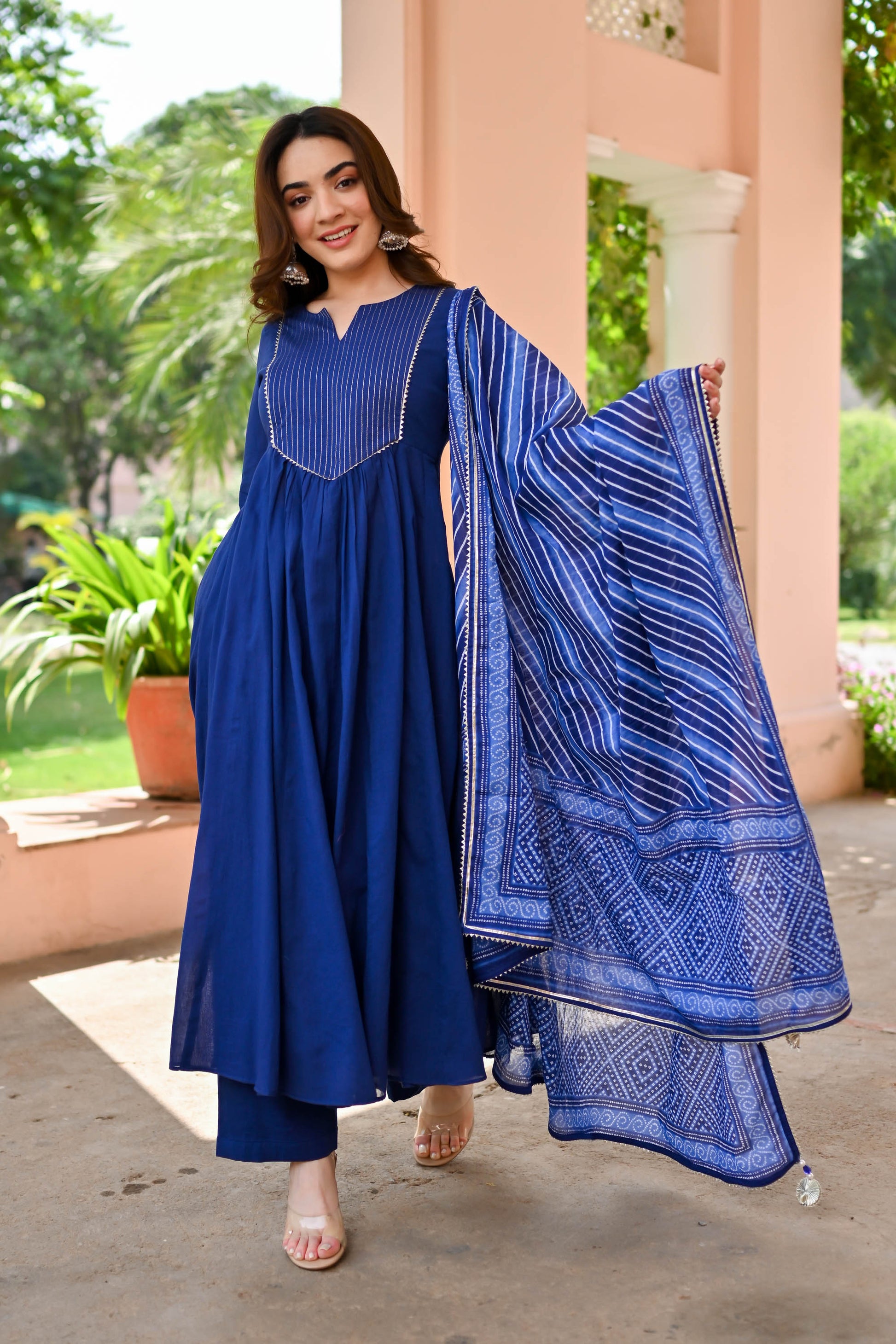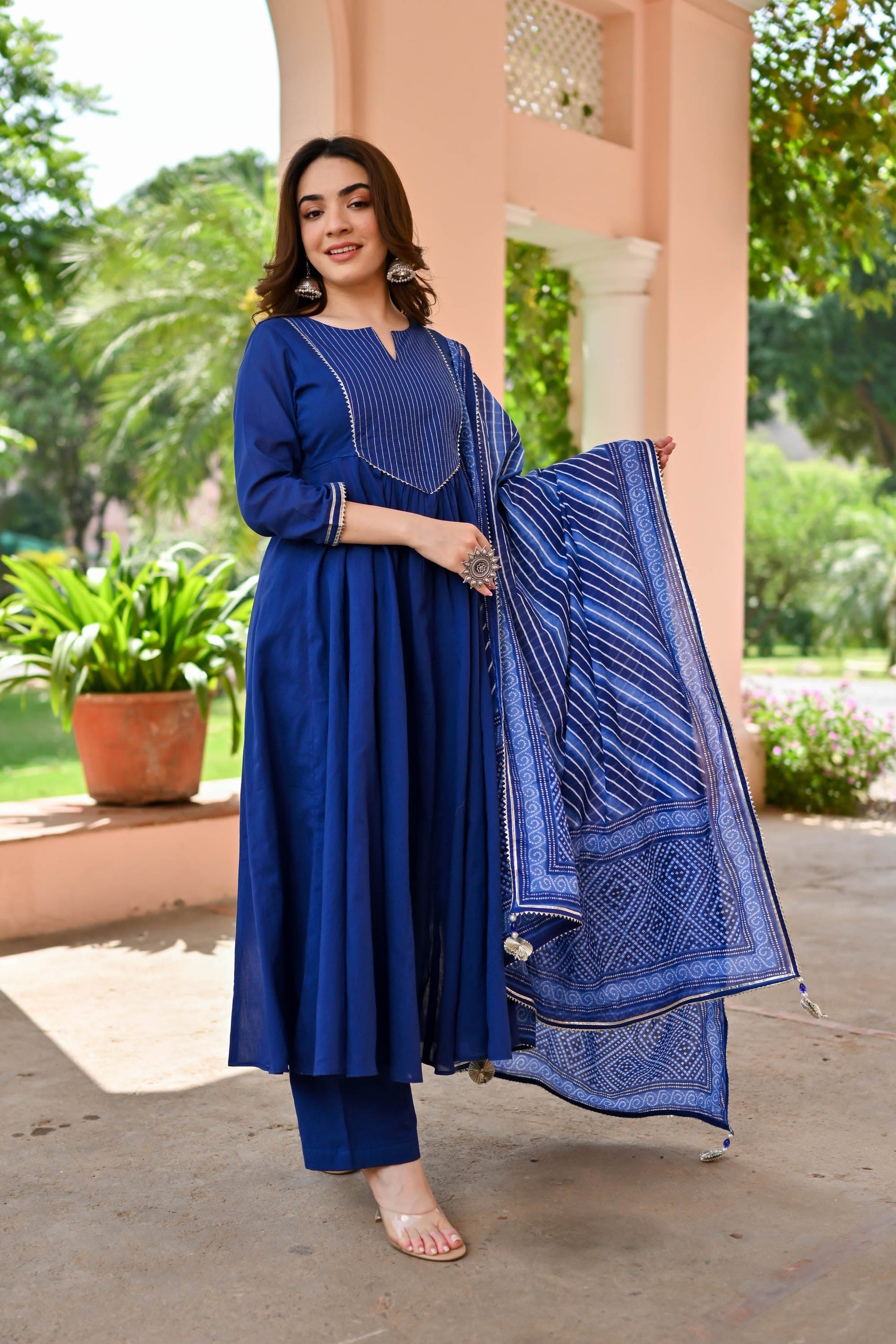 Discover the Sanya Cotton Suit Set Of Three, crafted from the finest cotton. This indigo-blue ensemble features a round neckline with a notch, a detailed yoke adorned with Gota lace, and a flared hemline. The set is completed with matching pants and an ethnic motif printed dupatta, merging traditional charm with contemporary style. Perfect for any elegant occasion.