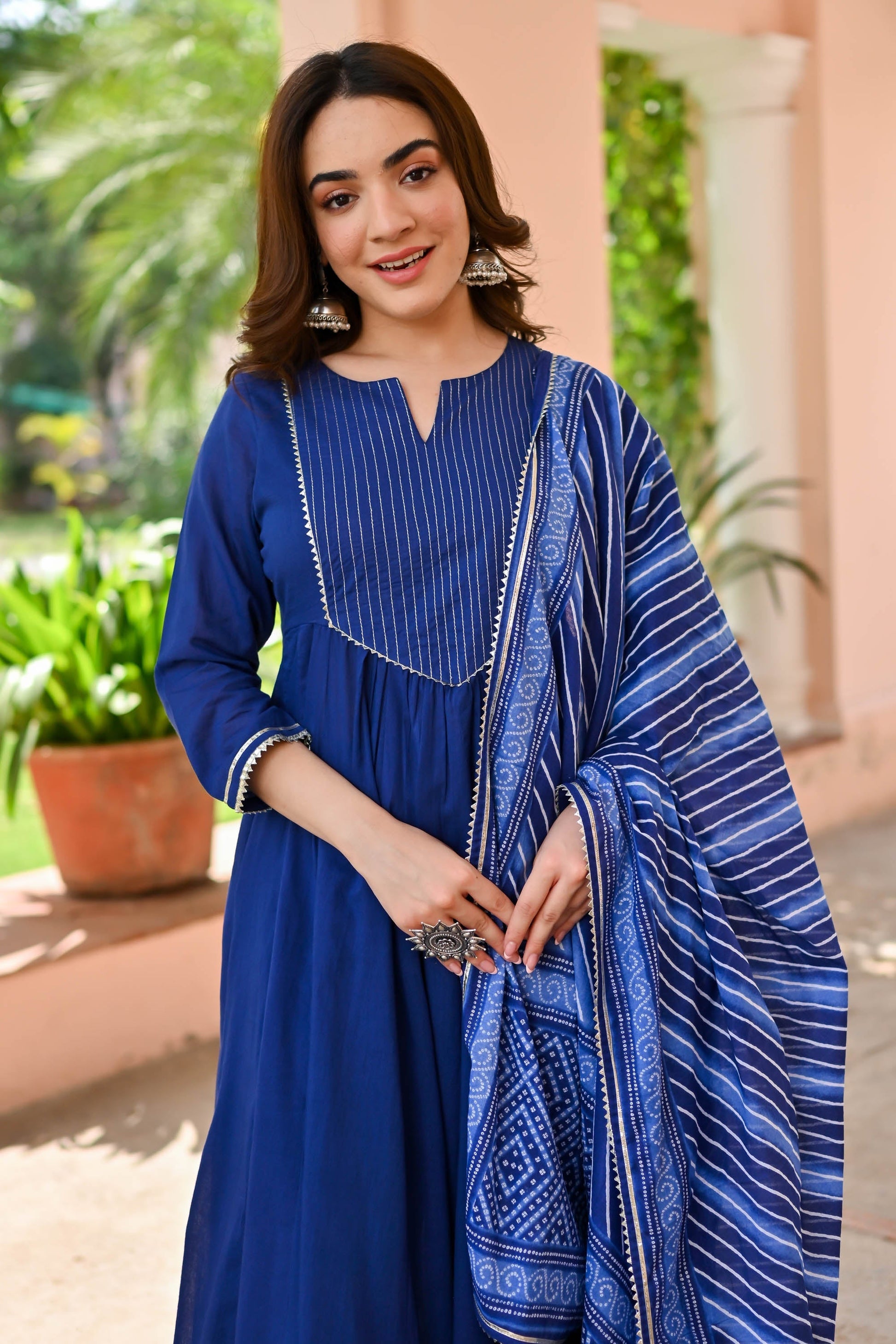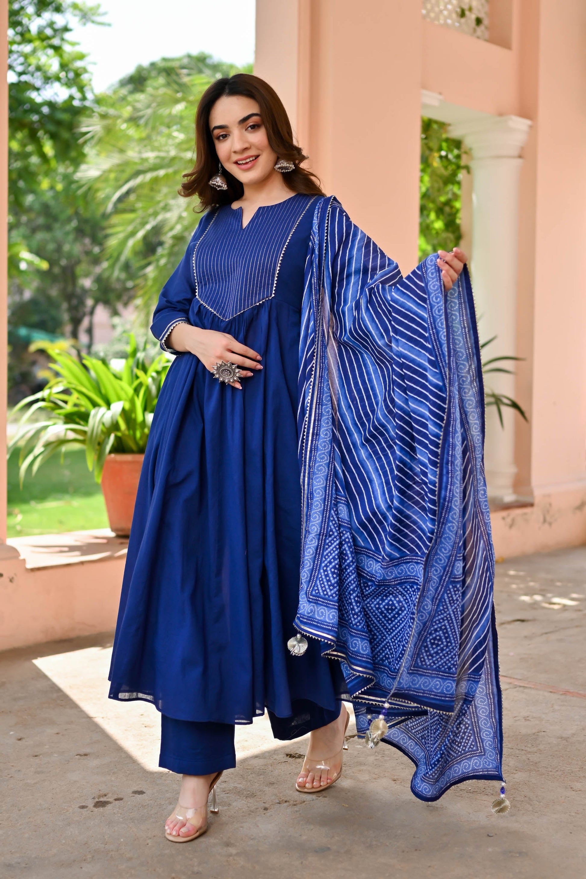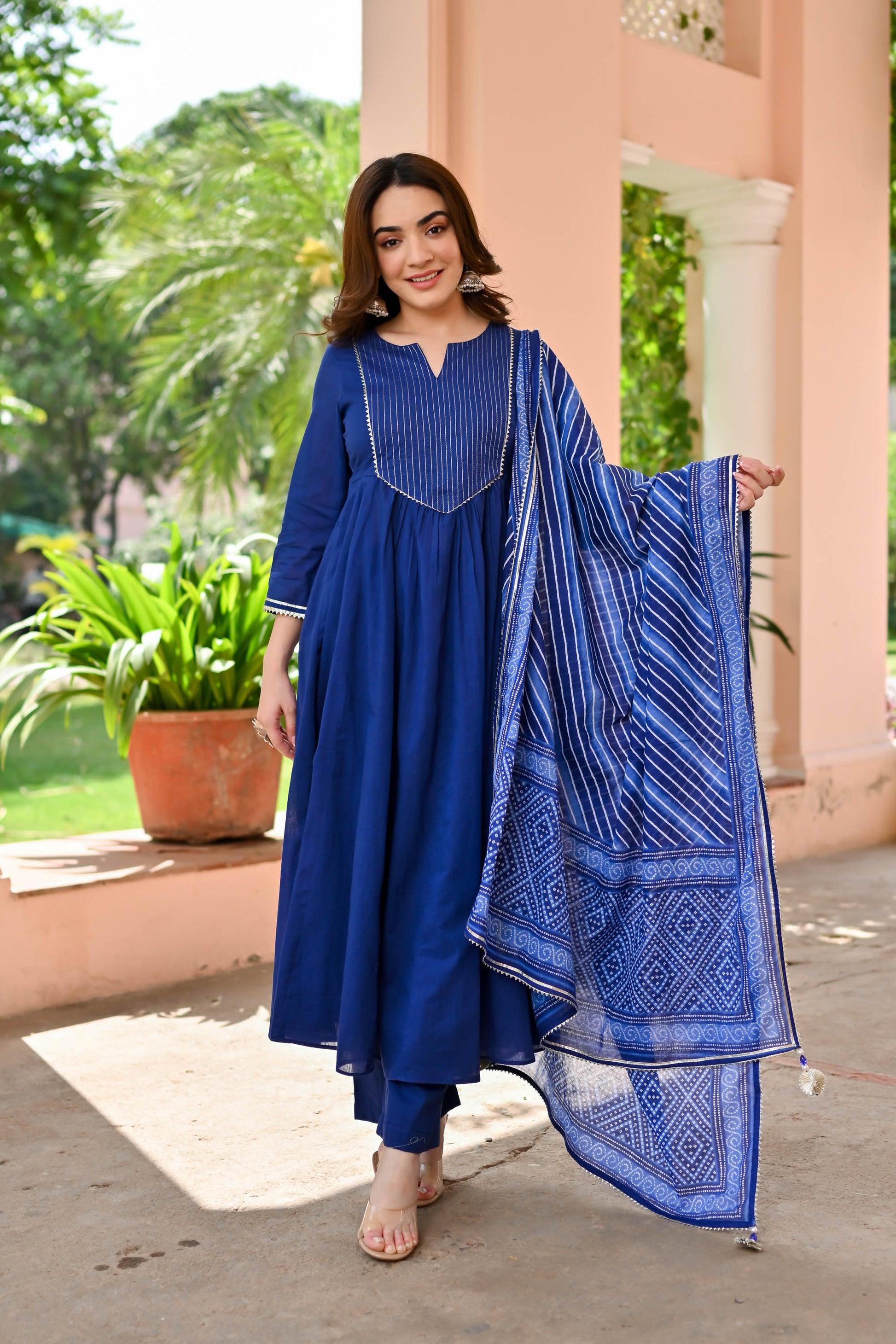 Discover the Sanya Cotton Suit Set Of Three, crafted from the finest cotton. This indigo-blue ensemble features a round neckline with a notch, a detailed yoke adorned with Gota lace, and a flared hemline. The set is completed with matching pants and an ethnic motif printed dupatta, merging traditional charm with contemporary style. Perfect for any elegant occasion.