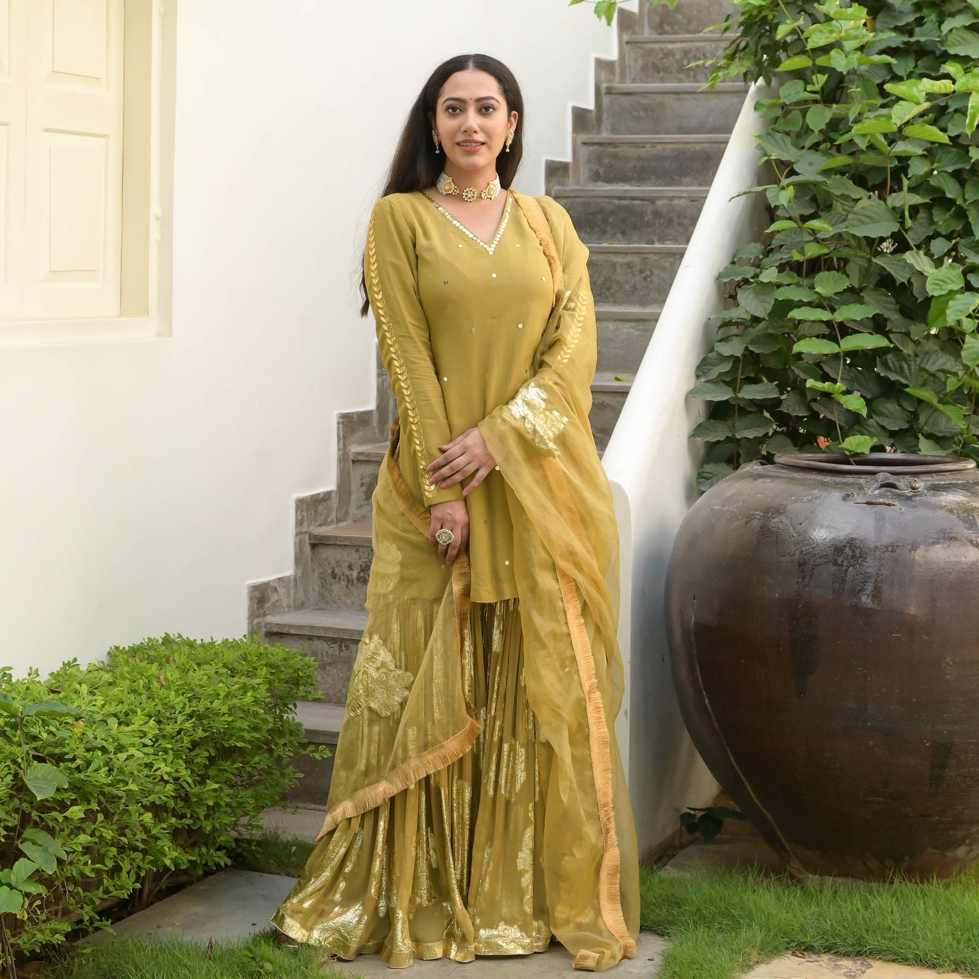Our Sati Suit Set is a testament to timeless elegance and contemporary charm. Crafted from a stunning mustard georgette and jacquard fabric, this ensemble combines richness with grace. The highlight of this outfit is the exquisite sequin and gotta work, perfectly complemented by the playful fringe border on the organza dupatta.