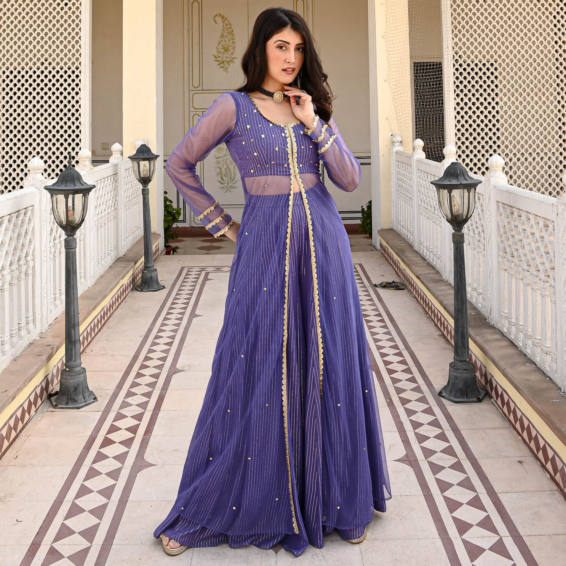 Step into the spotlight and let your outfit tell a story of heritage and elegance with the gorgeous Shabnam Suit Set. Make a statement wherever you go and let your outfit speak volumes about your love for tradition and fashion. Crafted from the most luxurious signature lurex and net fabrics, and adorned with ornate cut dana and sequin embellishments, the suit set is a masterpiece. The deep hues of purple act as the perfect background for the shimmering gold threads. The stunning sheer overlay complements the matching flared palazzo. Embrace your unique sense of style and let the world see the beauty of cultural diversity through your fashion choices.