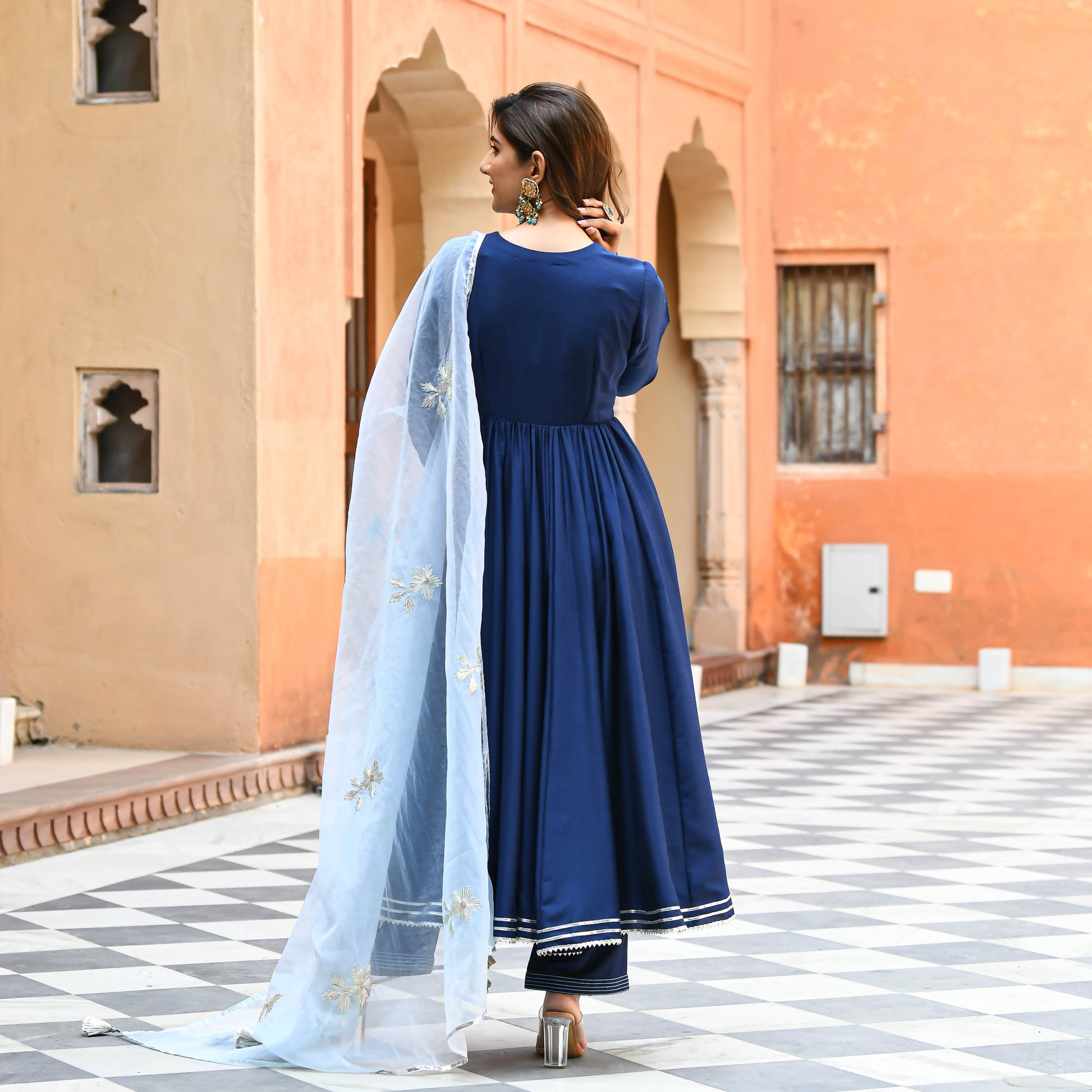 A true sight to behold, this Anarkali Suit Set is a must-have for your wardrobe. The rich blue colour of the Kurta is contrasted by the delicate white gotta work on the dupatta, making for a striking and eye-catching combination. The Anarkali style of the kurta is both elegant and flattering, draping beautifully over the body to create a feminine and graceful silhouette. The white gotta work on the dupatta adds a touch of sophistication and detail, making this a versatile and timeless piece that can be worn again and again.