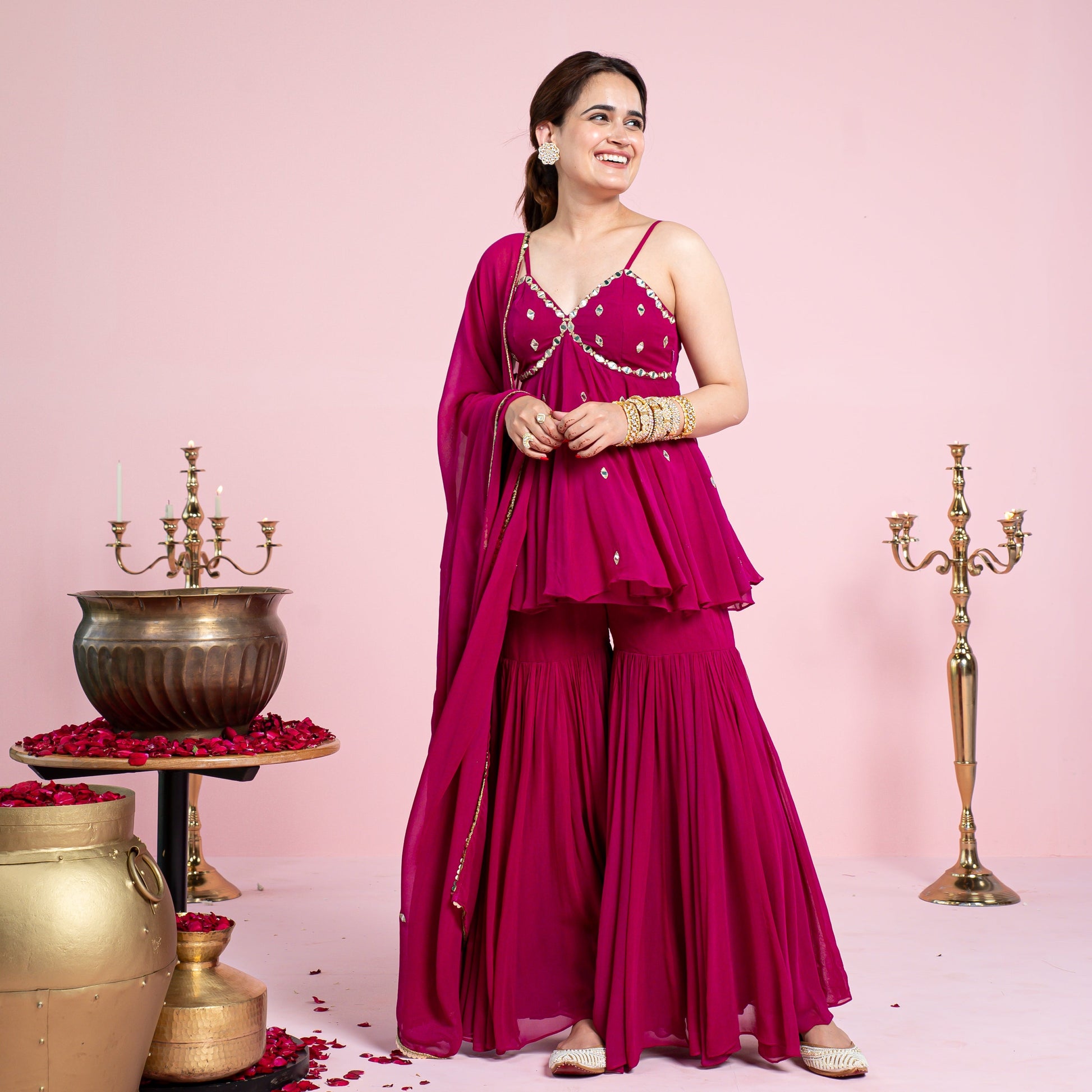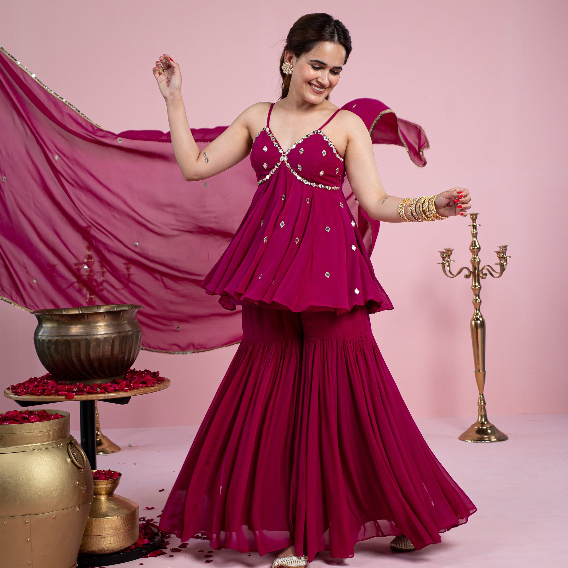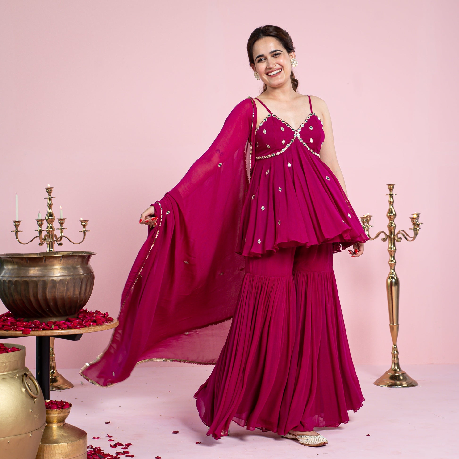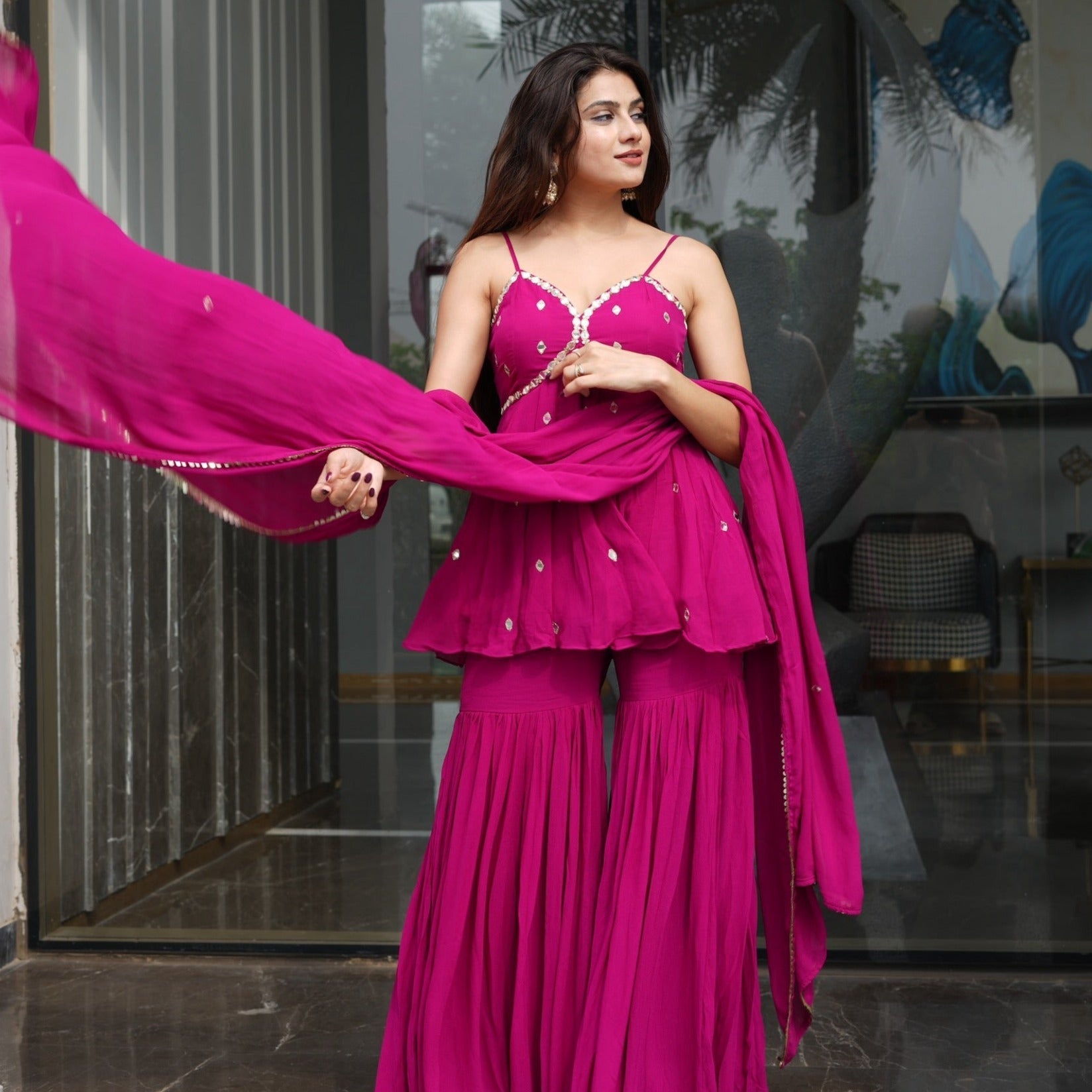 Elevate your ethnic charm with our Shagna Sharara Set in a vibrant magenta hue. Crafted from luxurious georgette fabric, this ensemble is designed to make you feel as elegant as you look. The strappy sleeves add a contemporary touch, while intricate Patra and sequin work adorns the outfit, making it the perfect choice for weddings and festive celebrations.