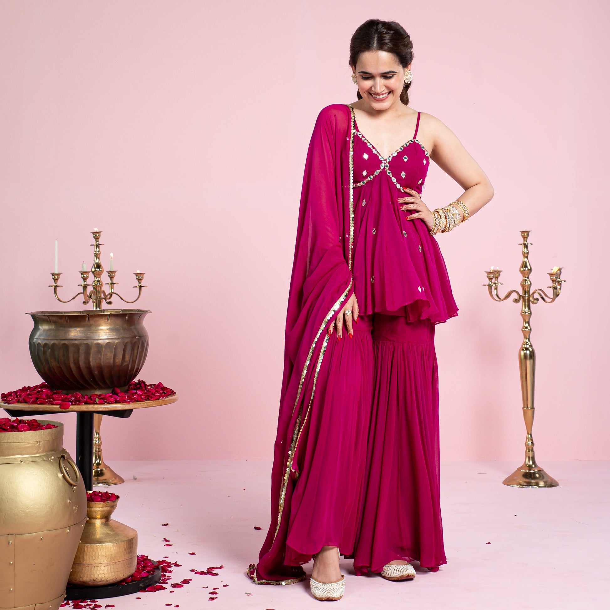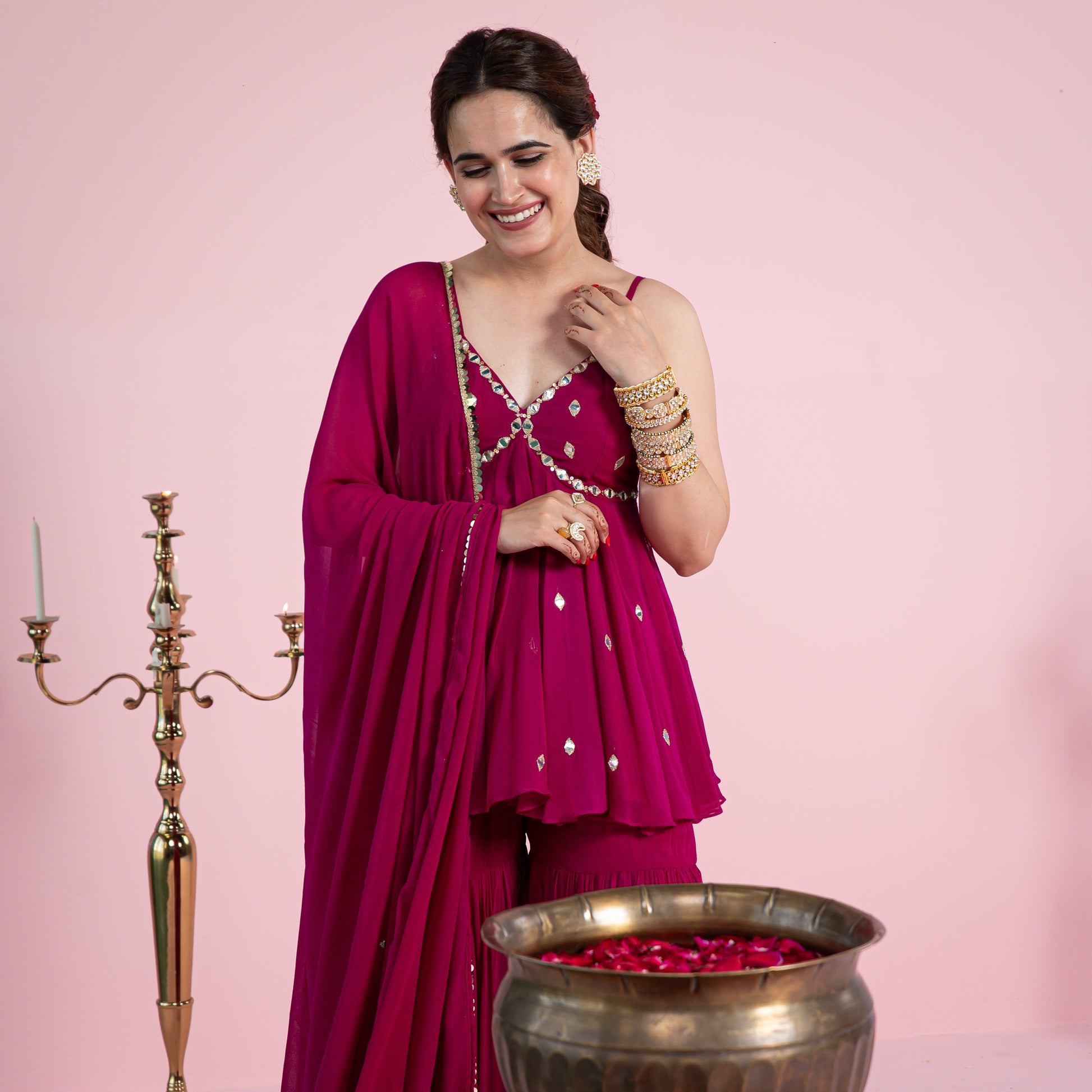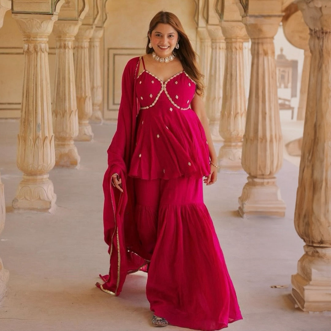Elevate your ethnic charm with our Shagna Sharara Set in a vibrant magenta hue. Crafted from luxurious georgette fabric, this ensemble is designed to make you feel as elegant as you look. The strappy sleeves add a contemporary touch, while intricate Patra and sequin work adorns the outfit, making it the perfect choice for weddings and festive celebrations.