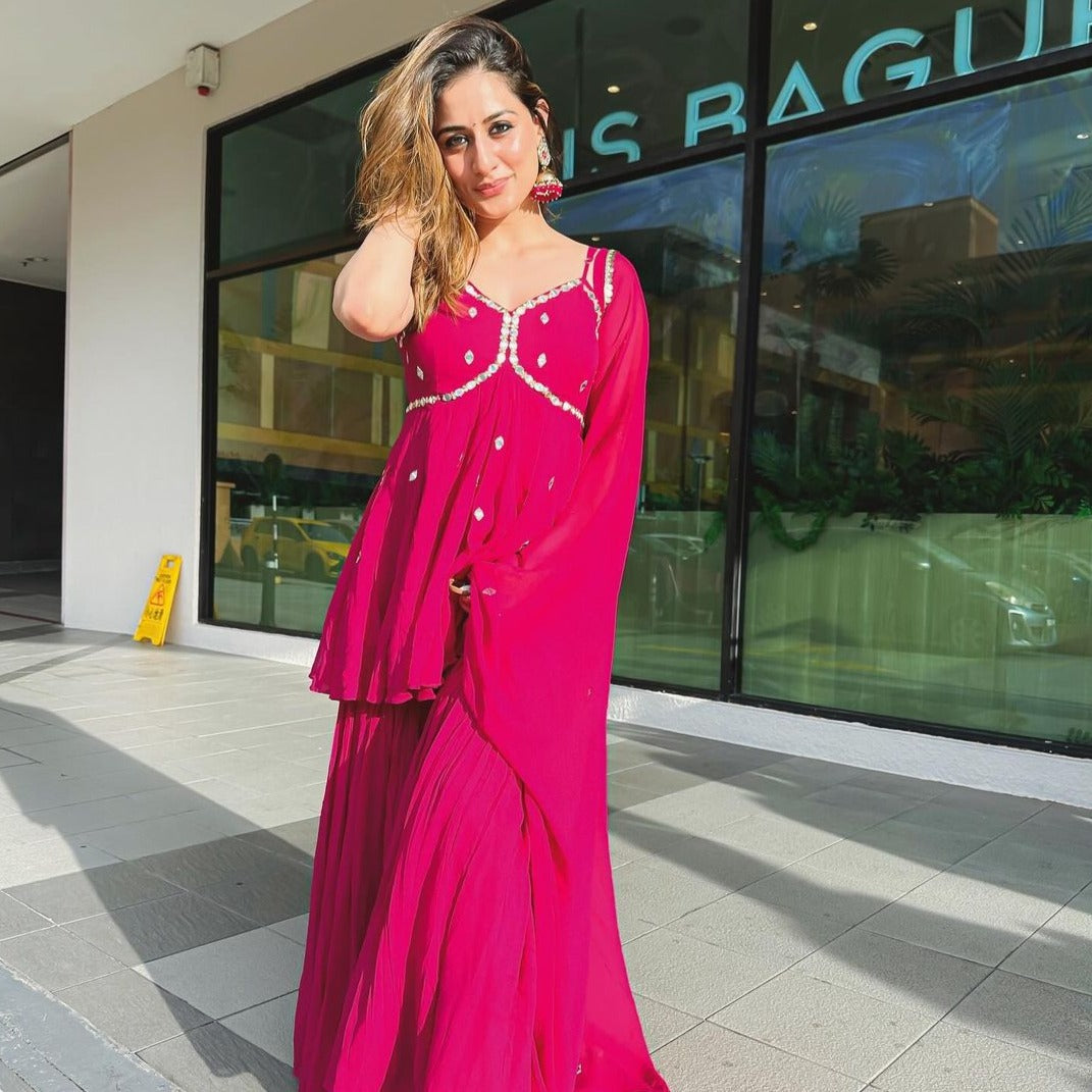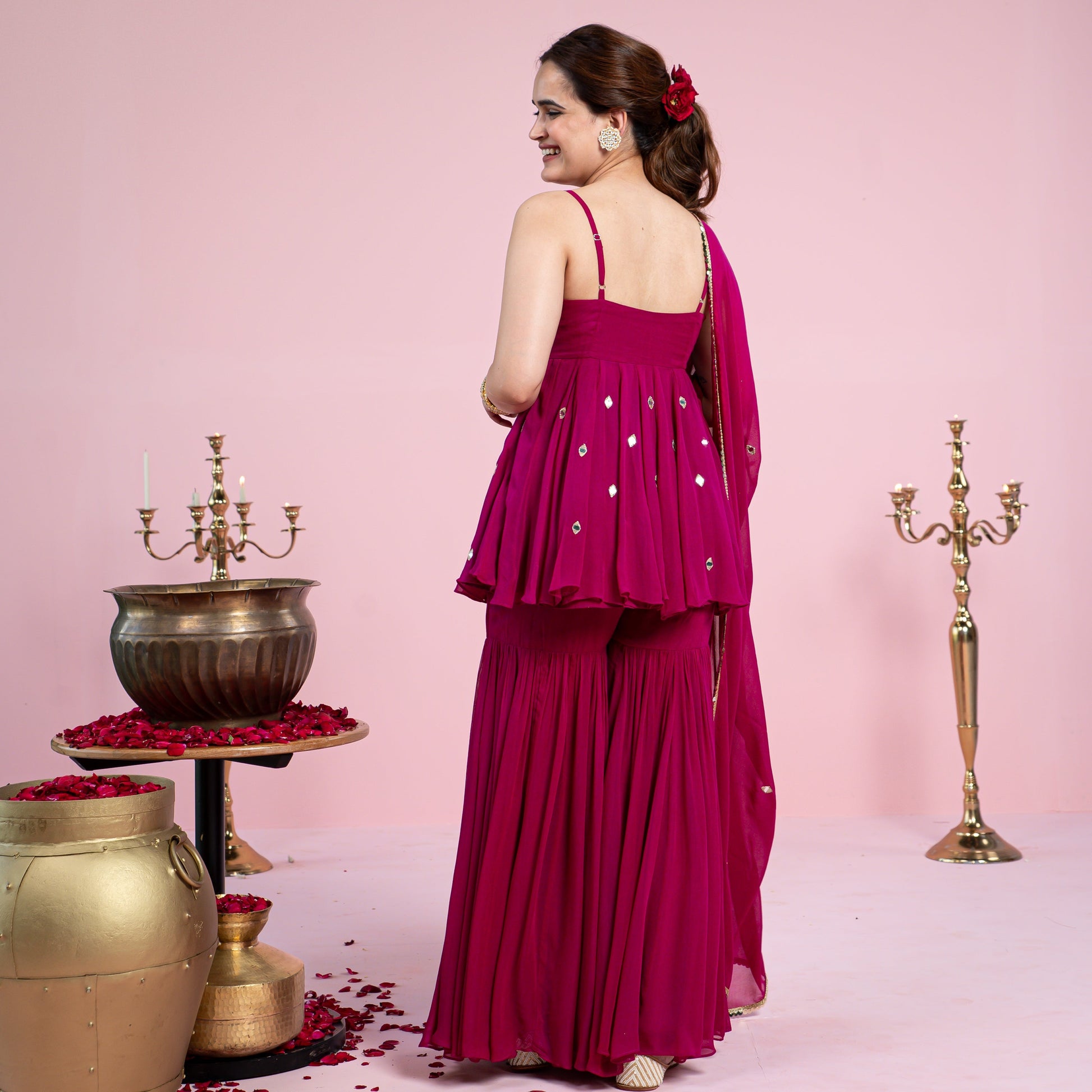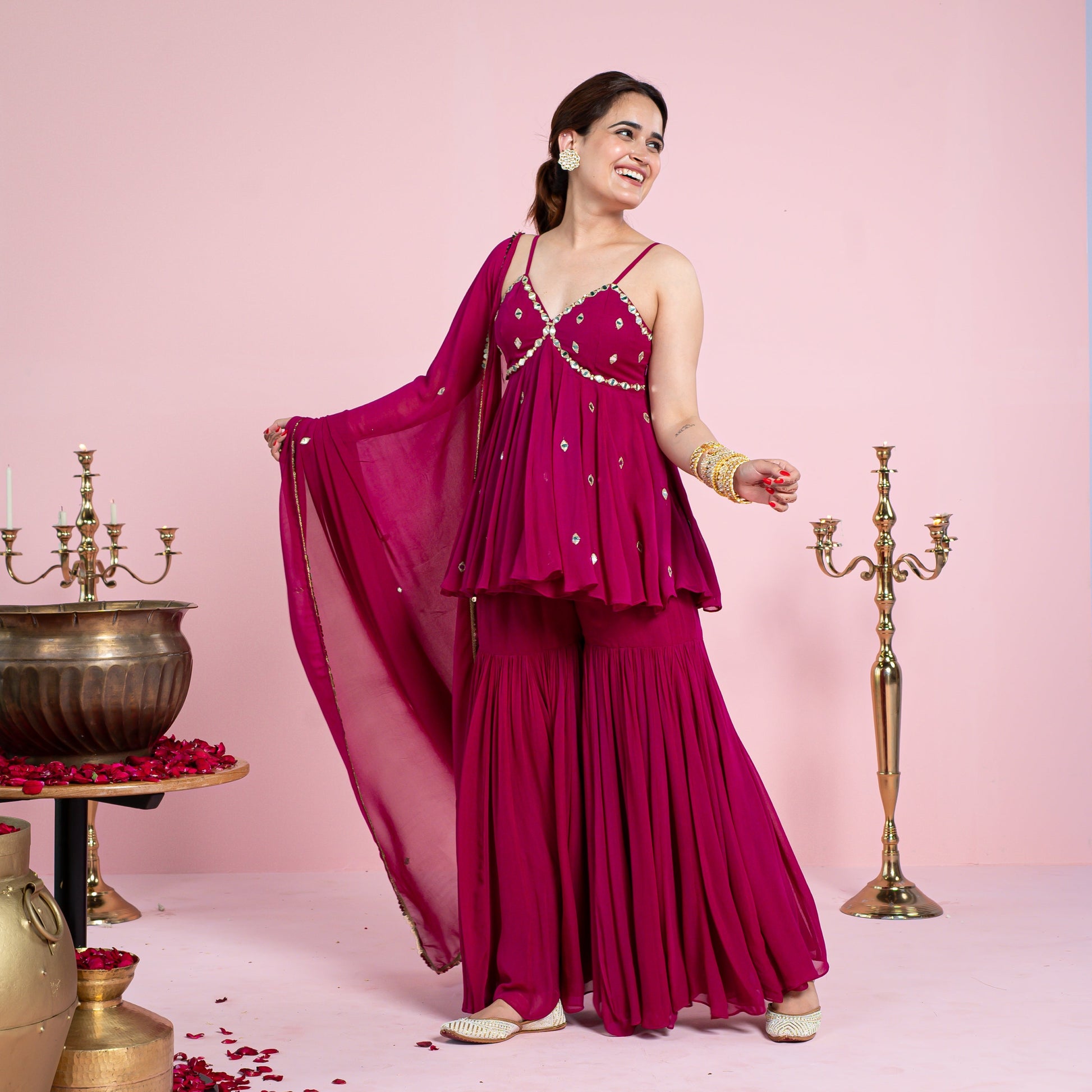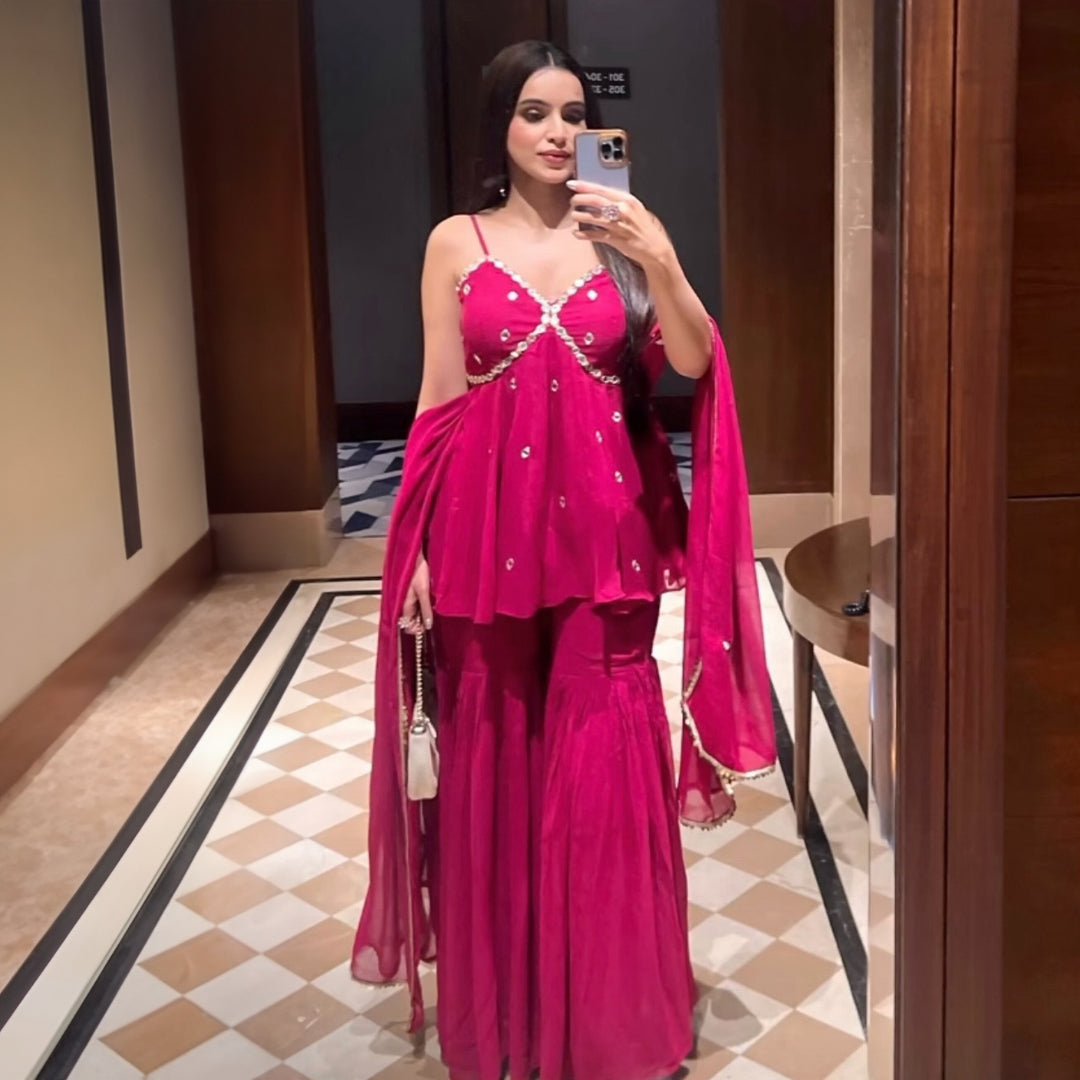 Elevate your ethnic charm with our Shagna Sharara Set in a vibrant magenta hue. Crafted from luxurious georgette fabric, this ensemble is designed to make you feel as elegant as you look. The strappy sleeves add a contemporary touch, while intricate Patra and sequin work adorns the outfit, making it the perfect choice for weddings and festive celebrations.