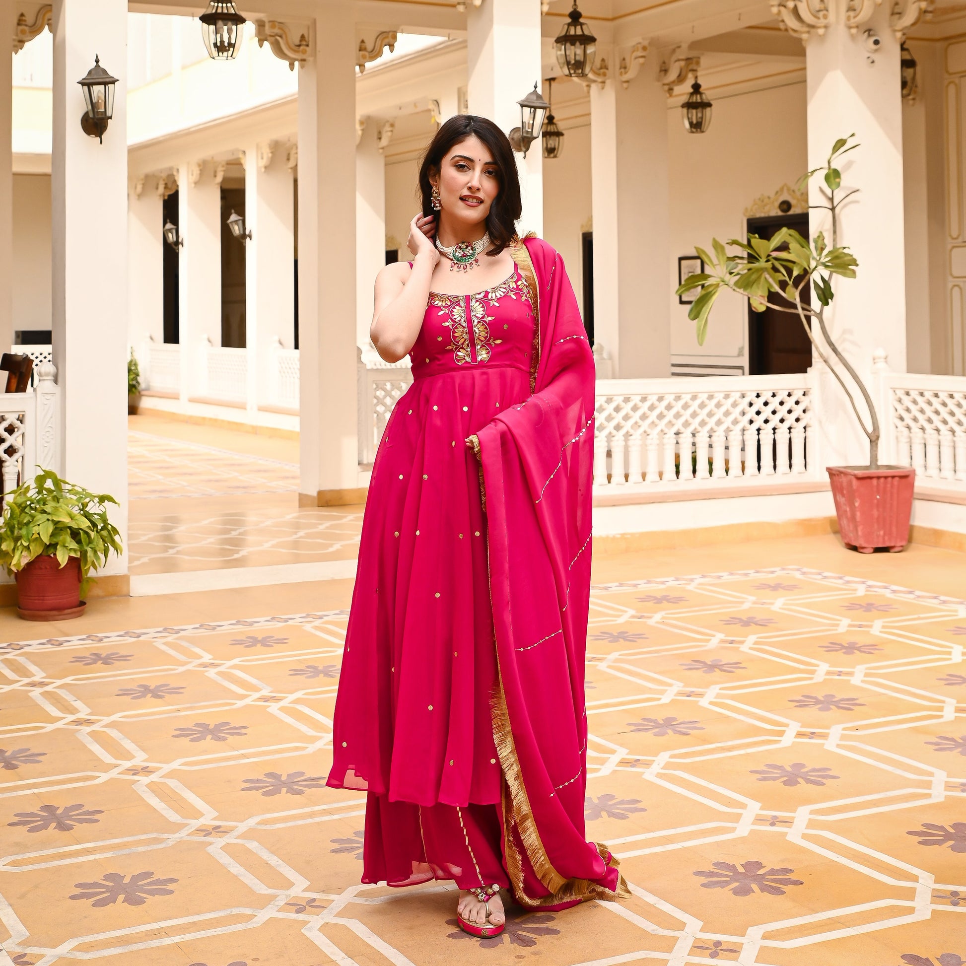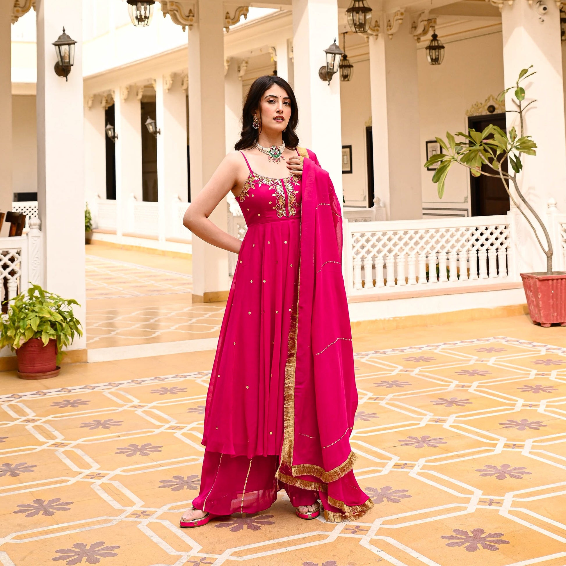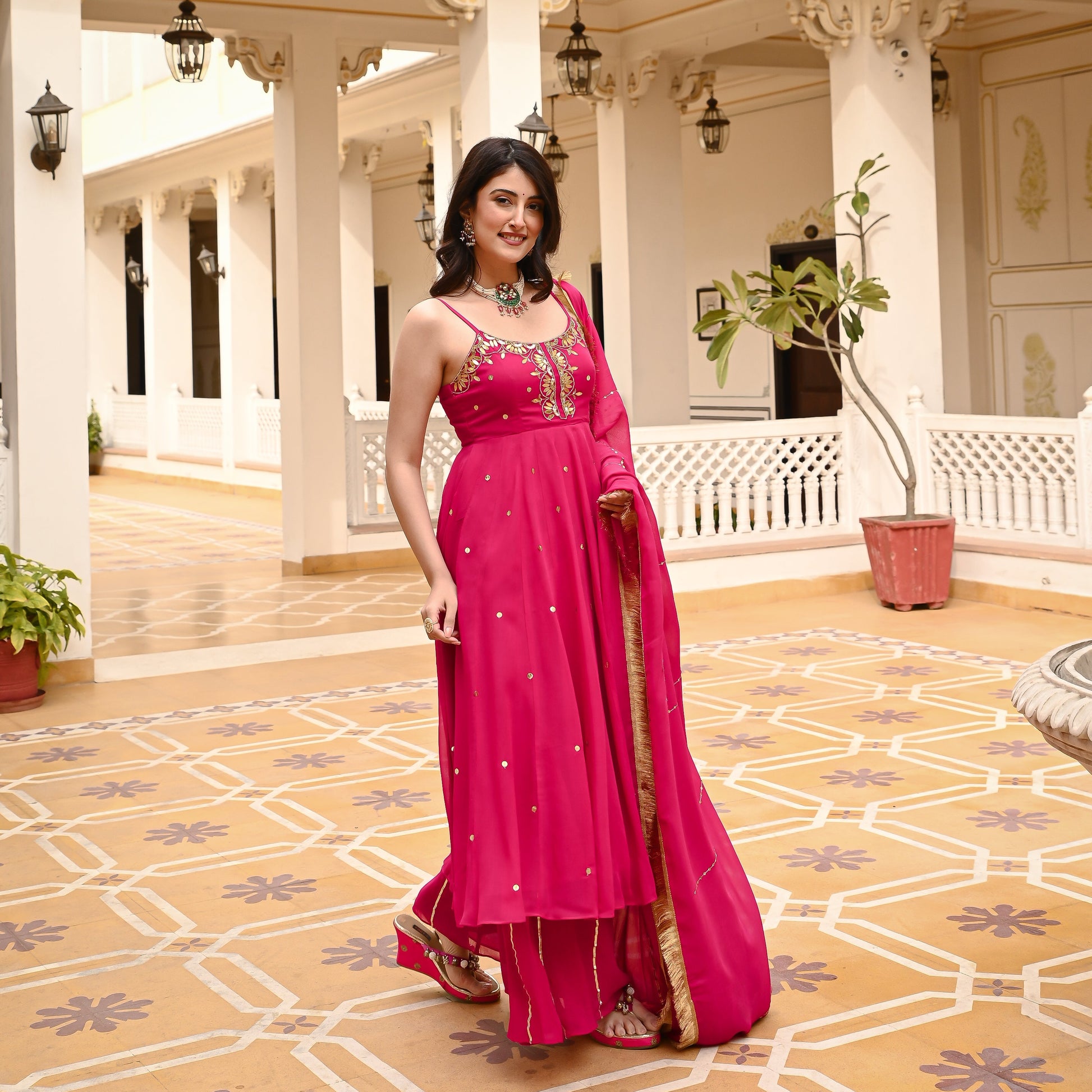Step into a realm of elegance and tradition with our enchanting Shagan Suit Set. The striking pink hue beautifully complements the intricate Gold gota patti detailing adorning the yoke of the strappy kurta, while sequin embellishments cascade down the flare, adding a touch of glamour. Paired harmoniously with a matching sharara featuring delicate gota lace detailing, and a dupatta adorned with sequin embellishments and fringe lace on the edges, this ensemble is a testament to timeless style. Whether it's a festive celebration or a special occasion, the Shagan Suit Set exudes grace and sophistication, making every moment truly memorable.