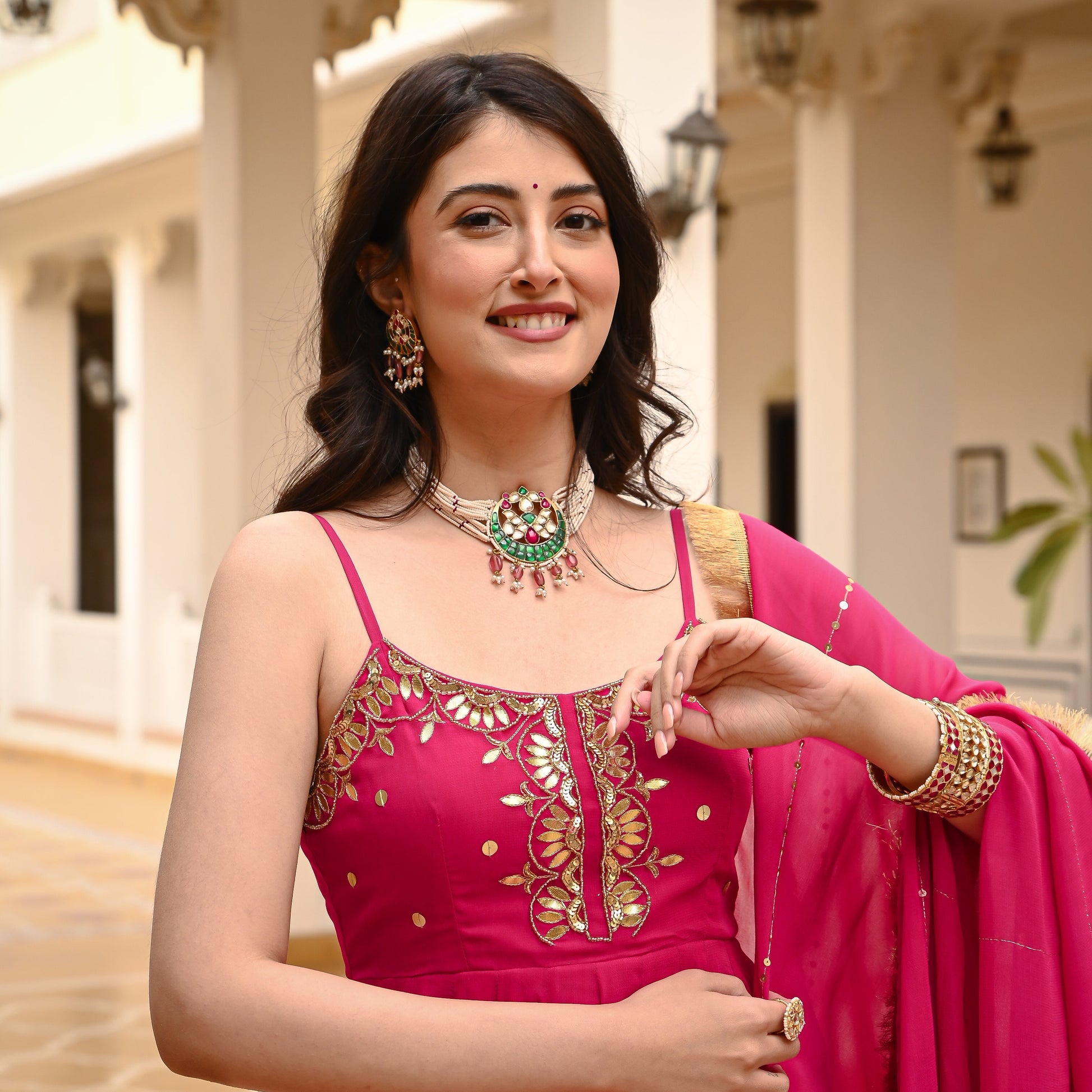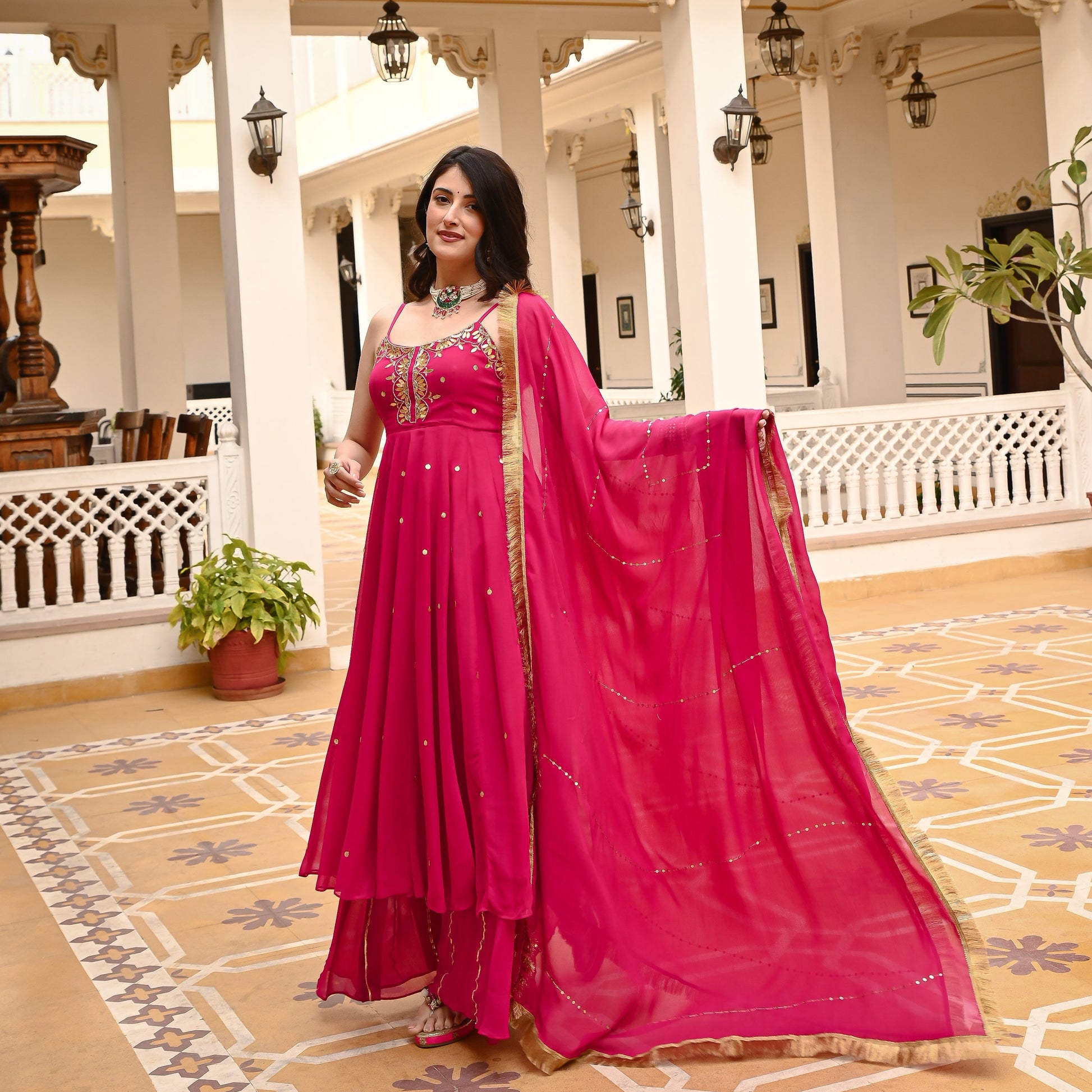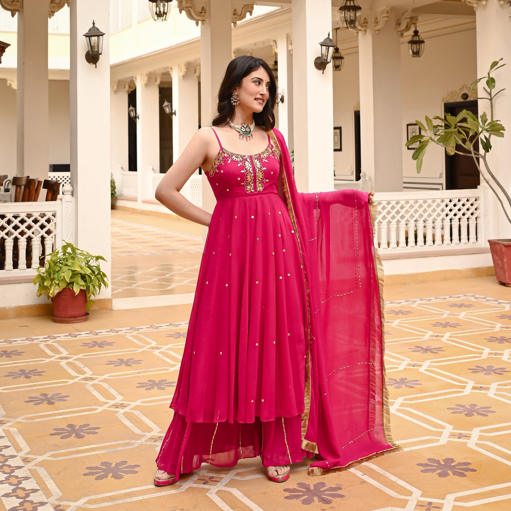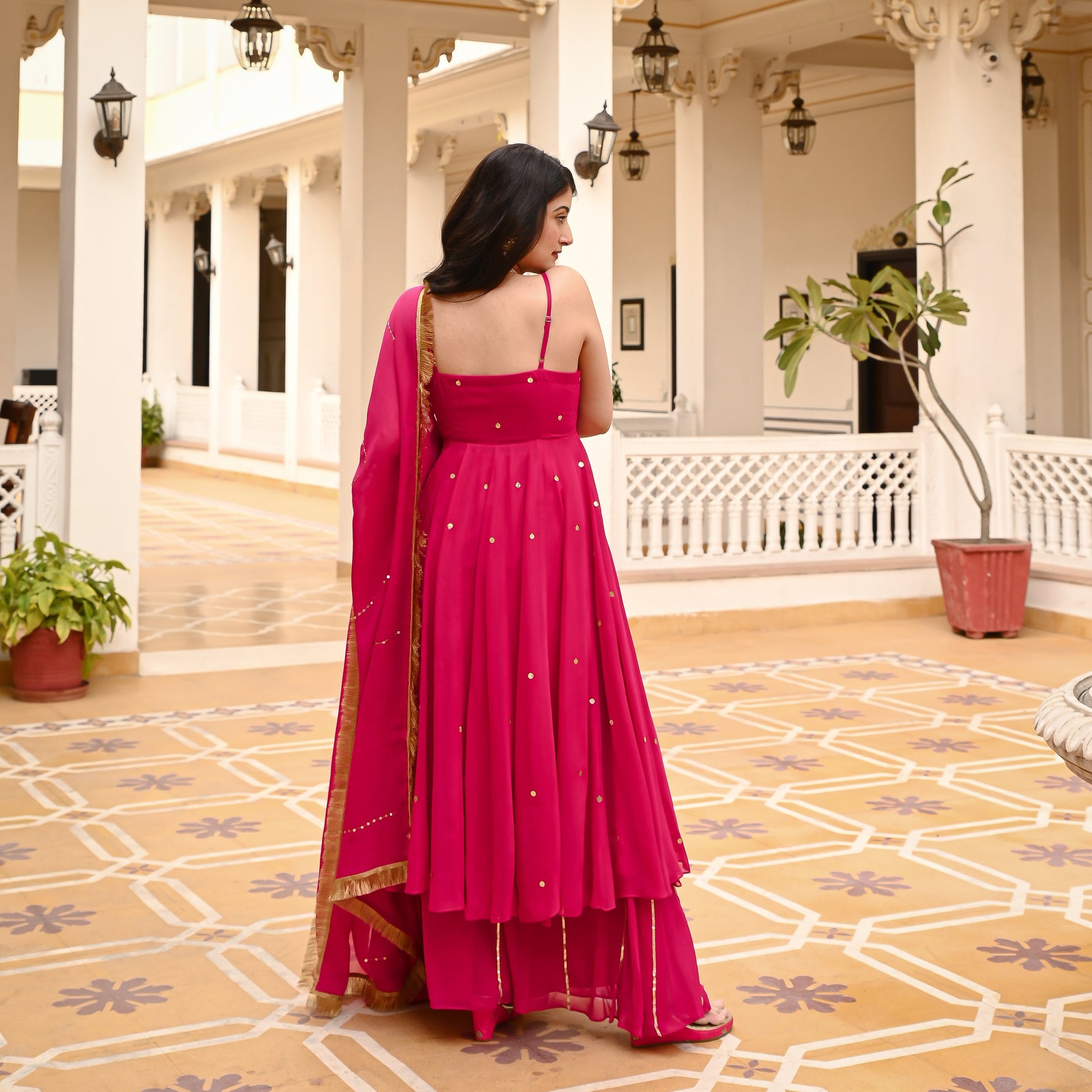 Step into a realm of elegance and tradition with our enchanting Shagan Suit Set. The striking pink hue beautifully complements the intricate Gold gota patti detailing adorning the yoke of the strappy kurta, while sequin embellishments cascade down the flare, adding a touch of glamour. Paired harmoniously with a matching sharara featuring delicate gota lace detailing, and a dupatta adorned with sequin embellishments and fringe lace on the edges, this ensemble is a testament to timeless style. Whether it's a festive celebration or a special occasion, the Shagan Suit Set exudes grace and sophistication, making every moment truly memorable.